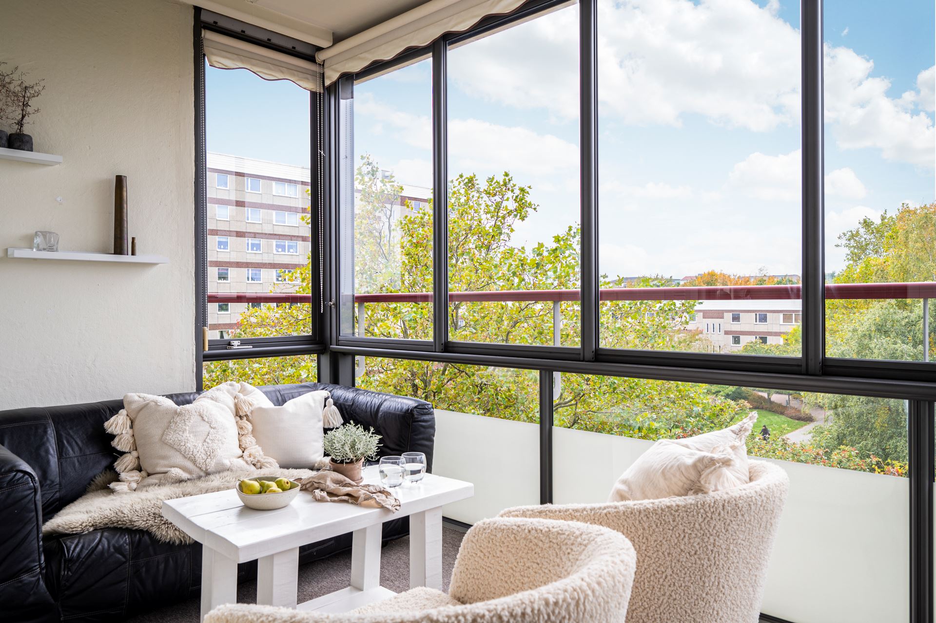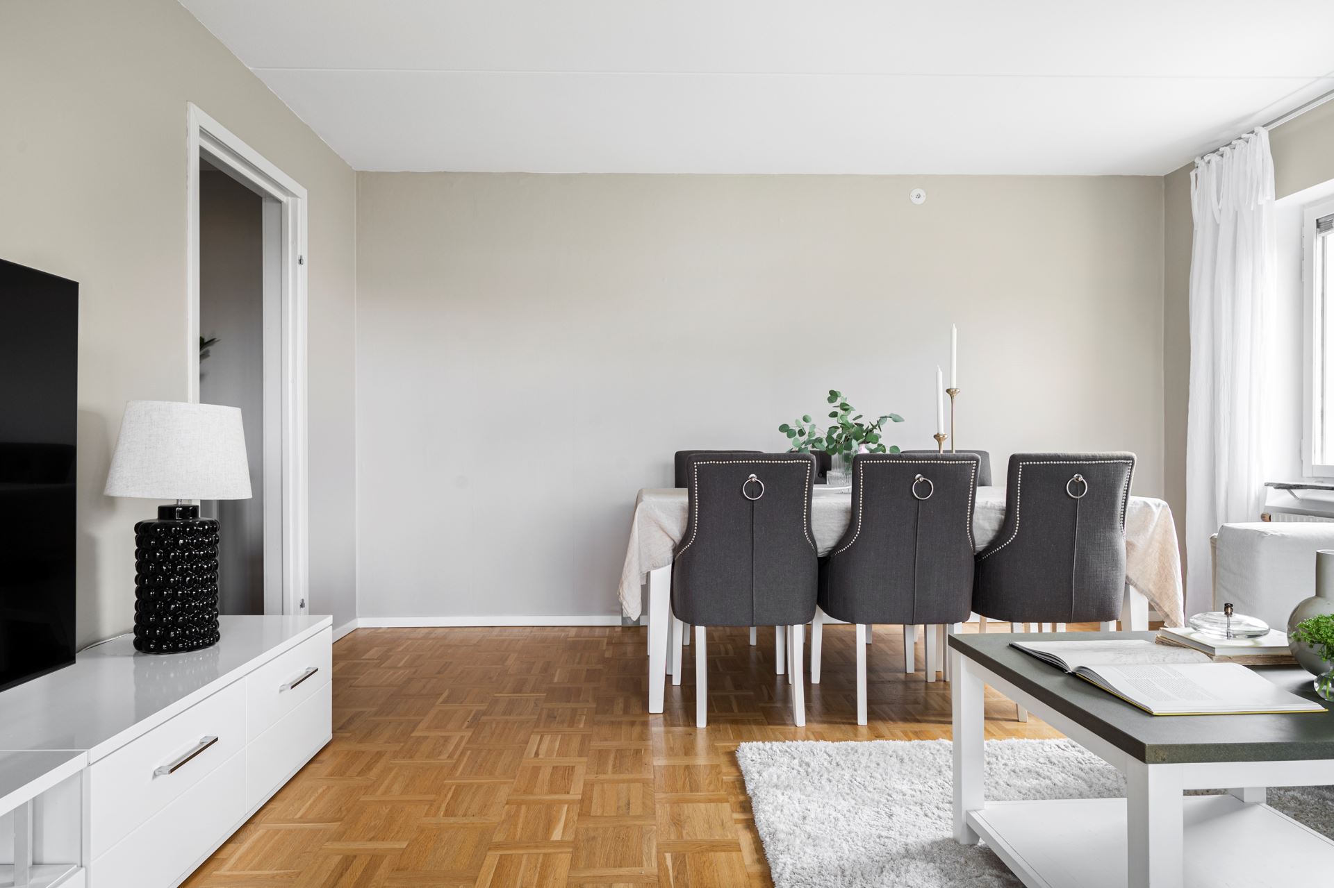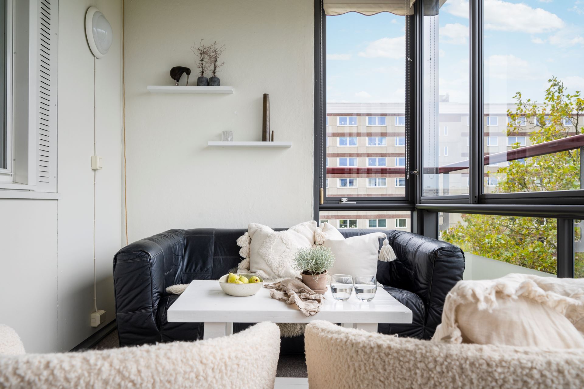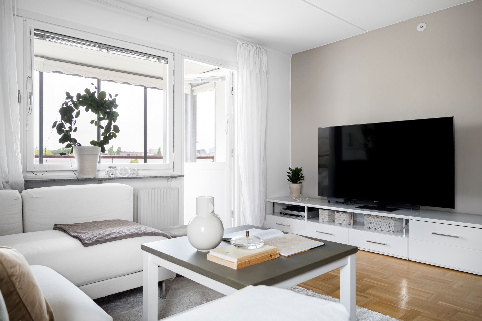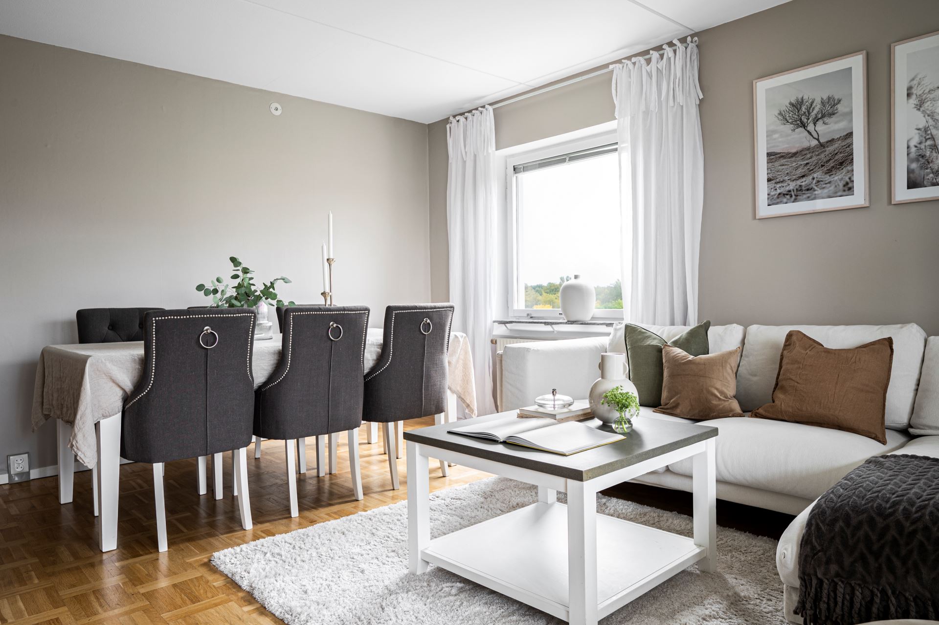 Lägenheten öppnar vidare upp med ljus och rymd tack vare det generösa ljusinsläppet från rummets tilltagna fönster och balkong. Väggarna är målade i beiget och på golv vilar fint parkett. Rummet är rymligt till storleken och här finns gott om plats för större soffgrupp. Härifrån når man även bostadens stora inglasade balkong som blir en härlig förlängning av vardagsrummet under sommartid och här ryms gott om plats för utemöblemang för att avnjuta eftermiddags - och kvällssolen.