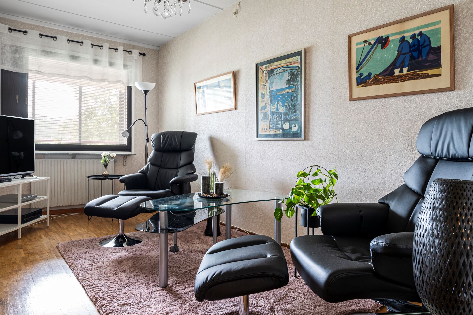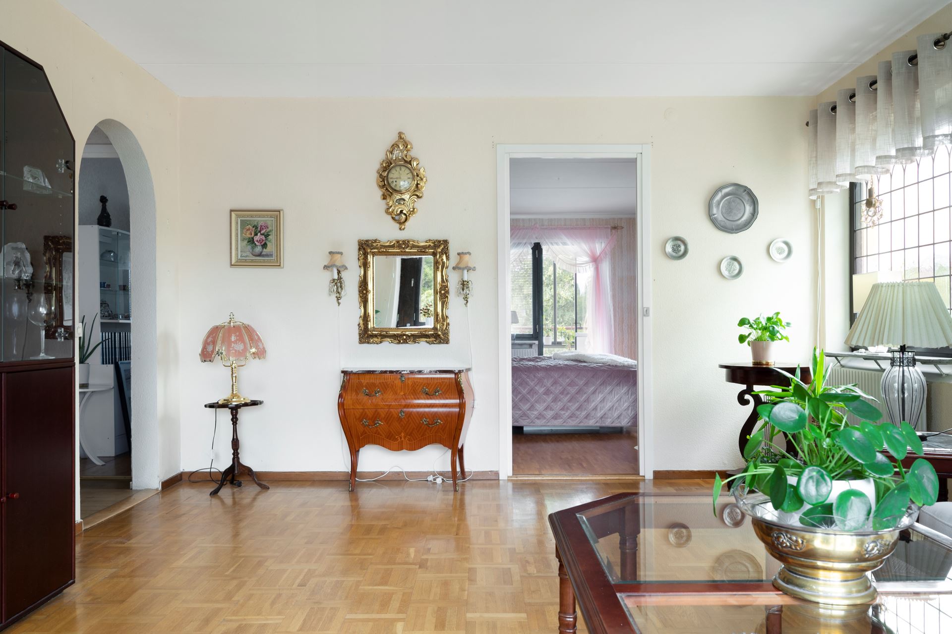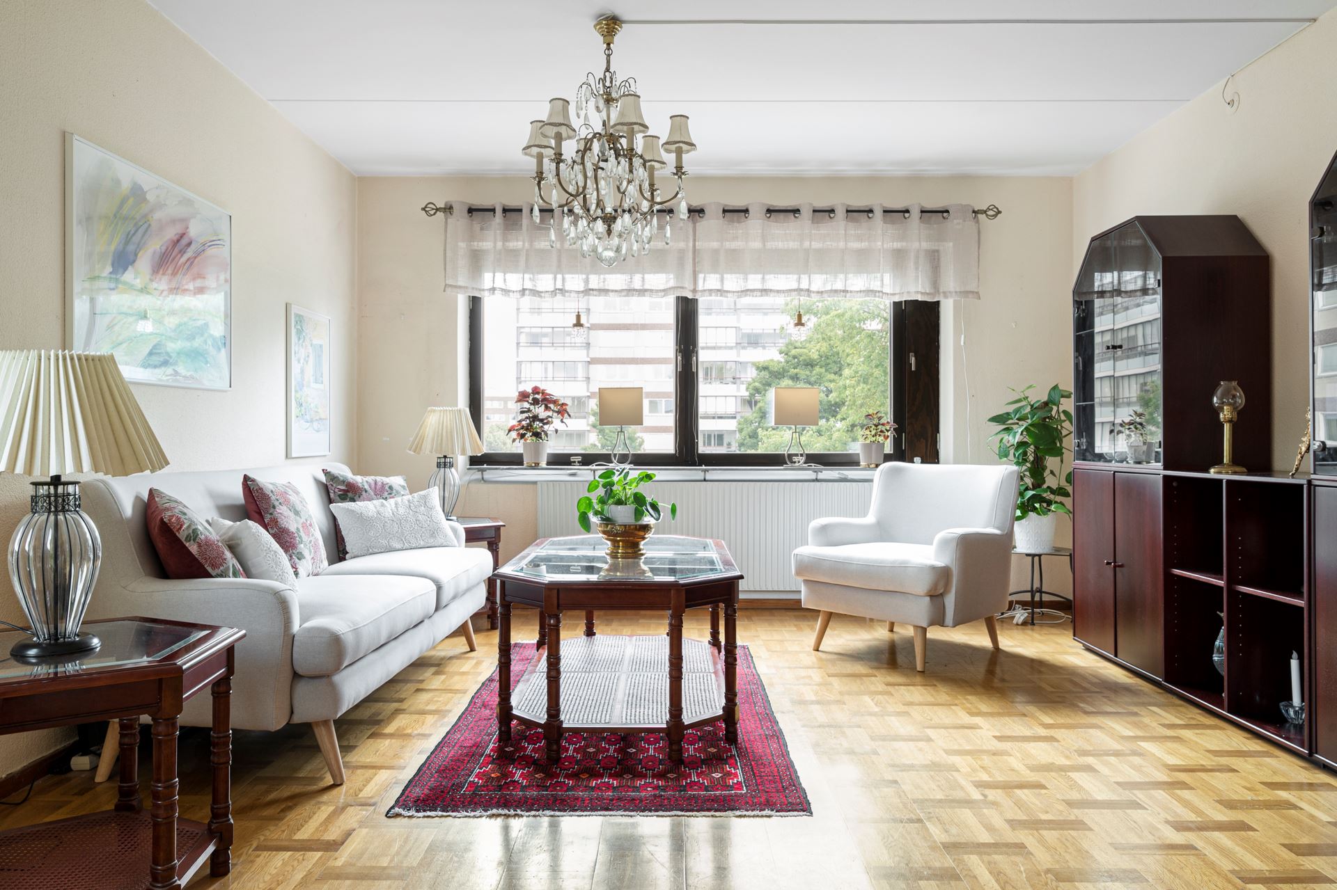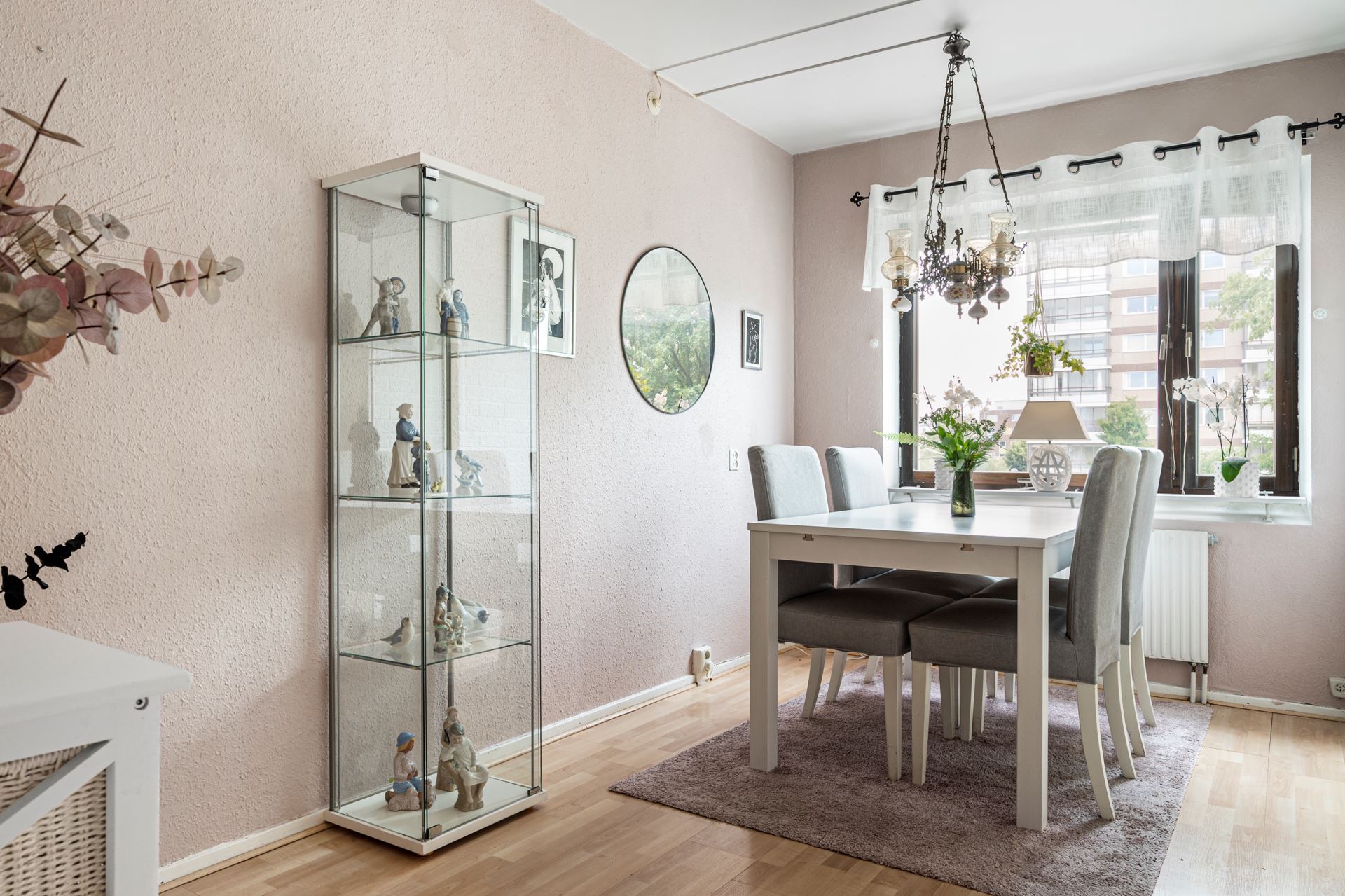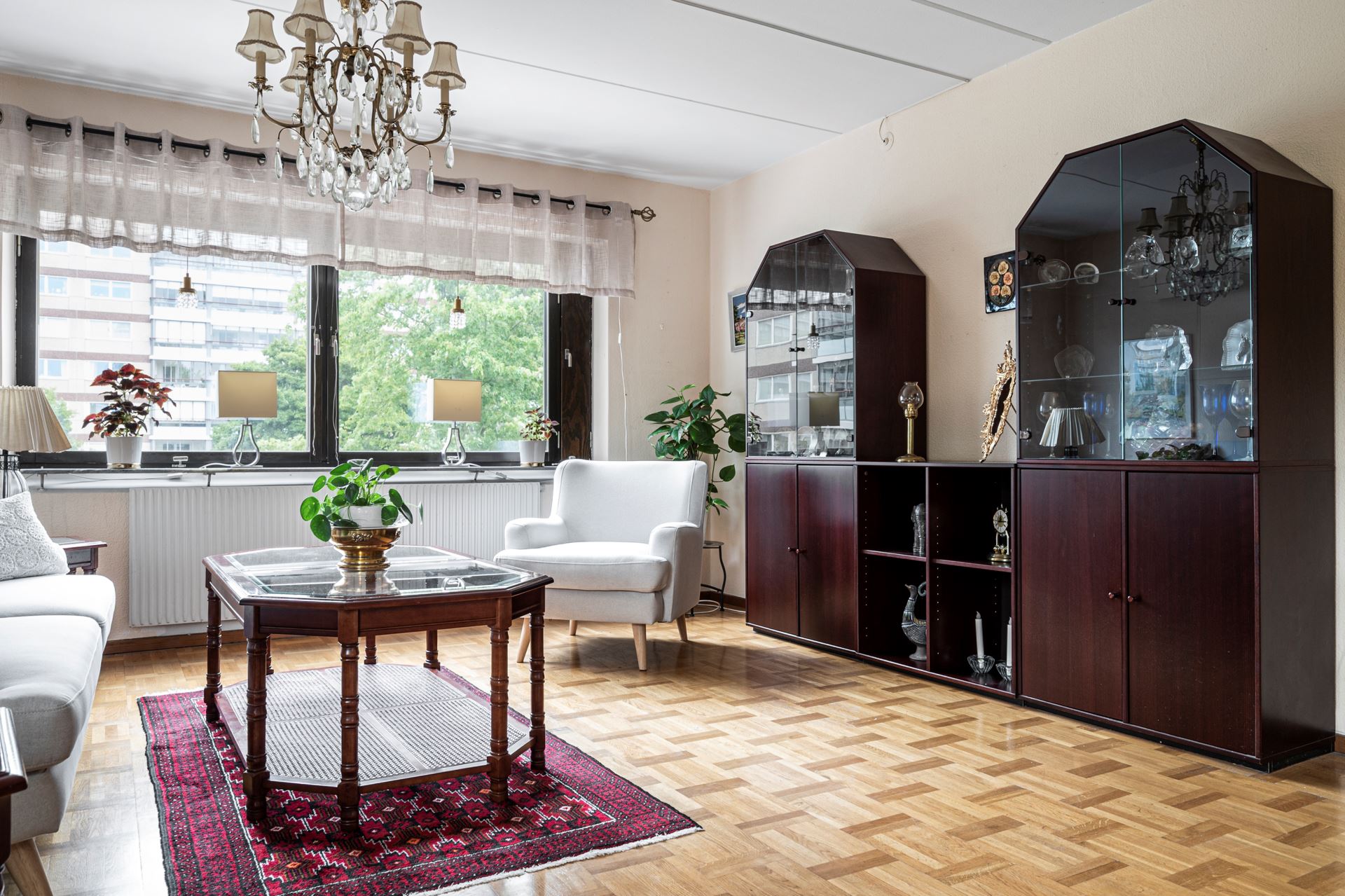 Vidare in når vi lägenhetens rymliga vardagsrum som skapar en trevlig social atmosfär och ger rummet utmärkta förutsättningar för möblering. Här finns plats för att möblera med större soffgrupp och tillhörande möbler. Ljusinsläppet är rikligt från det stora fönsterparti ifrån två väderstreck. Här ligger fint parkettgolv tillsammans med beigea väggar.