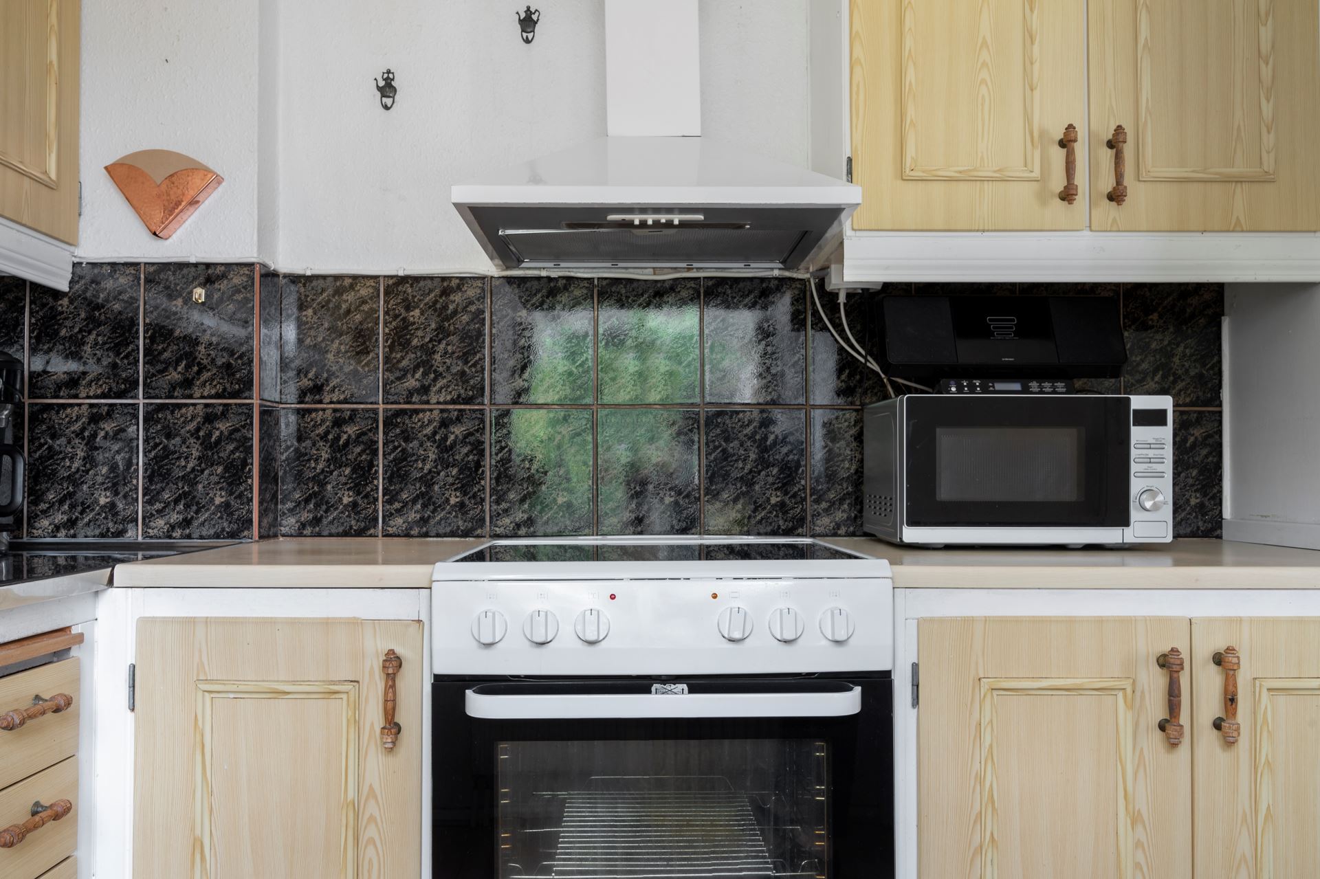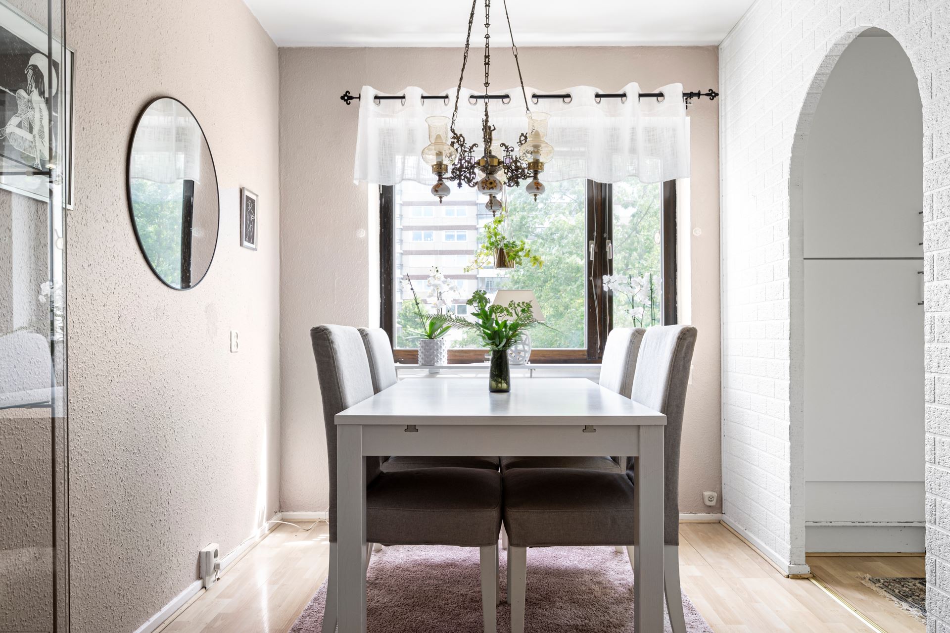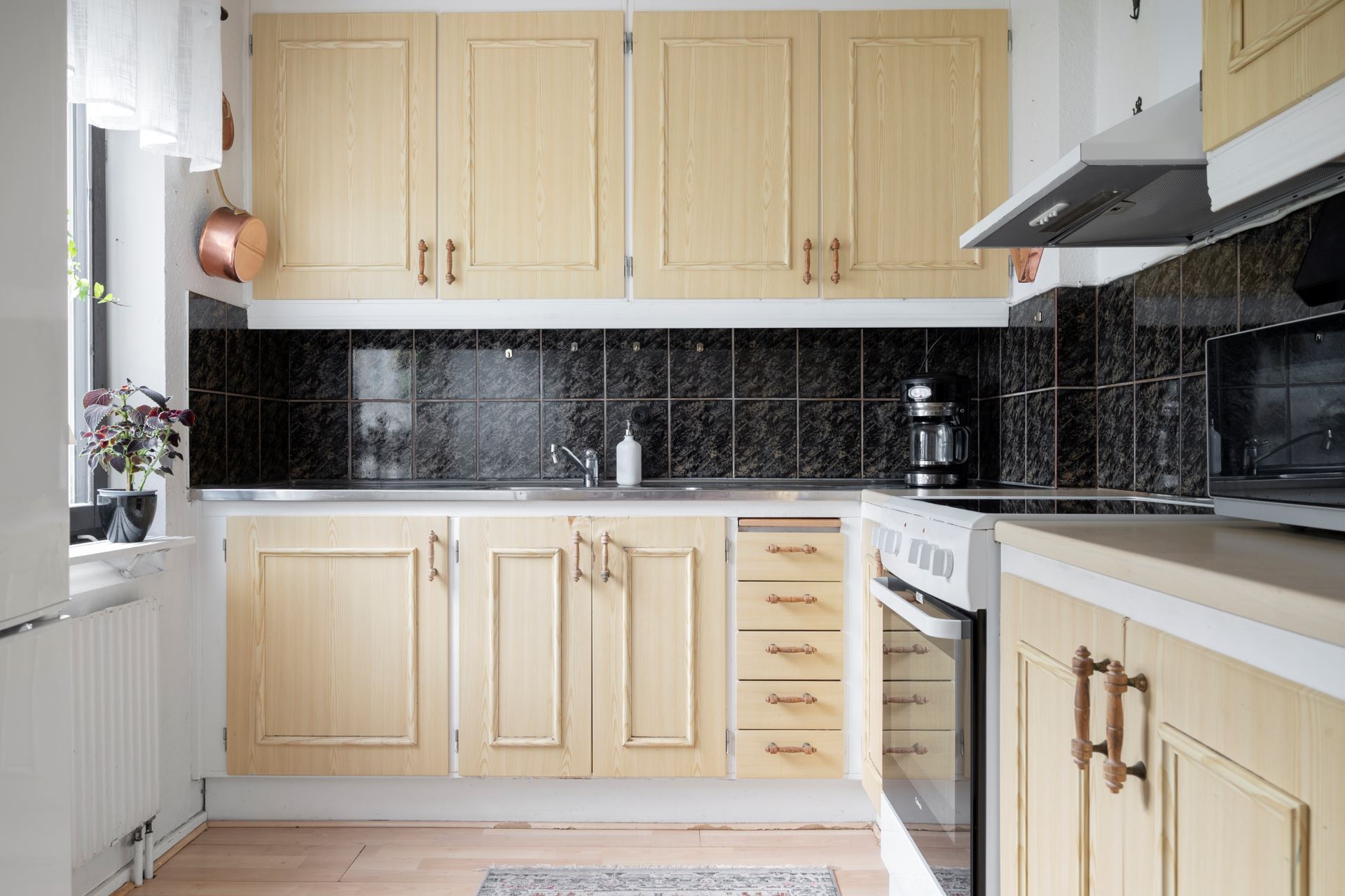 Vi tar oss in till köket. Här finns utmärkt med förvaringsutrymme bakom ljusa skåpsluckor och gott om plats för arbetsytor finns ovanför bänkskiva. Köket är utrustat med kombinerad kyl och frys, ugn, spishäll och köksfläkt. Rummet ger utrymme för större matplats mot fönsterparti som tillför härligt ljusinsläpp.