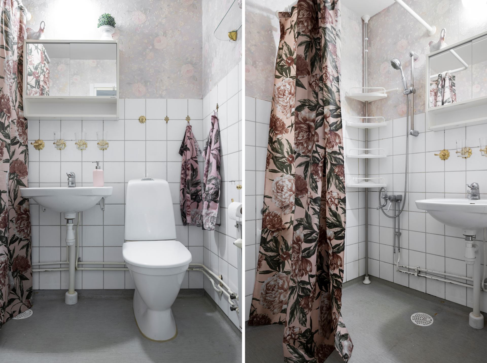 Badrummet är utrustat med dusch, wc, handfat med spegelskåp ovanför. Plastmatta på golv och halvkaklade väggar med tapet ovanför.