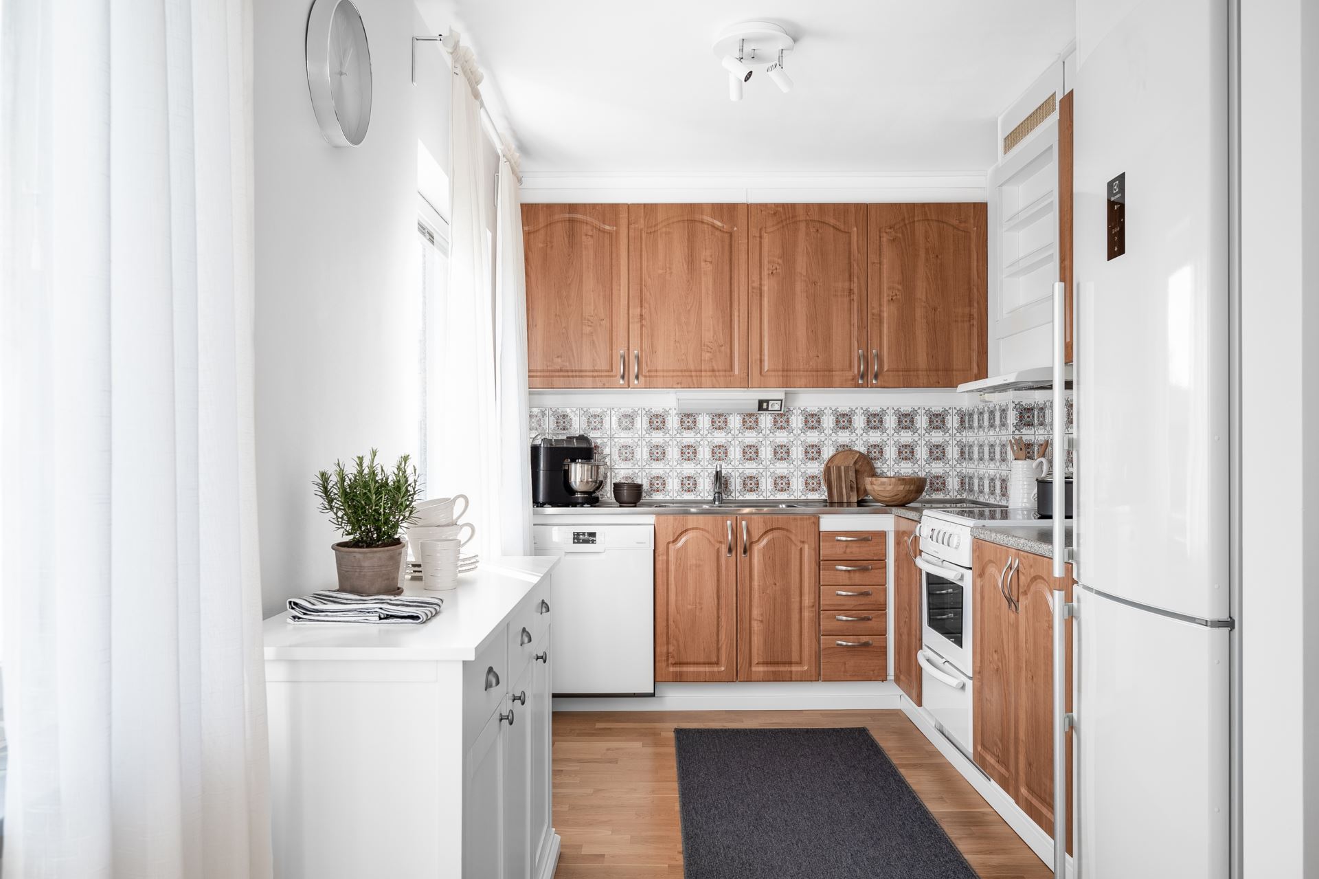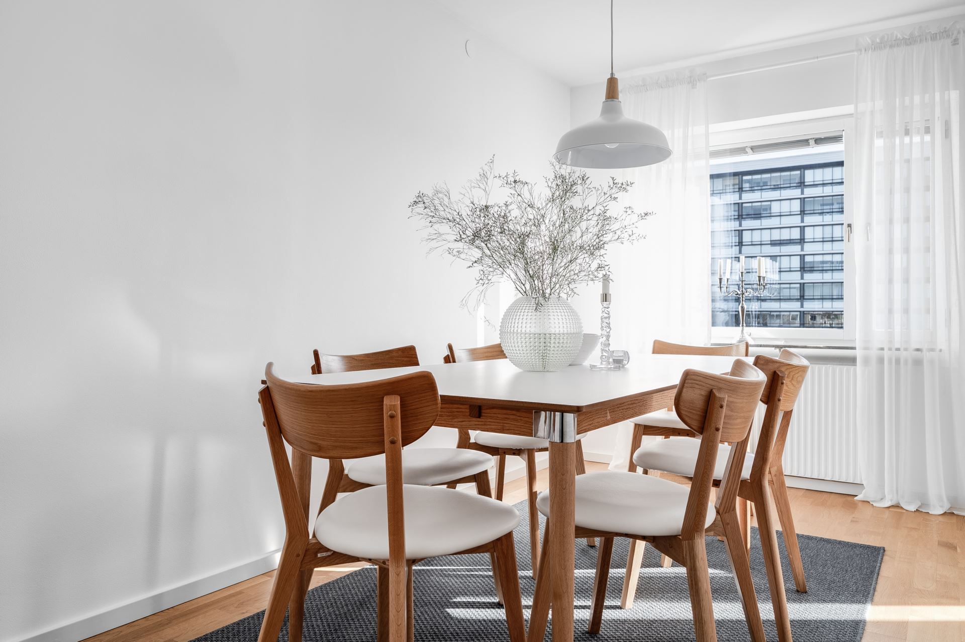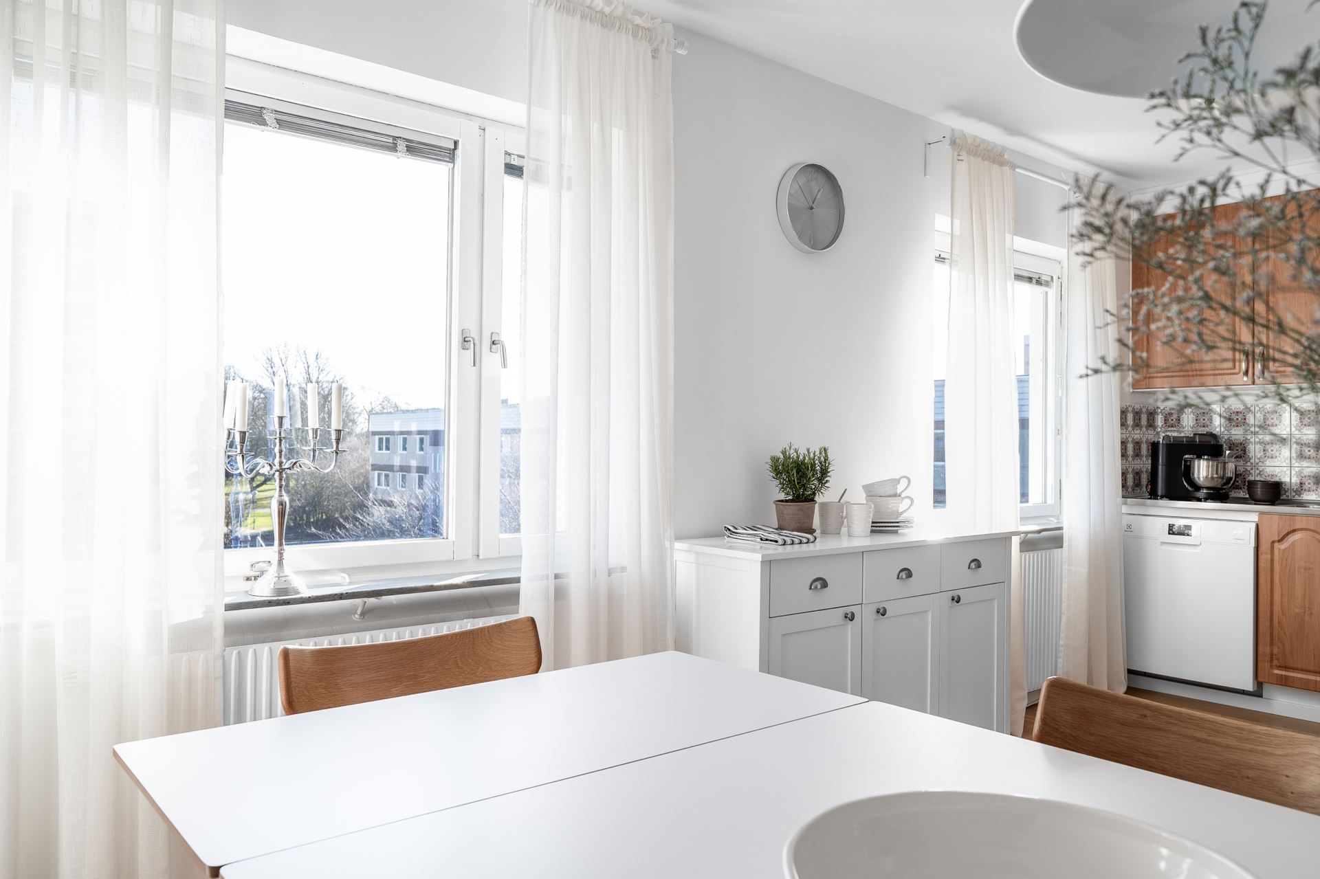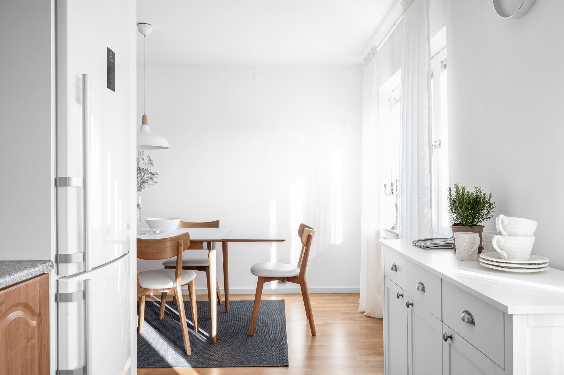 Vidare öppnar lägenheten upp till ett stilrent kök, utmärkt med förvaringsutrymme bakom köksluckor i både under- och överskåp. Här finns även bra med arbetsytor. Köket är utrustat med kyl/frys, mikrovågsugn, spishäll/ugn, köksfläkt och diskmaskin. I anslutning till köket finns plats för att möblera med större matbord mot fönsterparti med extra ljusinsläpp.