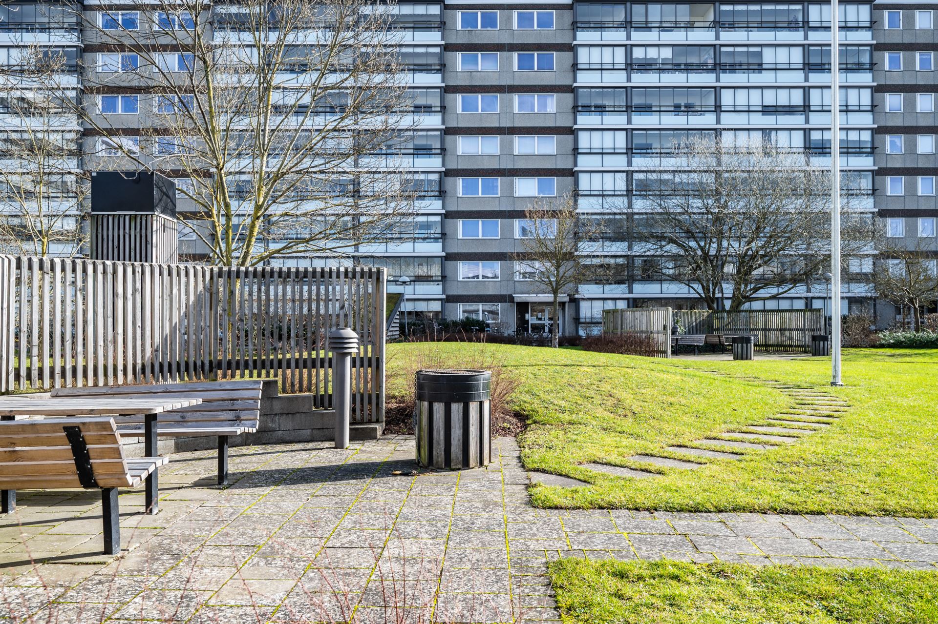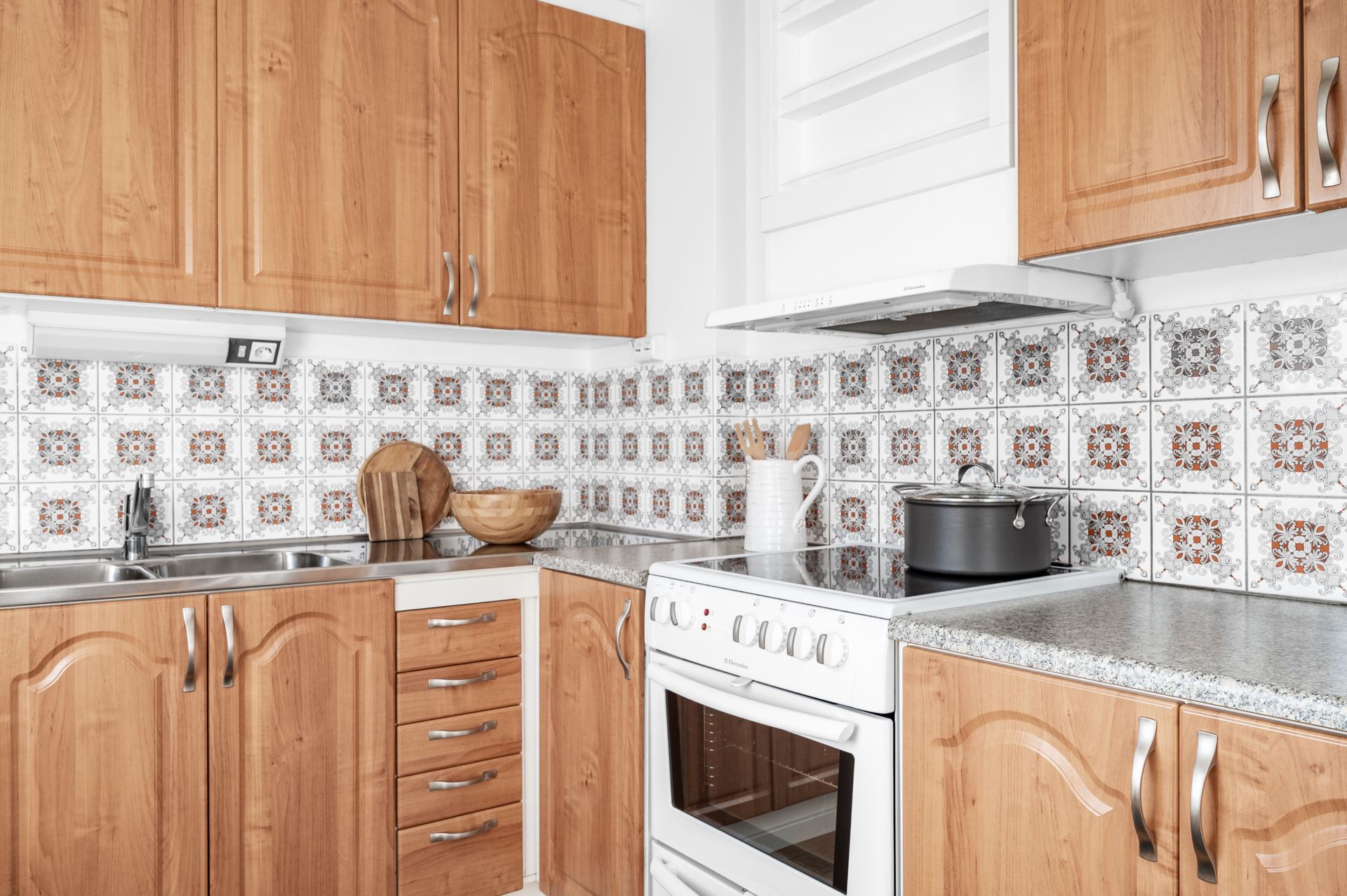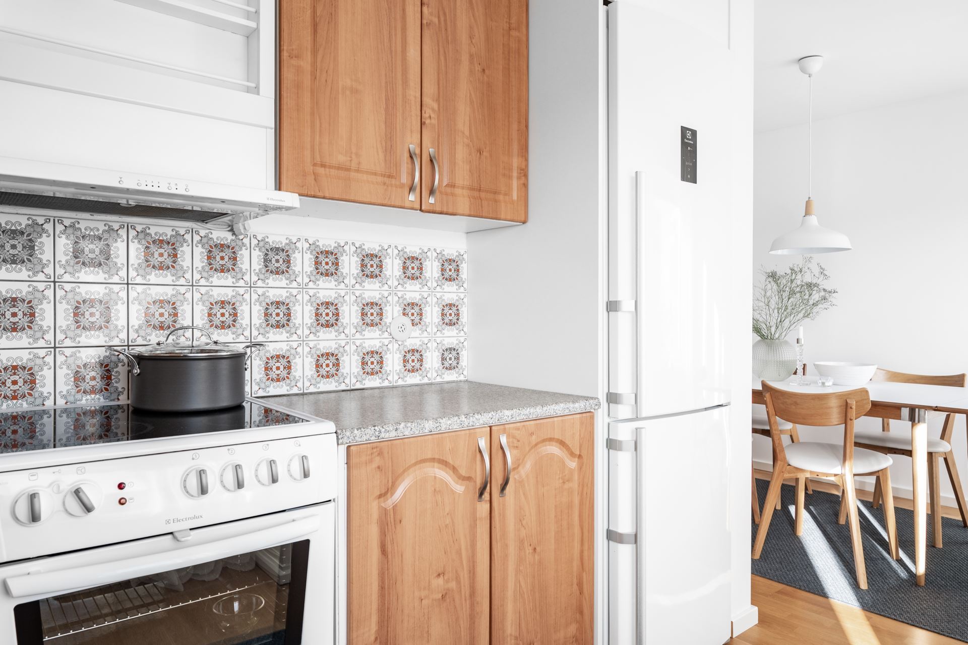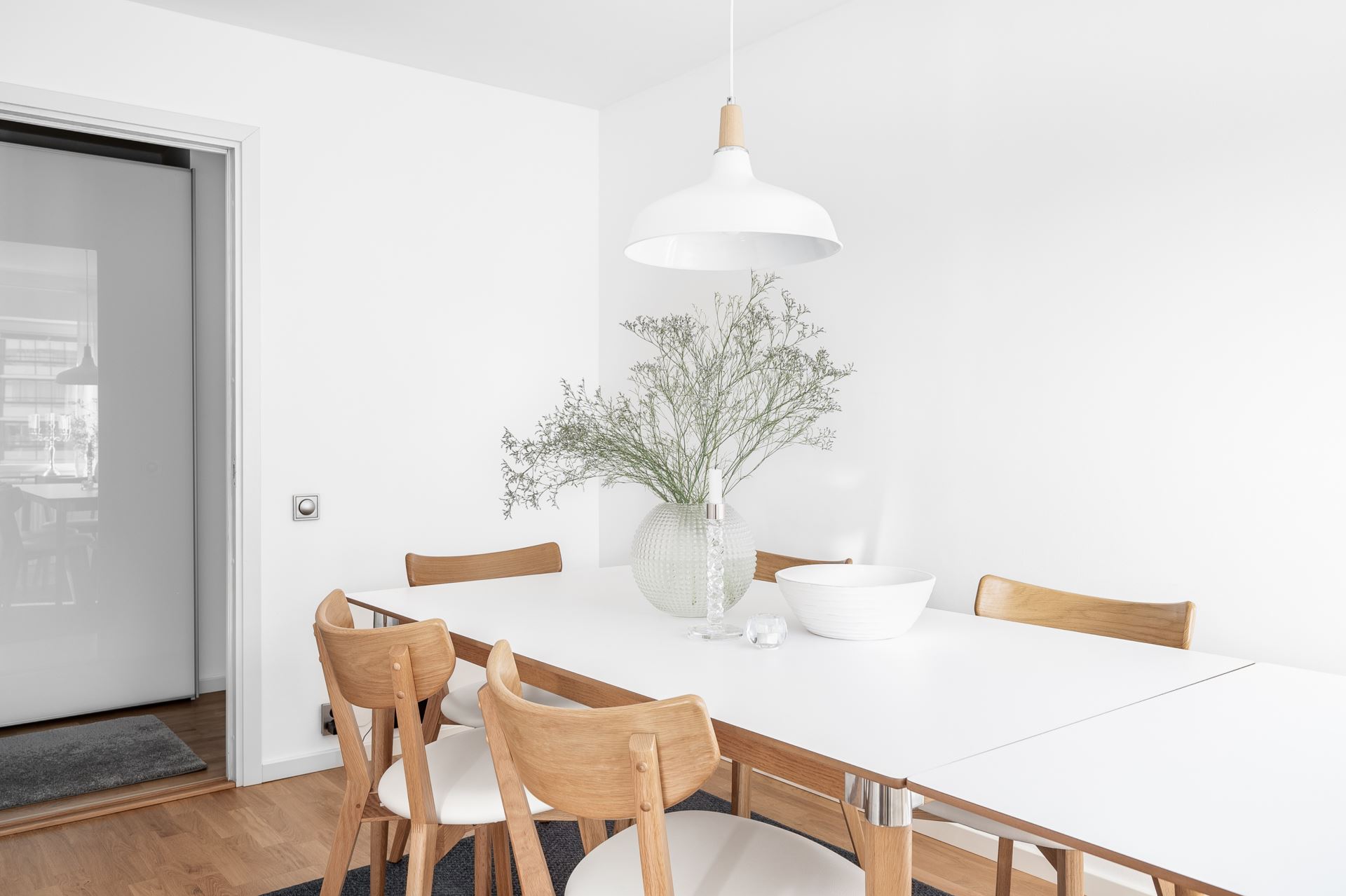 Vidare öppnar lägenheten upp till ett stilrent kök, utmärkt med förvaringsutrymme bakom köksluckor i både under- och överskåp. Här finns även bra med arbetsytor. Köket är utrustat med kyl/frys, mikrovågsugn, spishäll/ugn, köksfläkt och diskmaskin. I anslutning till köket finns plats för att möblera med större matbord mot fönsterparti med extra ljusinsläpp.