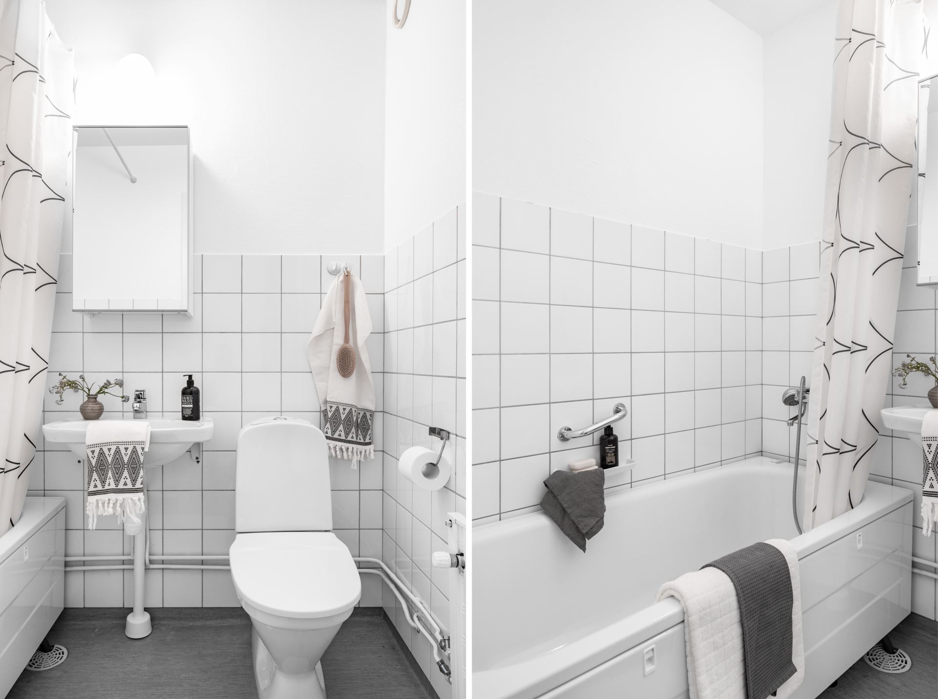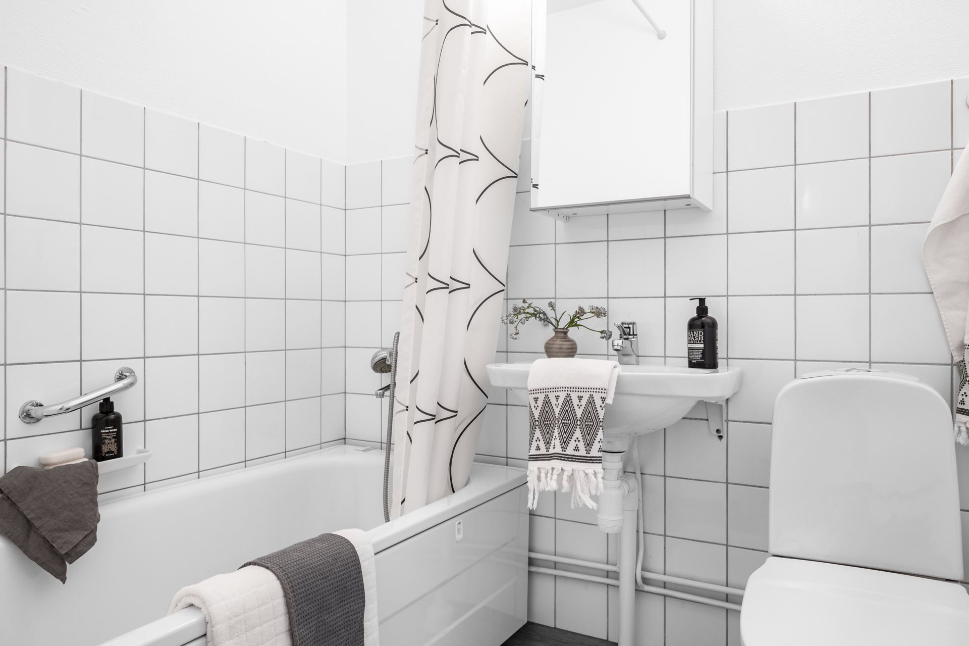 Badrummet är utrustat med dusch, wc, handfat med spegelskåp ovanför. Plastmatta på golv och halvkaklade väggar.