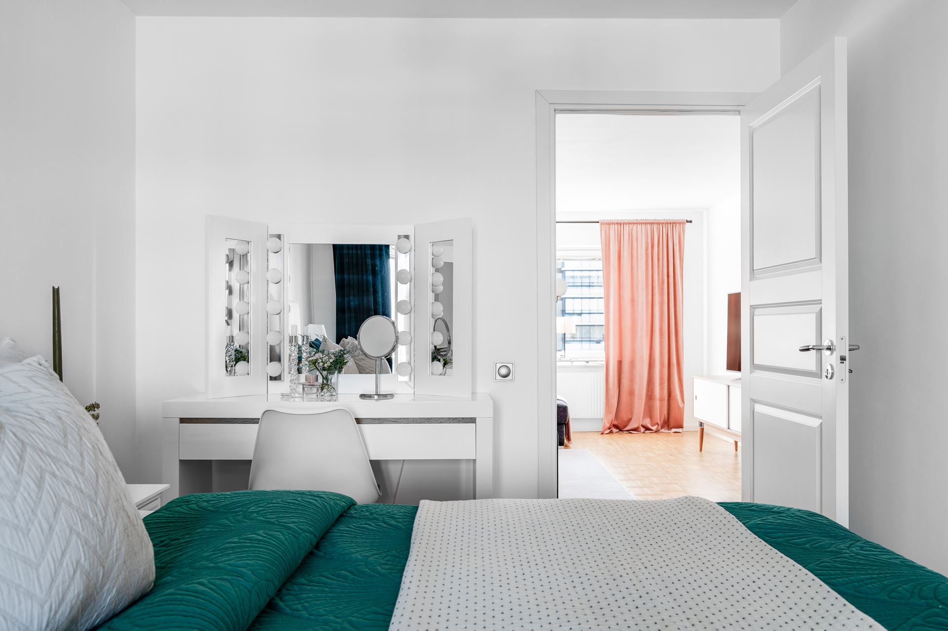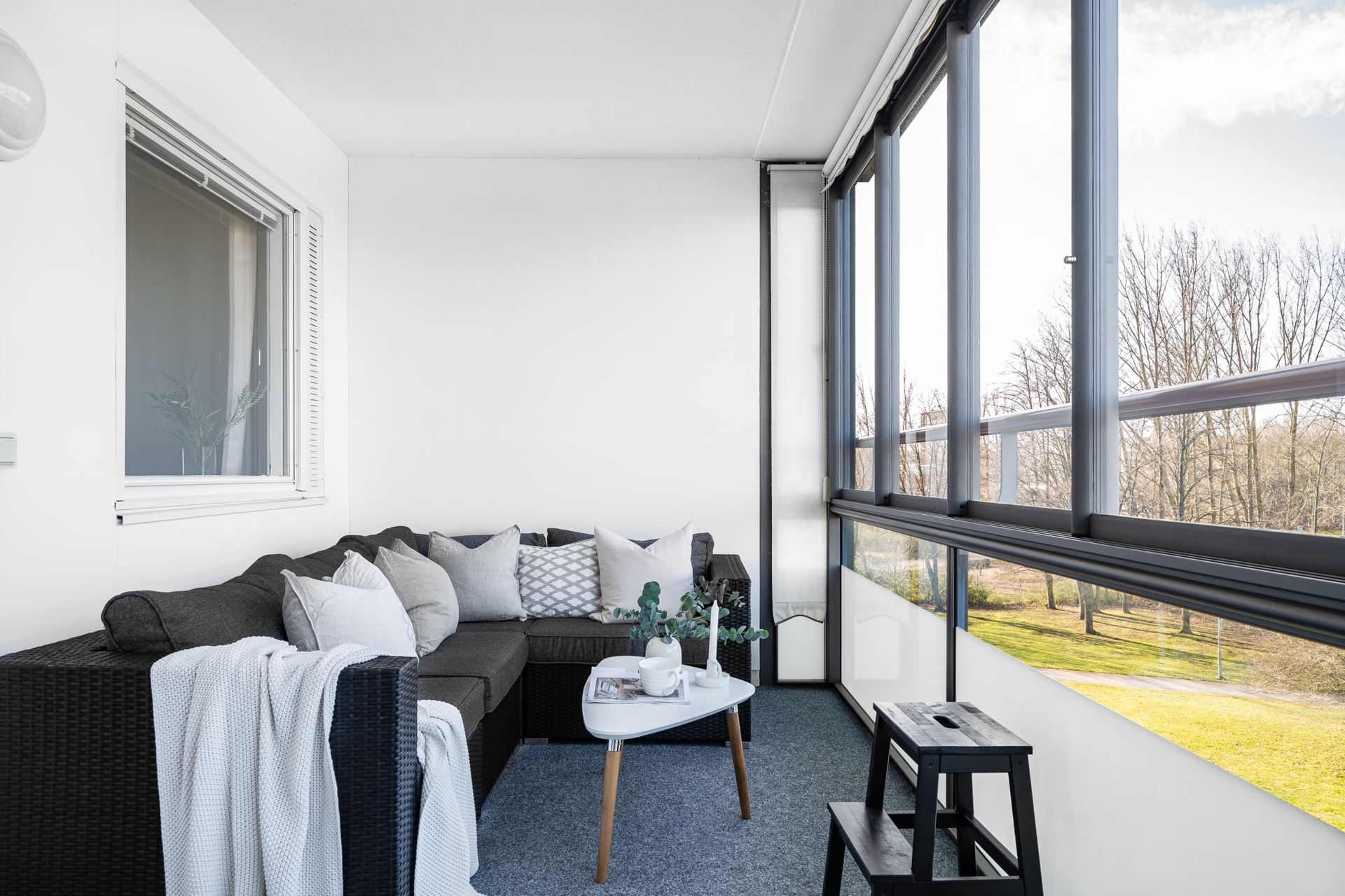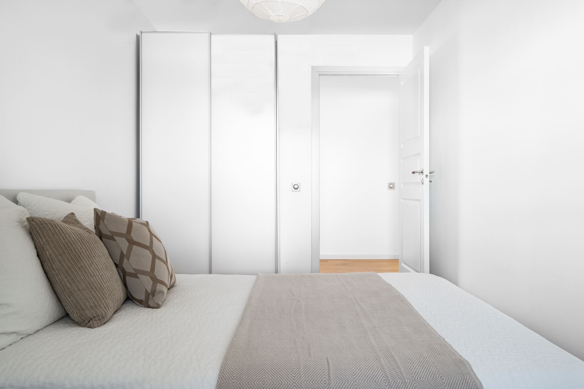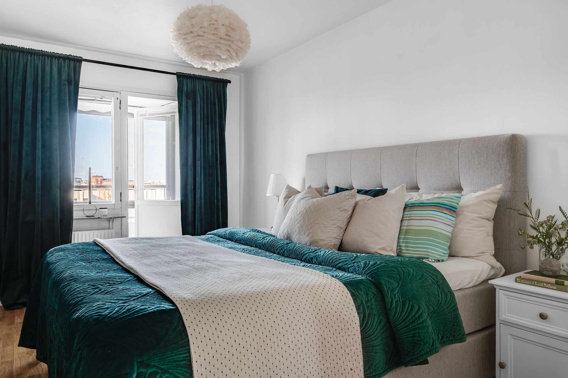 Sovrum 1: Väl tilltaget sovrum, här ryms dubbelsäng, sängbord och tillhörande möblemang efter önskemål. Härifrån når vi ut till den fantastiska balkongen i härligt västerläge. Den otroligt rymliga inglasade balkongen är perfekt som extra sällskapsyta, och här finns gott om plats för att möblera efter behov.