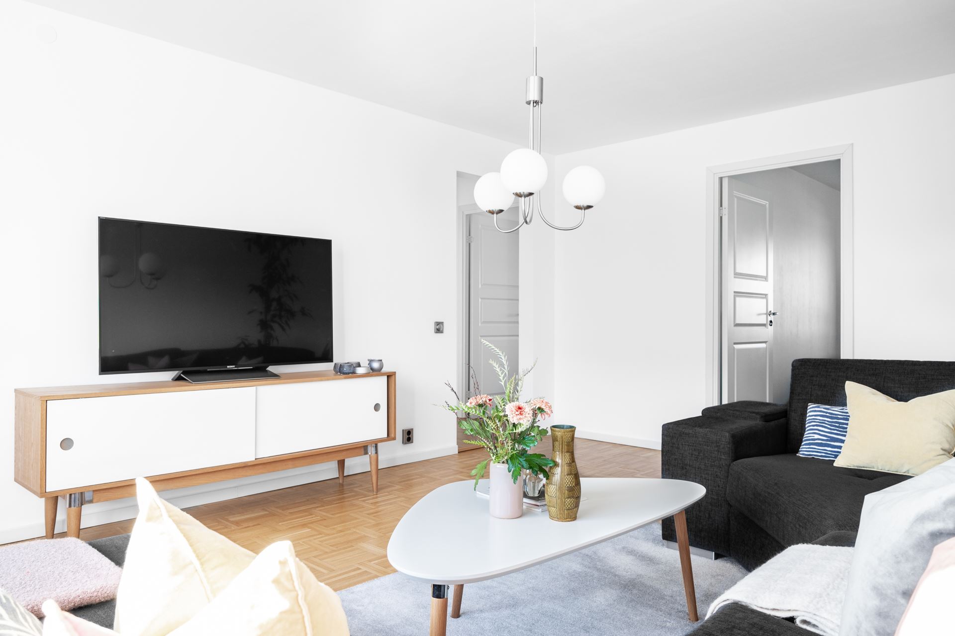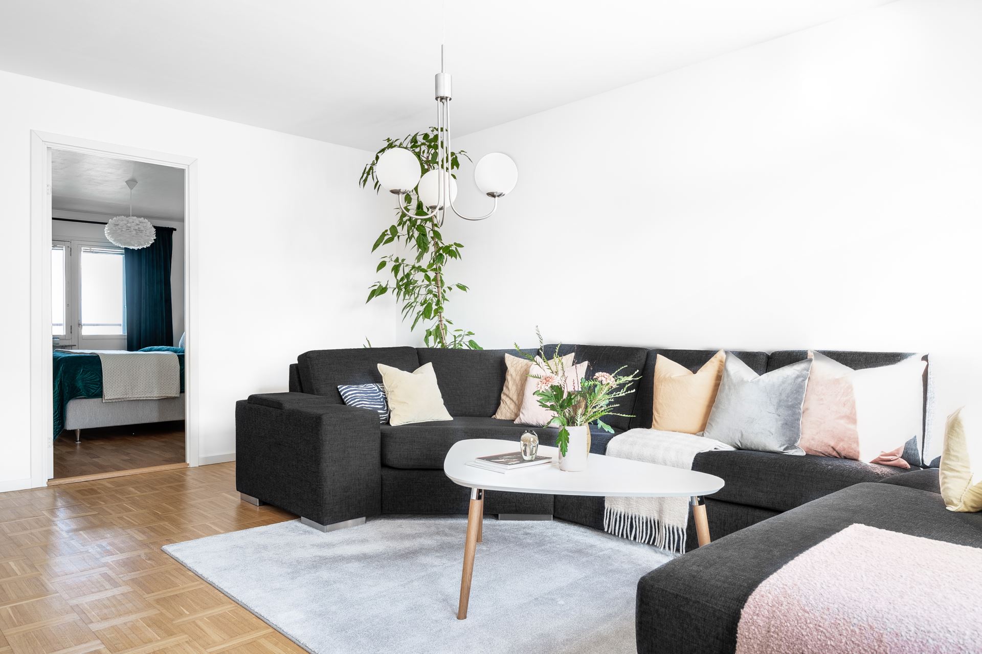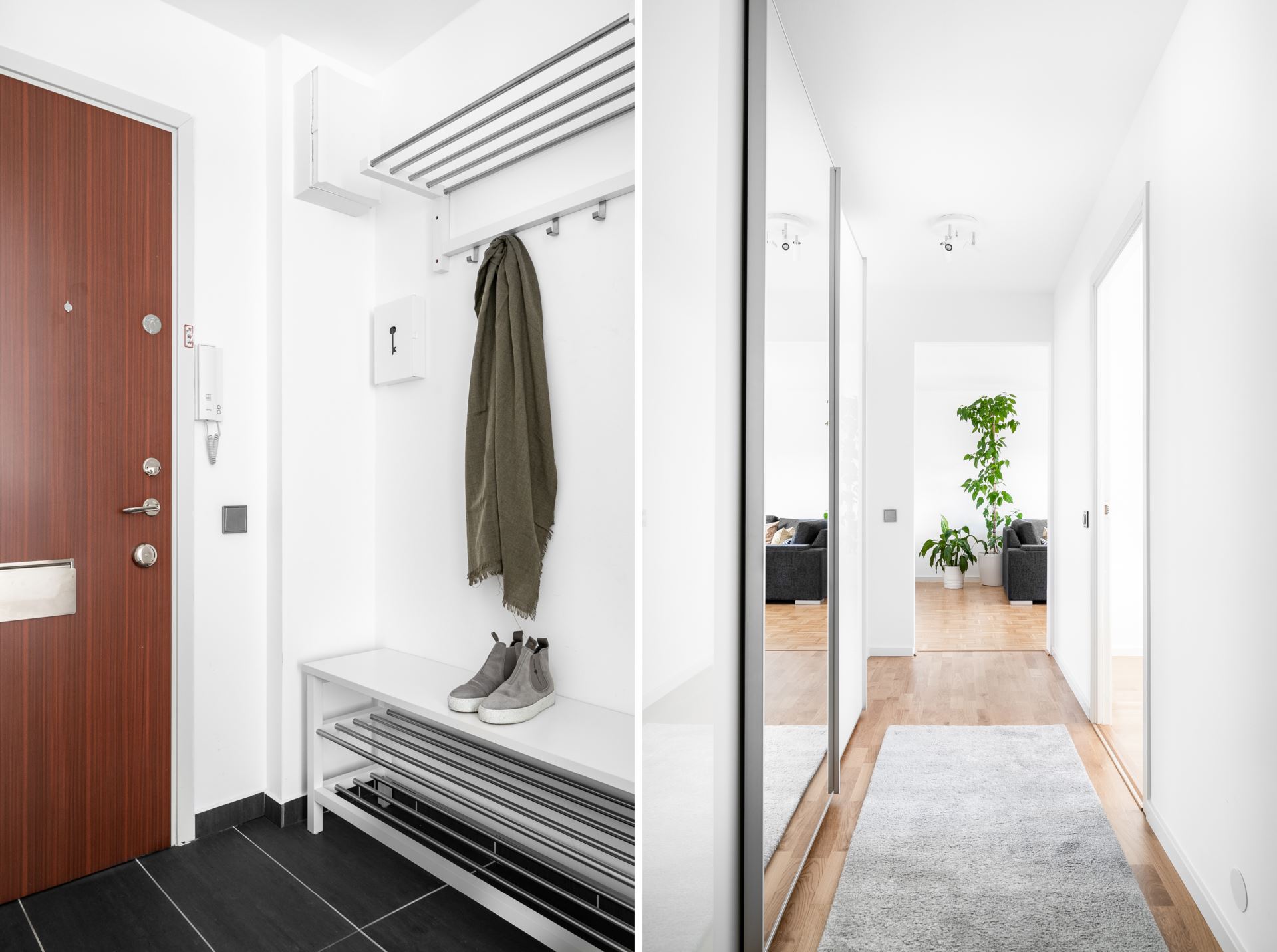 På tredje våningen välkomnas denna otroligt välplanerade trea som välkomnar med klinkers på golv som sedan övergår till snyggt parkett i kombination med sobert vita väggar i hela bostaden. På vänster sida i hallen finns gott om plats till avhängningsmöjligheter och vidare finns ytterligare förvaringsutrymme bakom skjutdörrsgarderob.