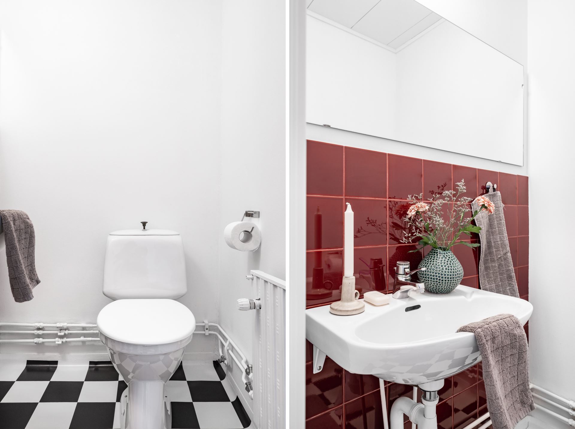 Gästtoalett som är utrustat med wc och handfat med spegel ovanför.