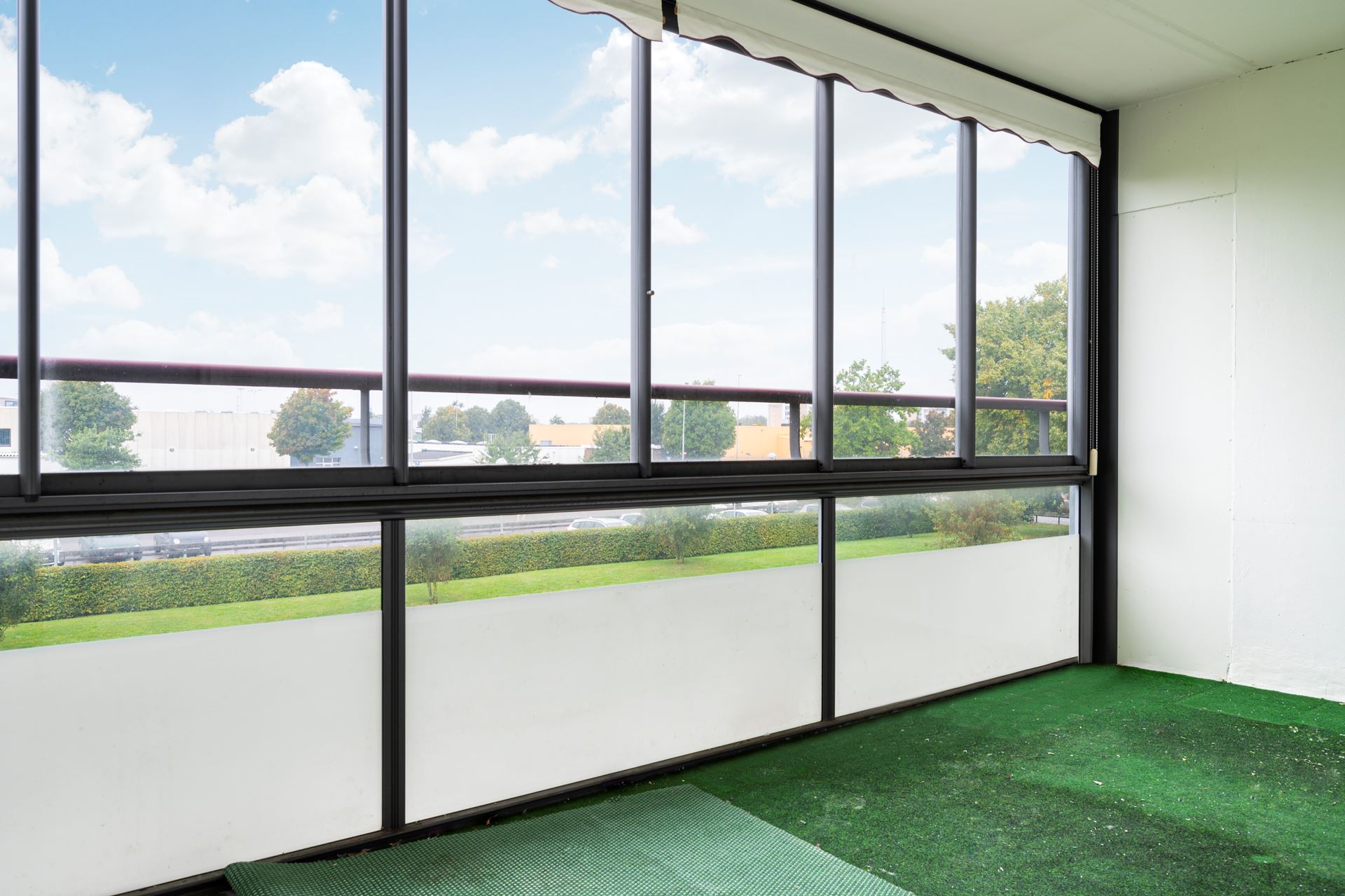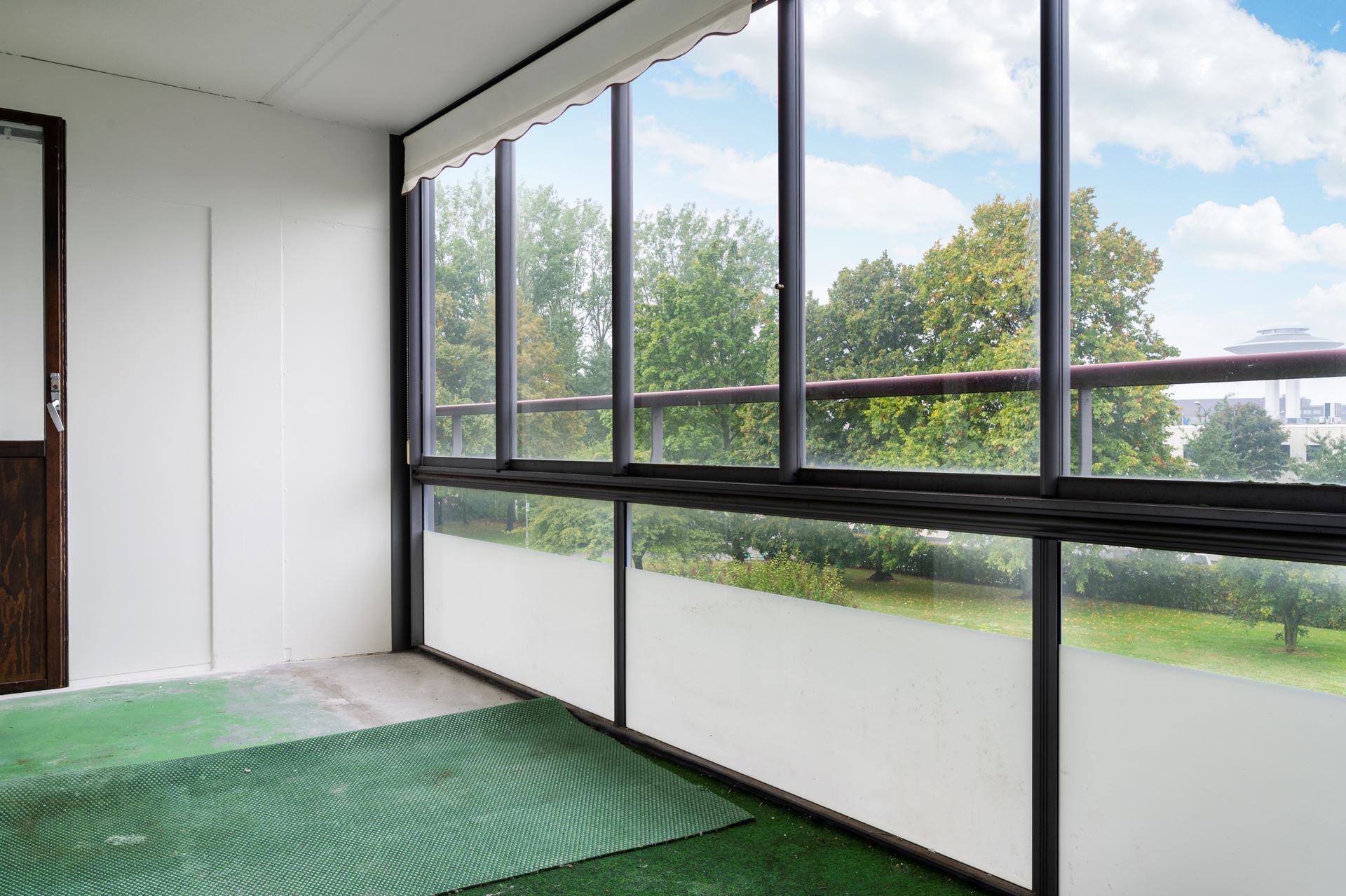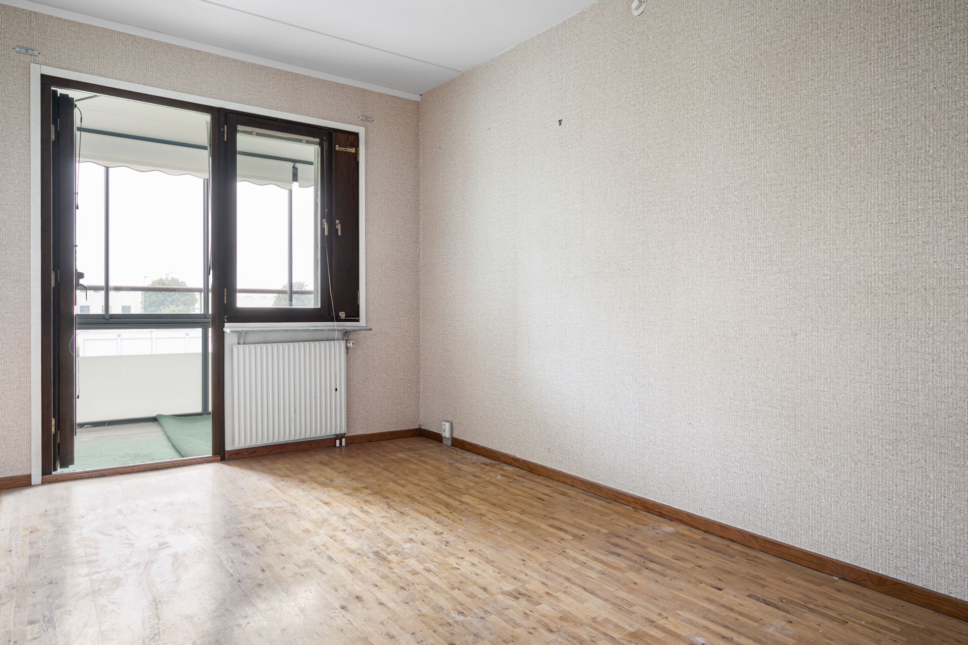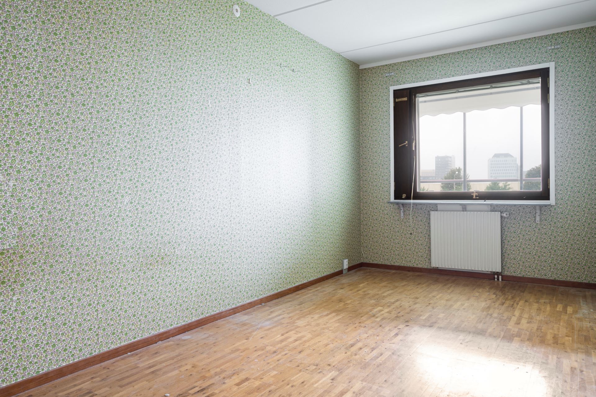 Sovrum 1: Rymligt sovrum med plats för dubbelsäng, sängbord och mer därtill. Stavparkett på golv tillsammans med ljusgröna väggar. Från sovrummet nås den inglasade balkongen i eftertraktat västerläge.