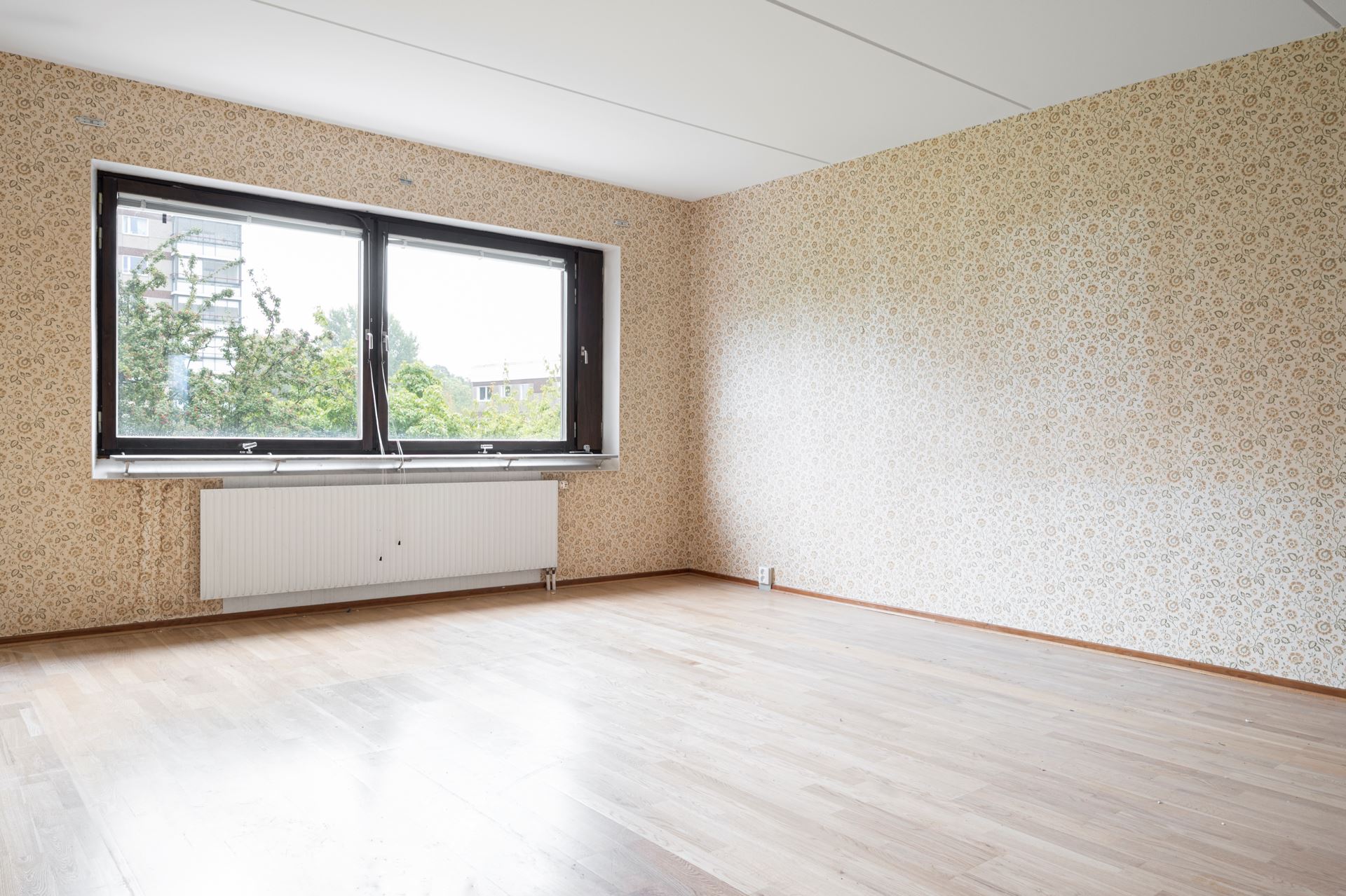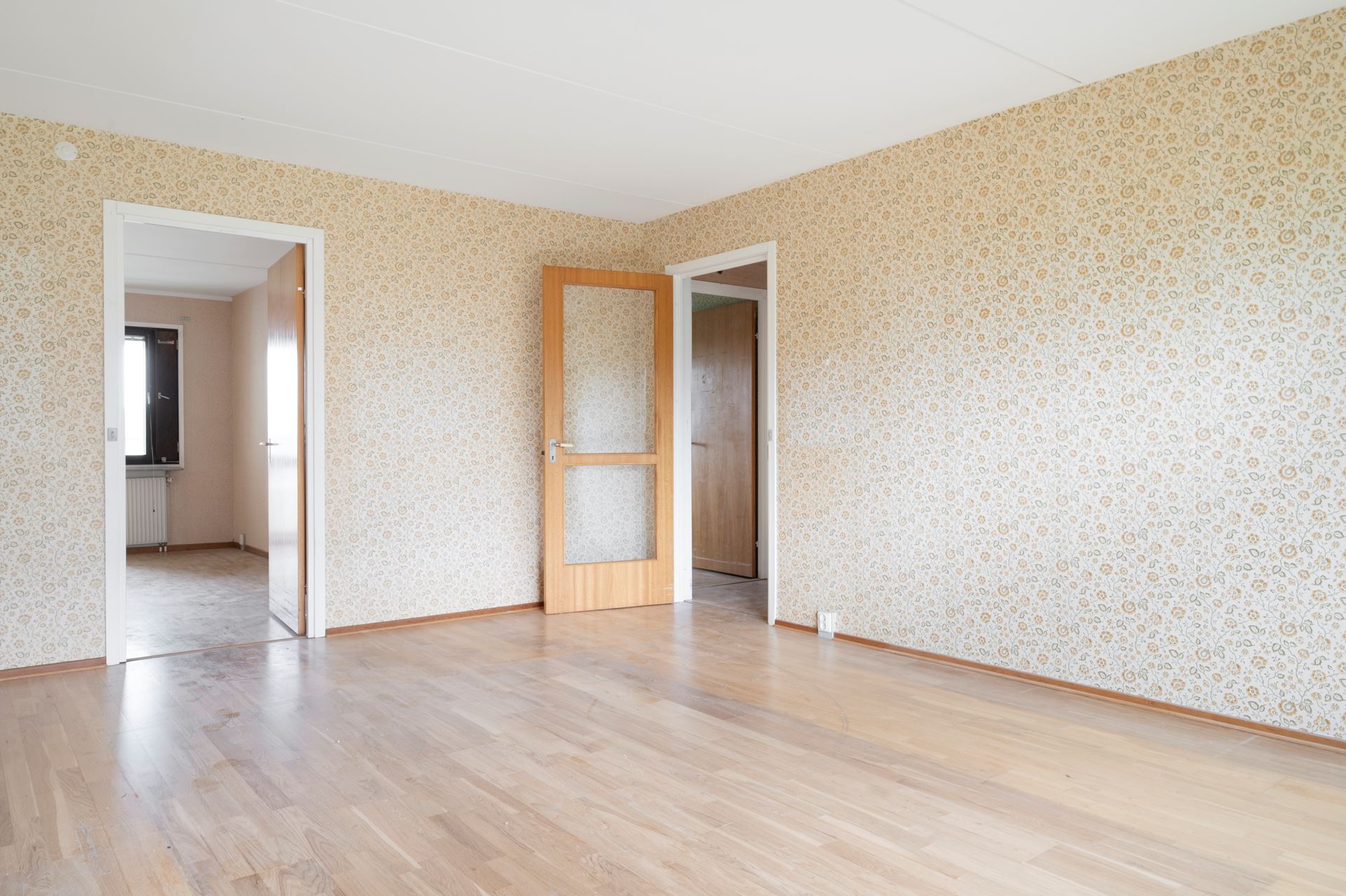 Vidare öppnar vardagsrummet upp med generösa kvadratmeter och här ryms gott om plats för både matbord och soffgrupp. På golvet vilar fint golv tillsammans med ljusa tapeter.