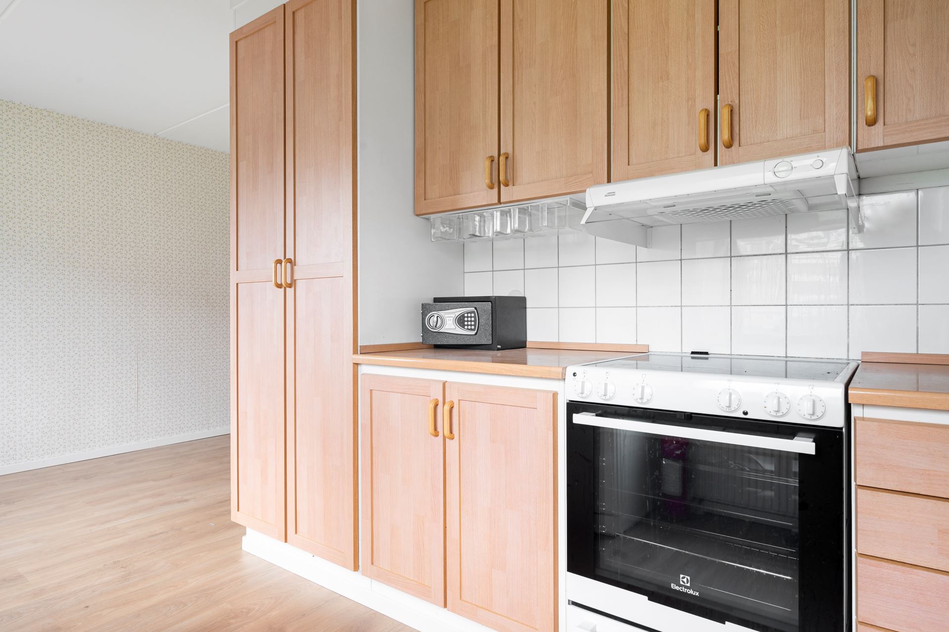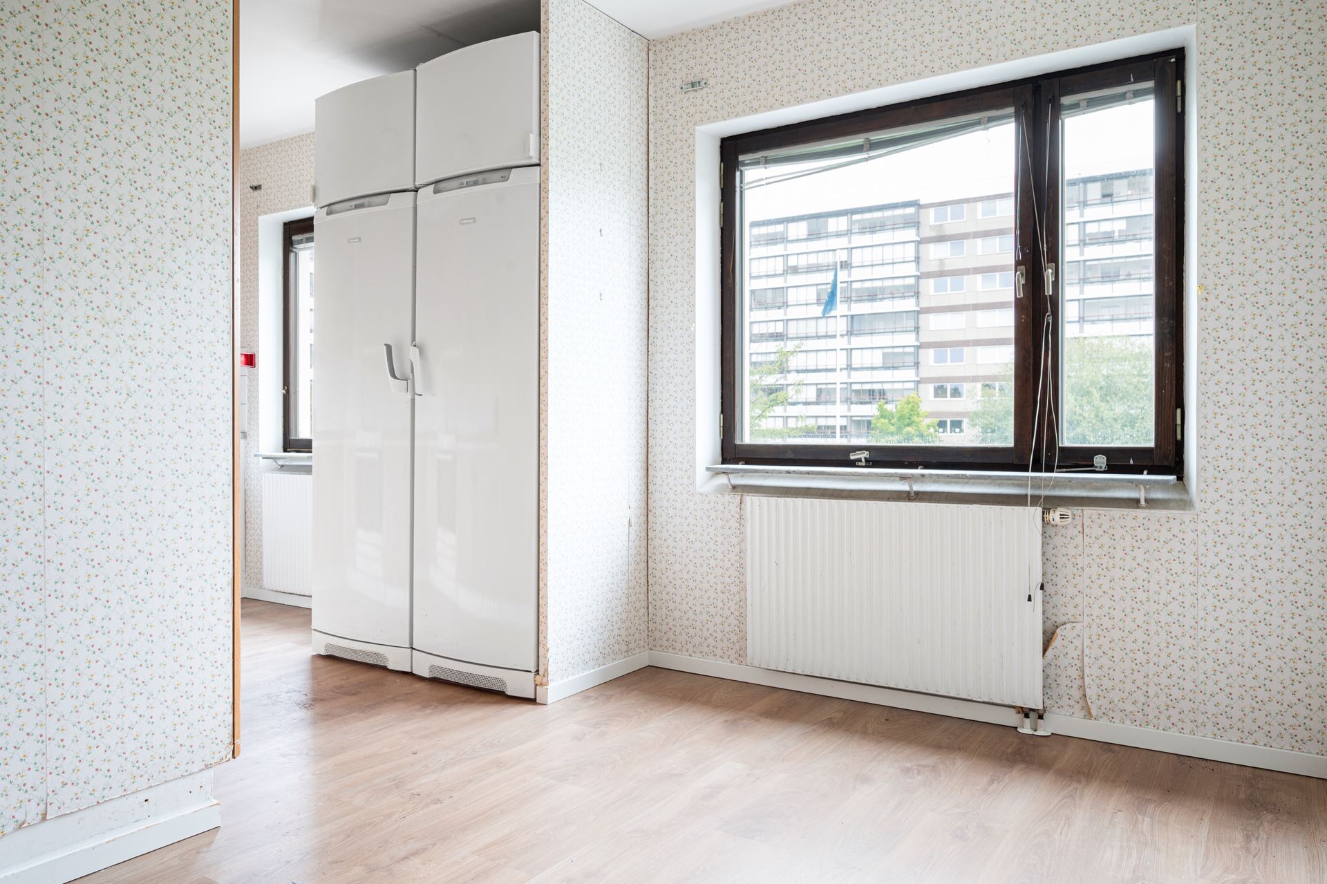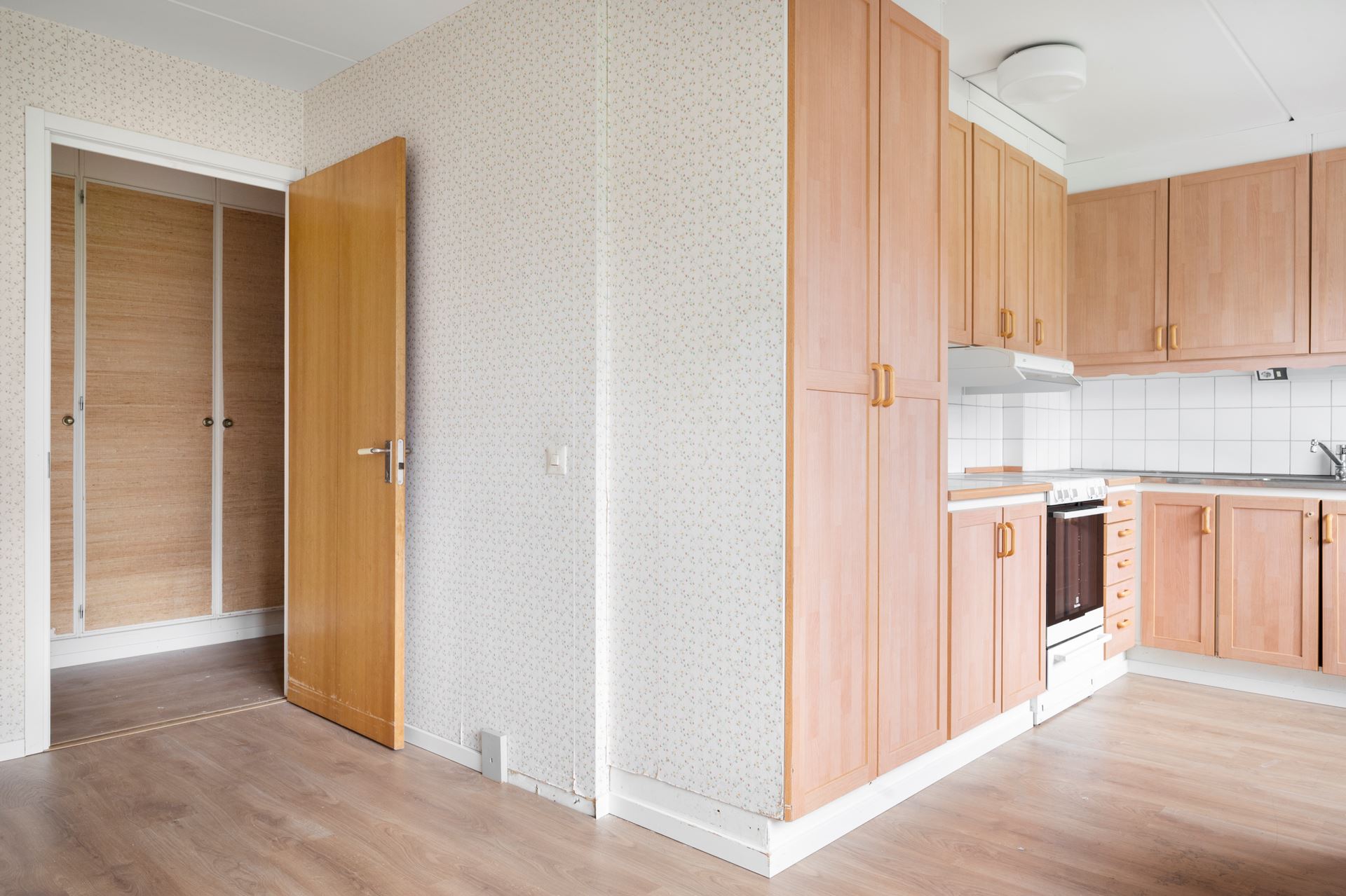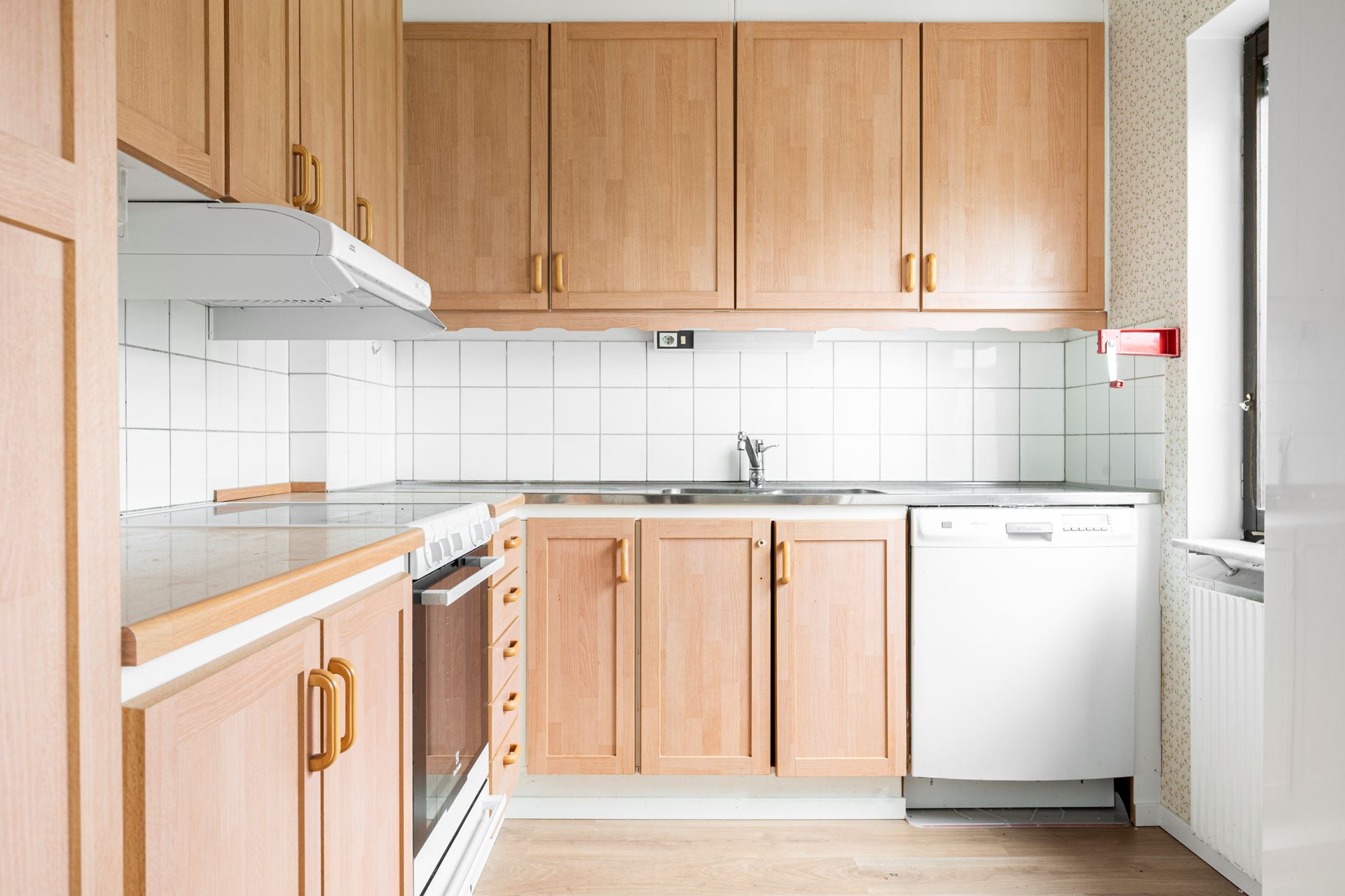 Vidare öppnar lägenheten upp mot köket. Här hittar vi utmärkt med förvaringsutrymme bakom ljusa skåpsluckor och gott om plats för arbetsytor. Köket är utrustat med hel kyl/frys, ugn, spis, köksfläkt och diskmaskin. Mot köksdel finns även utrymme för matplats.