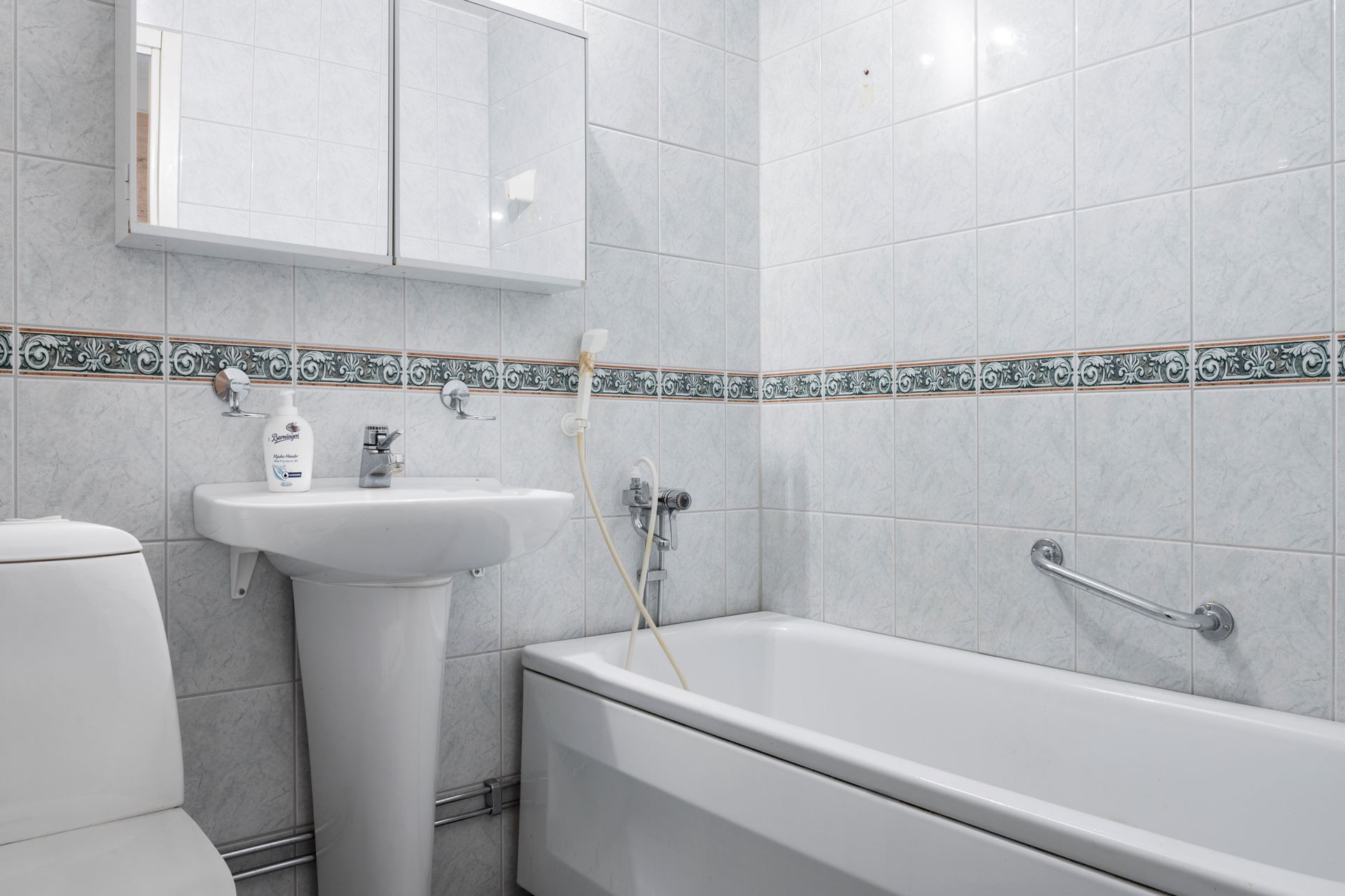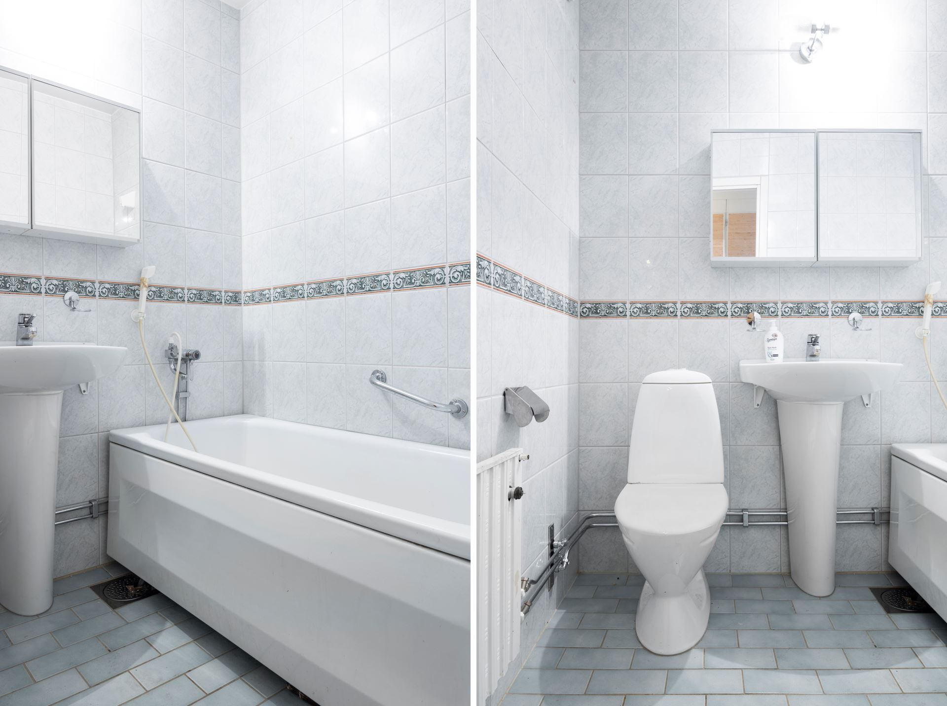 Helkaklat badrum med blått kakel och klinker. Badrummet är utrustat med badkar, wc, handfat och spegelskåp.