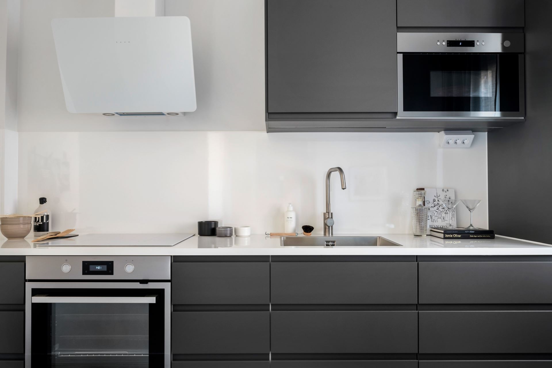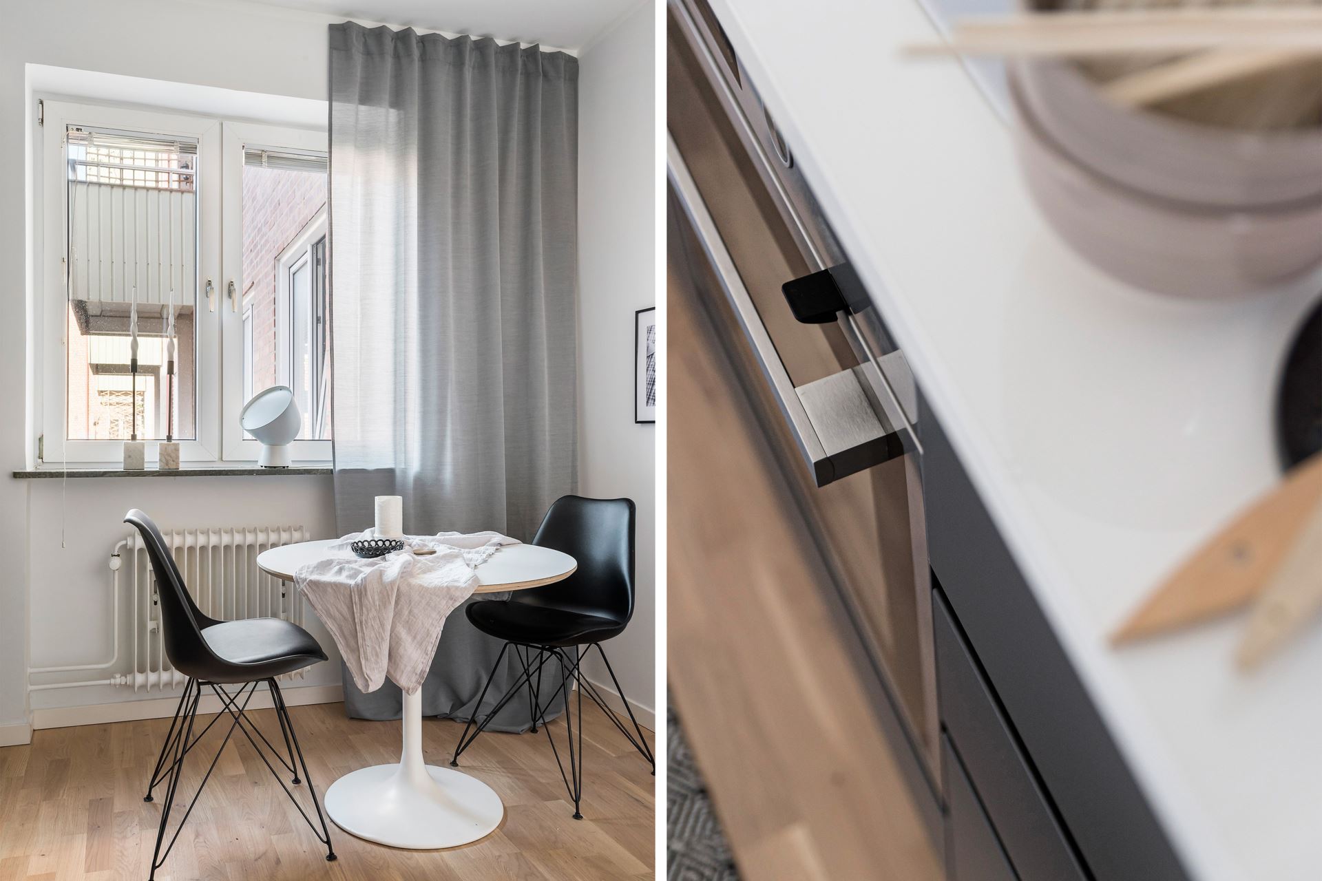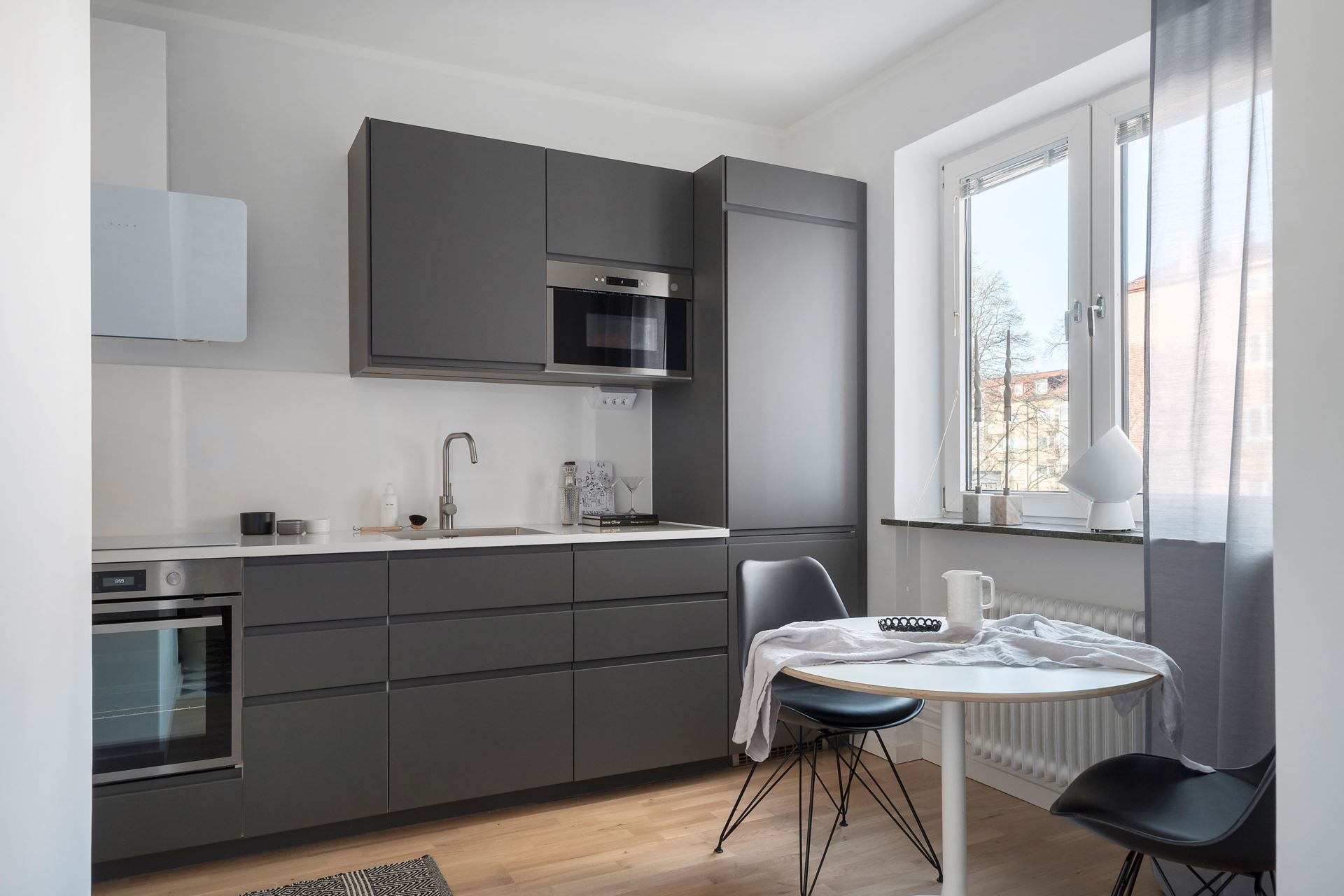 Köket som är helt nyrenoverat går i grått och vitt. På golvet vilar parkett som kombineras med bredspacklade väggar, vilket är genomgående in i sovrum och vardagsrum. Köket erbjuder komplett maskinpark bestående av integrerad kyl/frys, integrerad diskmaskin, inbyggd micro, induktionshäll, varmluftsugn med självrengöringsfunktion samt kolfilterfläkt. Invid fönsterpartier som vetter mot innergården kan ett bord för upptill fyra person placeras. Köket är från IKEA.