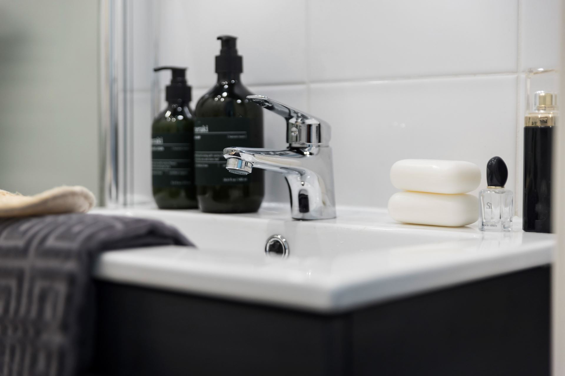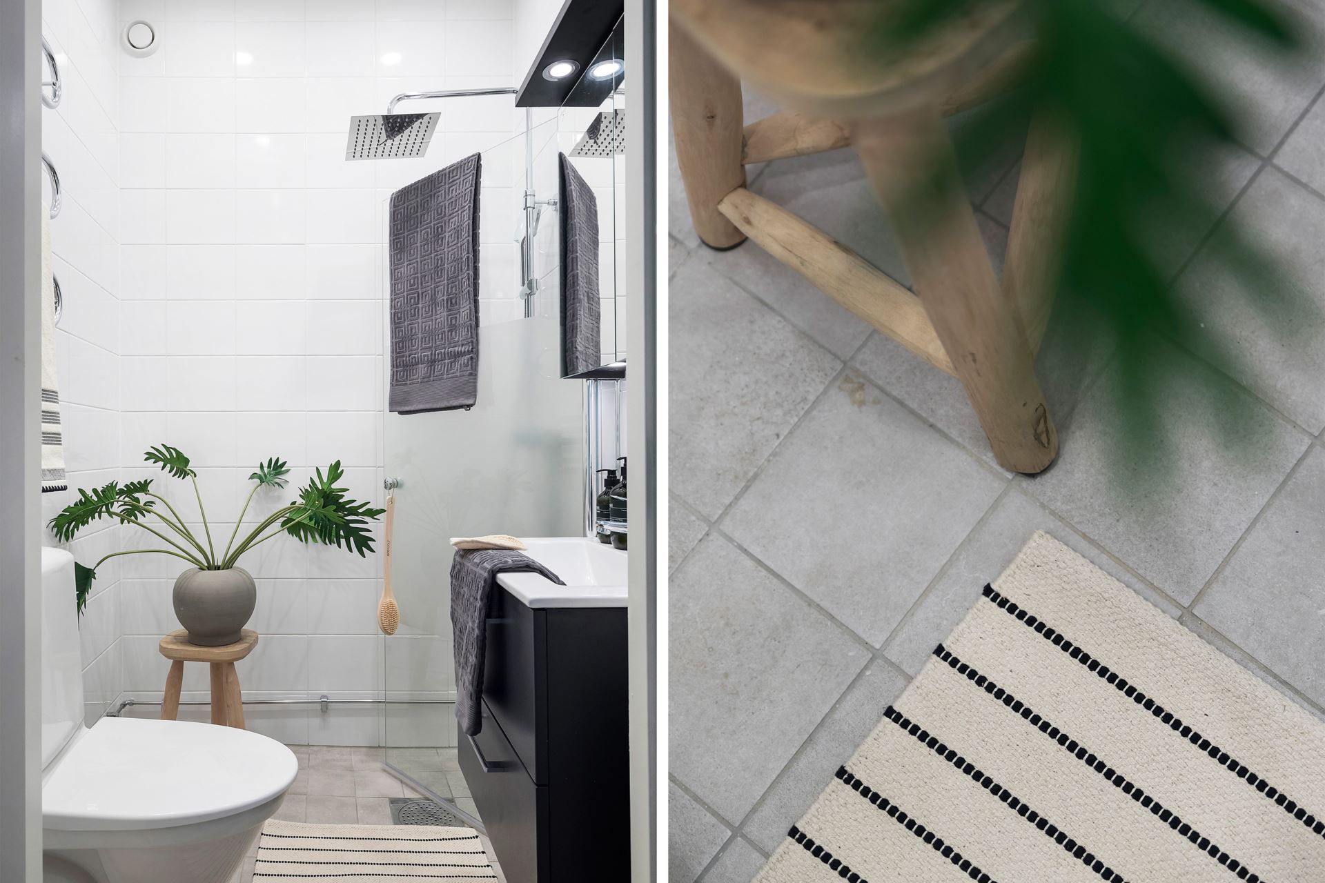 Badrummet är helkaklat med vita väggar som kombineras med grått klinkergolv. Smakfull inredning bestående av vask med kommod, vägghängt spegelskåp med belysning, dusch med takdusch och infällbar duschvägg, WC samt handdukstorkare. Det finns våtrumsintyg/kvalitetsdokument på badrummet.