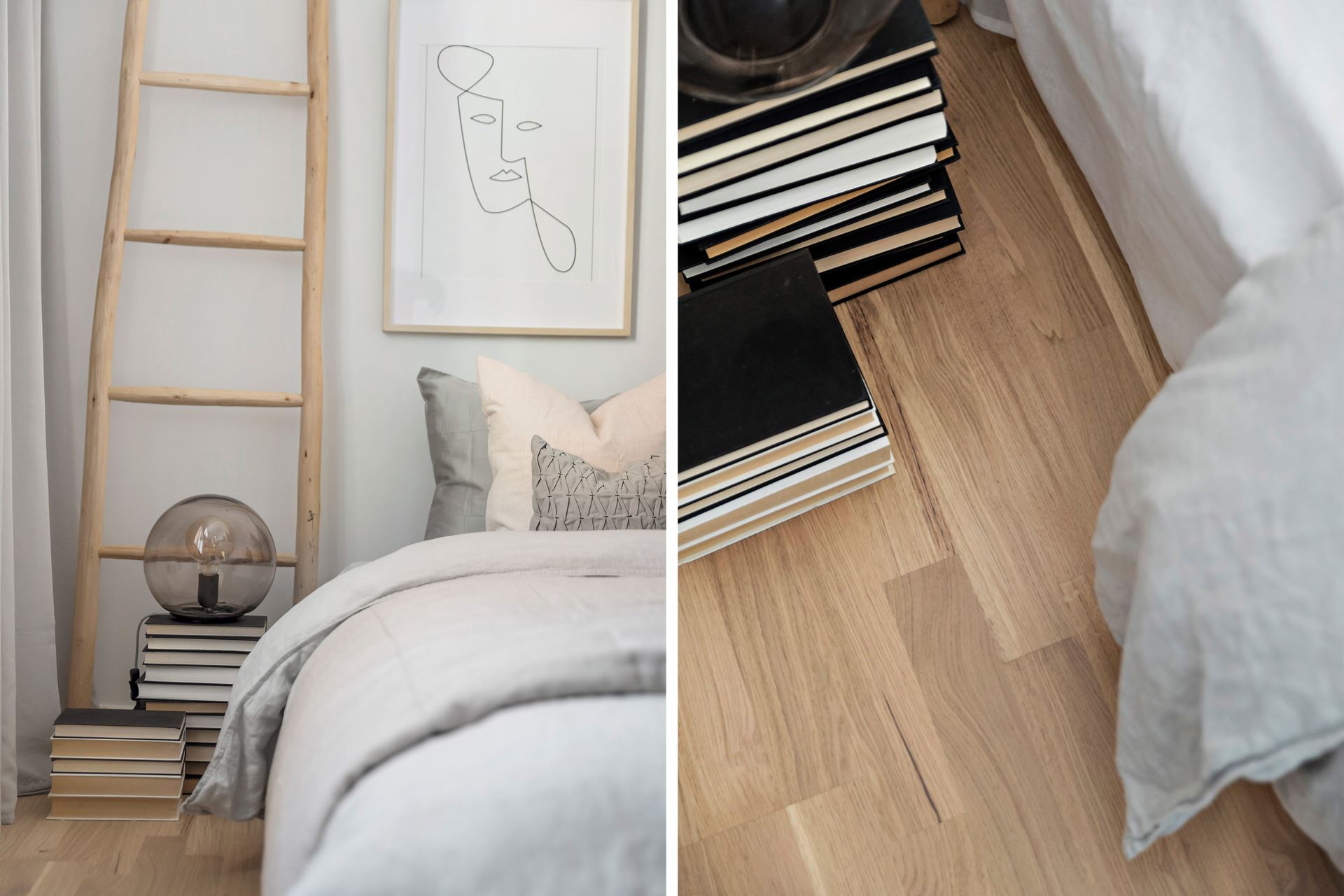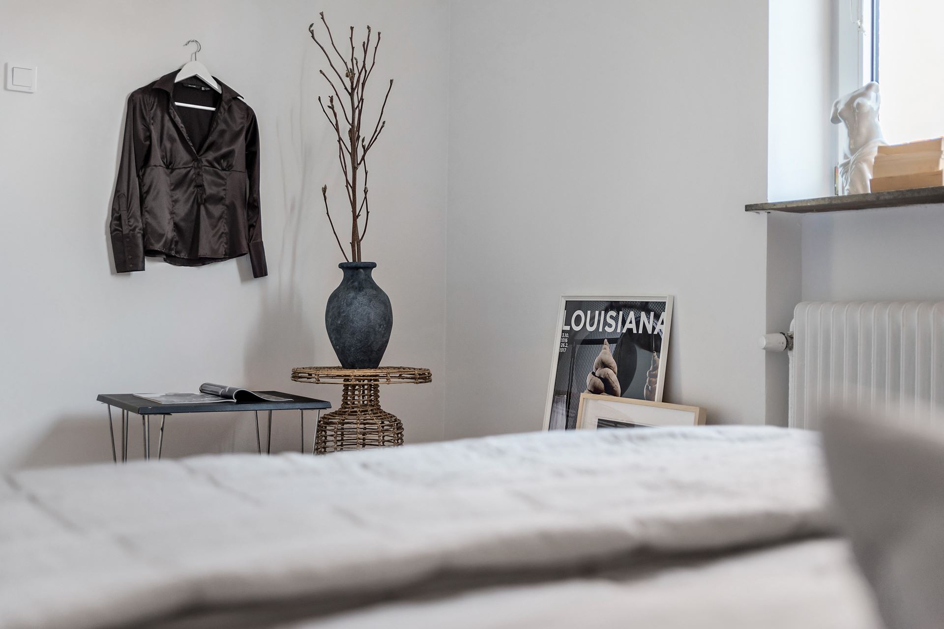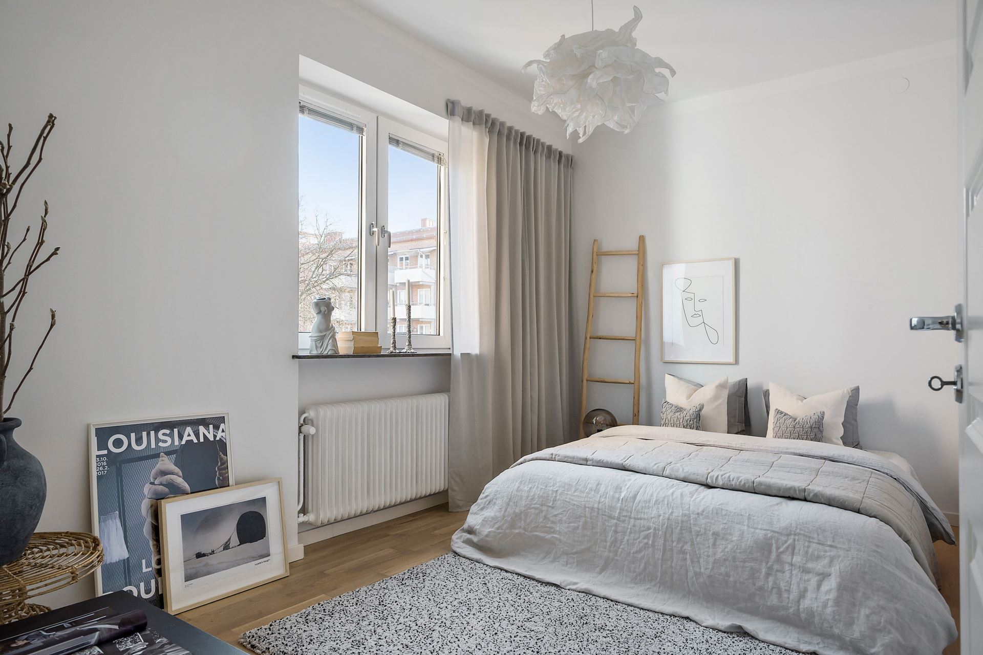 Sovrummet som går mer i ljusgrått har också gott om ljusinsläpp. Rummets storlek ör optimalt med plats för både större säng och fristående förvaringsmöbel om så önskas.