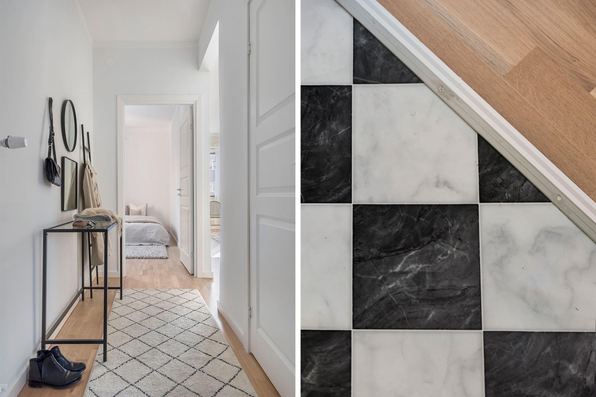 På andra våningsplanet välkomnas vi in av en rymlig hall. Den perfekta planlösningen ger oss access till alla rum från entrén. Dörren har blivit emaljerad för att passa in i den sobra färgskalan lägenheten erbjuder. I anslutning till hallen ligger en ytterst rymlig klädkammare som kan inredas efter önskemål och behov.
