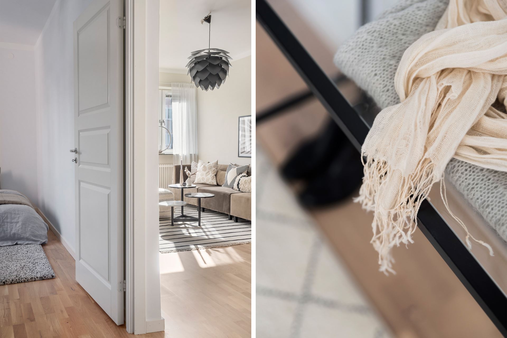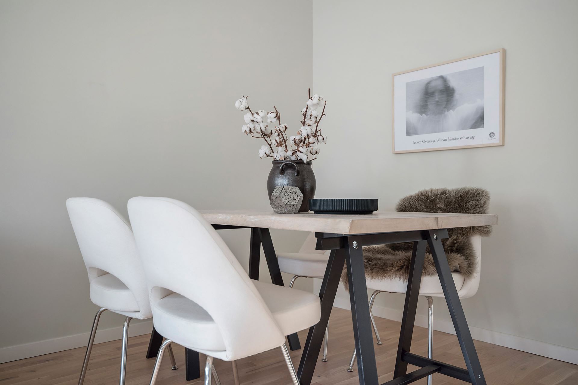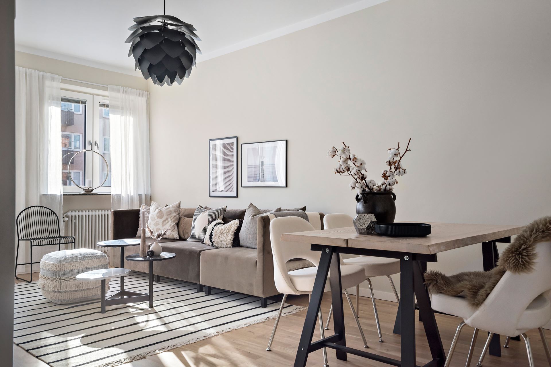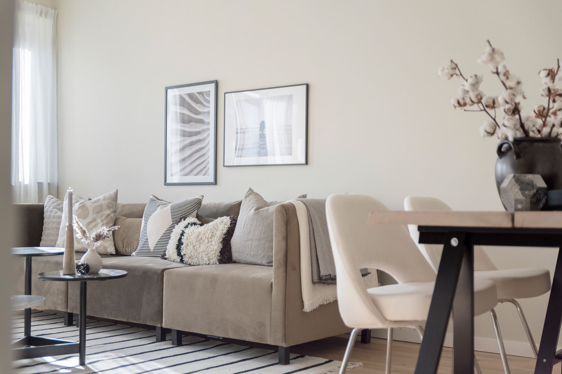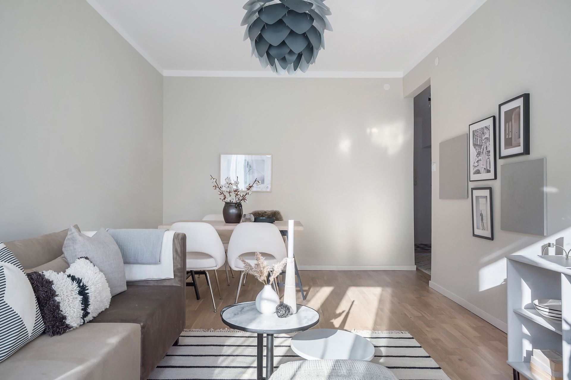 Det generösa vardagsrummet har parkettgolv, en snygg beige ton på väggarna och rikligt med ljusinsläpp. Här möblerar vi med både soffgrupp och matplats men även skrivbord, byrå eller läshörna för den som önskar.