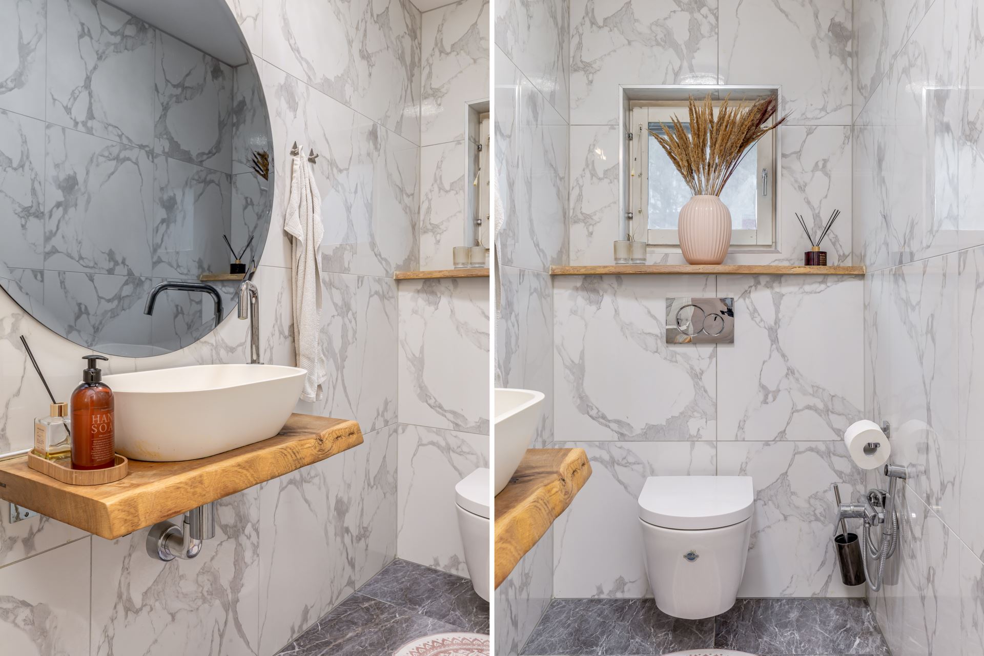 Snyggt utförd med samma harmoniska materialval, vägghängd wc och ovanpåliggande tvättställ på bänkskiva i trä. Litet fönster för ljus och vädring. Perfekt placerad vid hallen för besökare. Lätt att hålla fräsch.