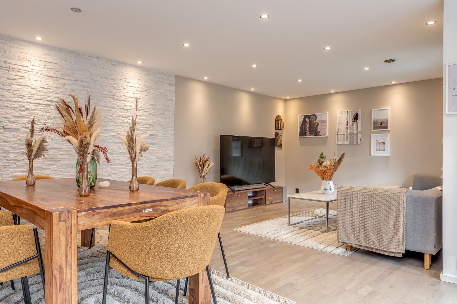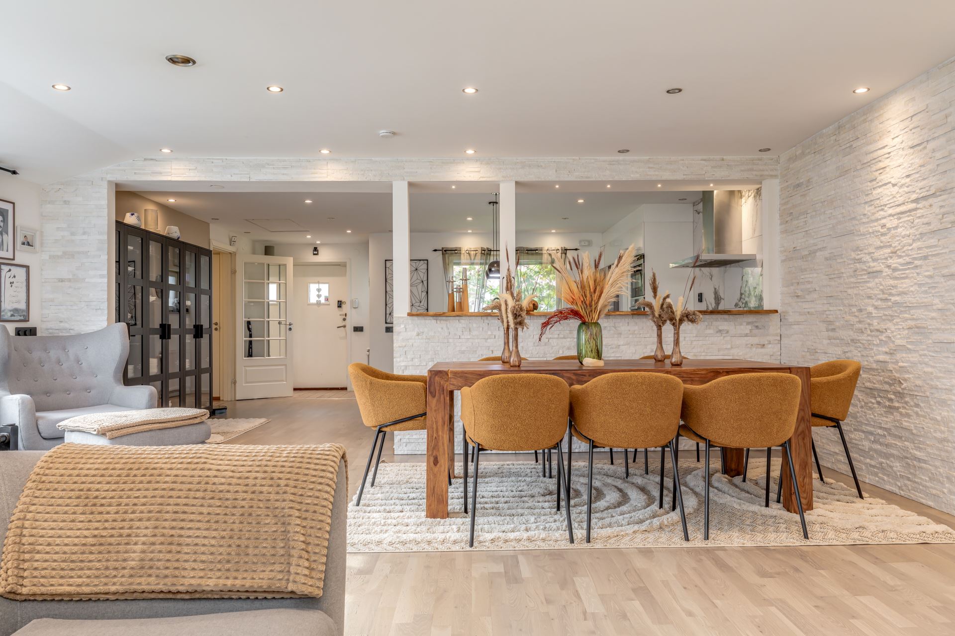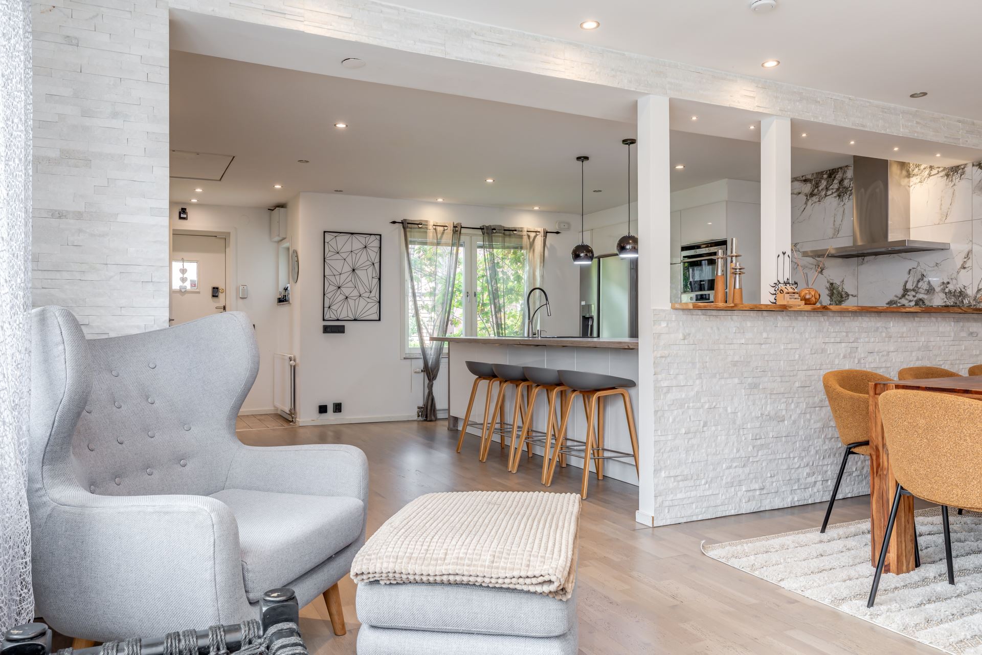 Generös yta i direkt anslutning till köket, här ryms ett stort bord för många gäster. Ljus färgsättning och spotlights skapar trivsel. Vägg med dekorativ stenstruktur ger en varm och sammanhållen känsla. Öppen koppling vidare mot vardagsrum och utgång till uteplats. En plats som fungerar lika bra till fest som till vardag.