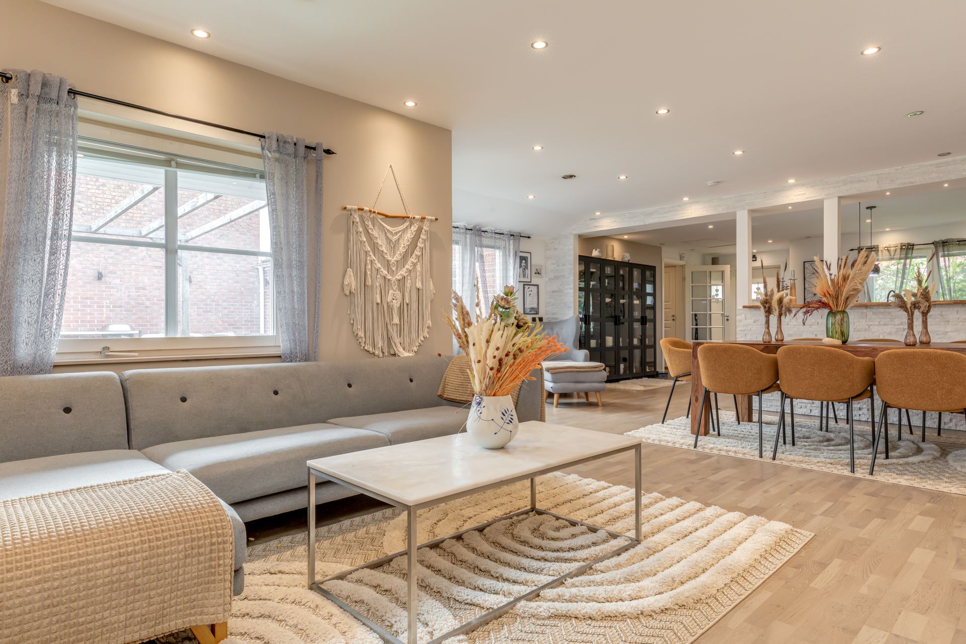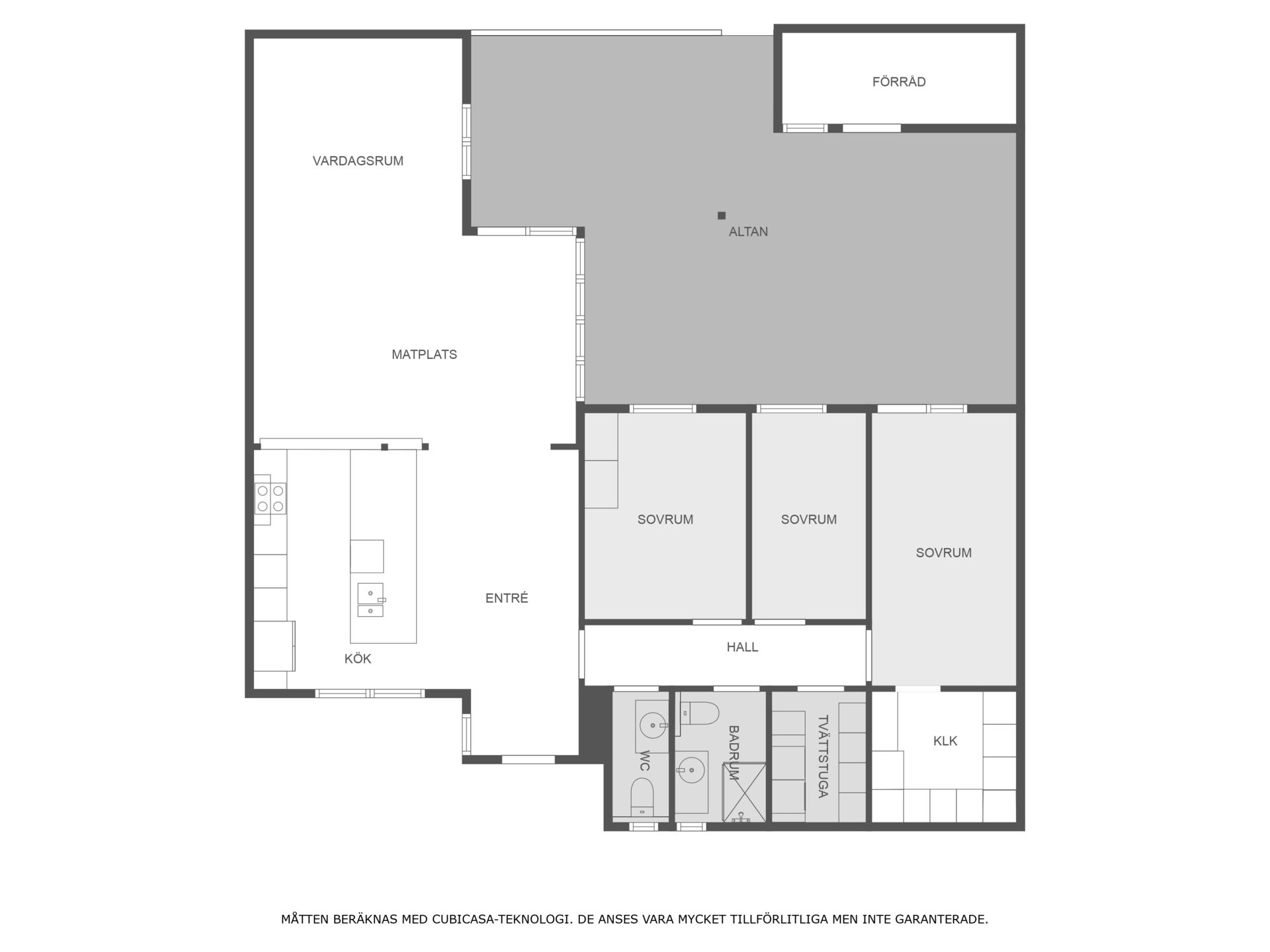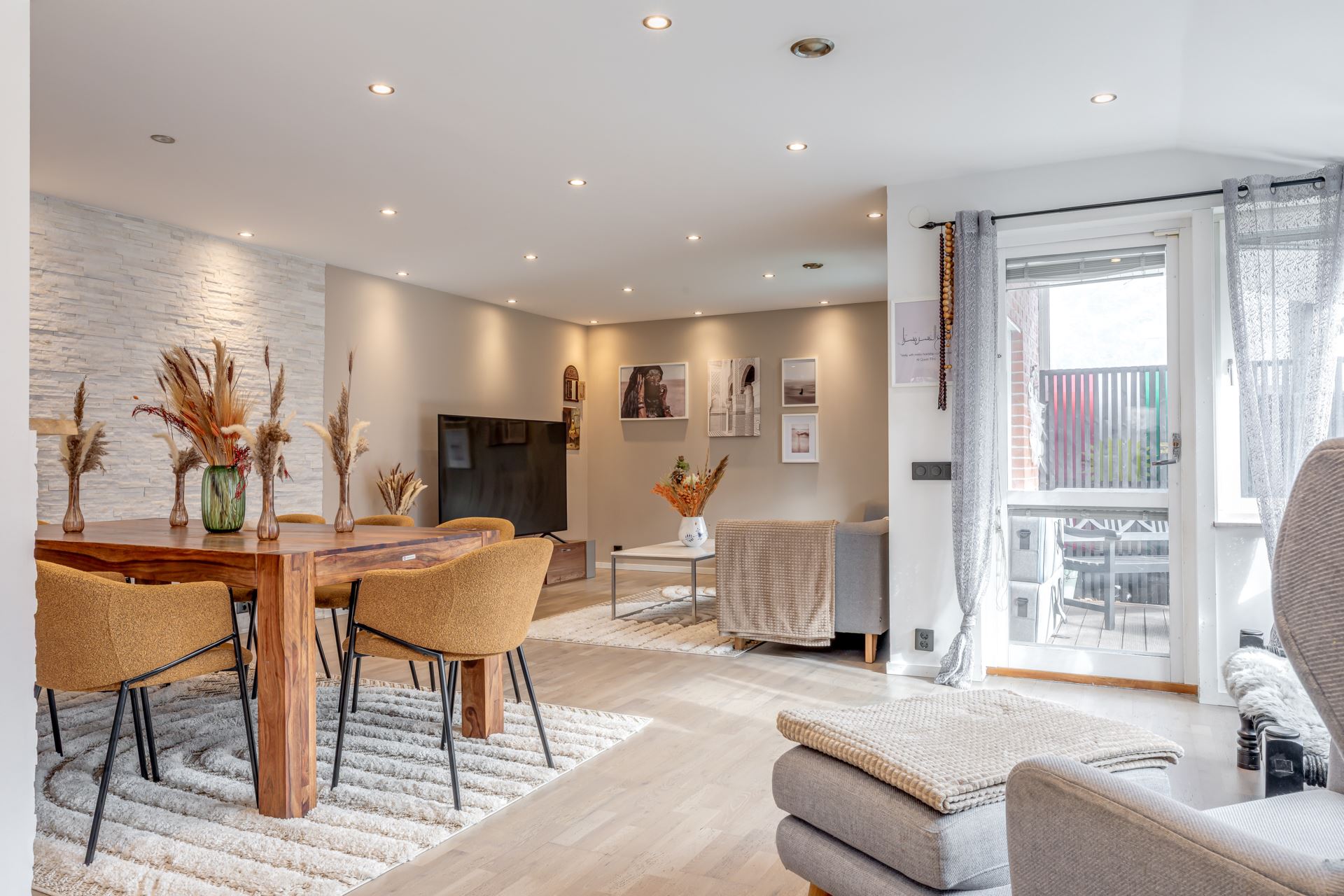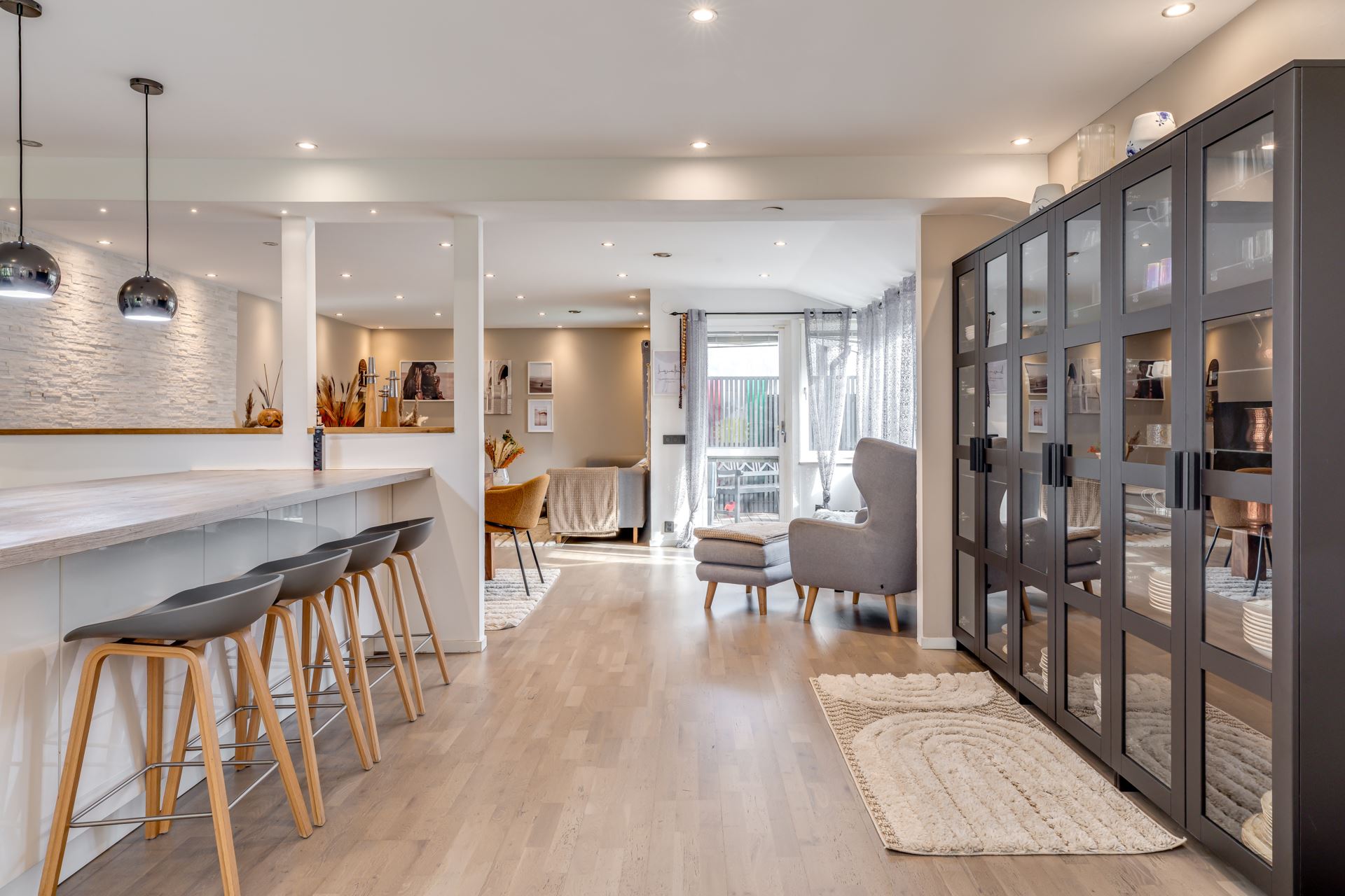 Luftigt sällskapsrum med plats för stor soffgrupp och mediamöbel. Flera fönster ger ett härligt ljus under dagen. Neutrala kulörer och infälld belysning gör det lätt att möblera. Praktisk närhet till kök och matplats gör rummet idealiskt för umgänge. Utgång till den insynsskyddade altanen för enkel förlängning av säsongen.