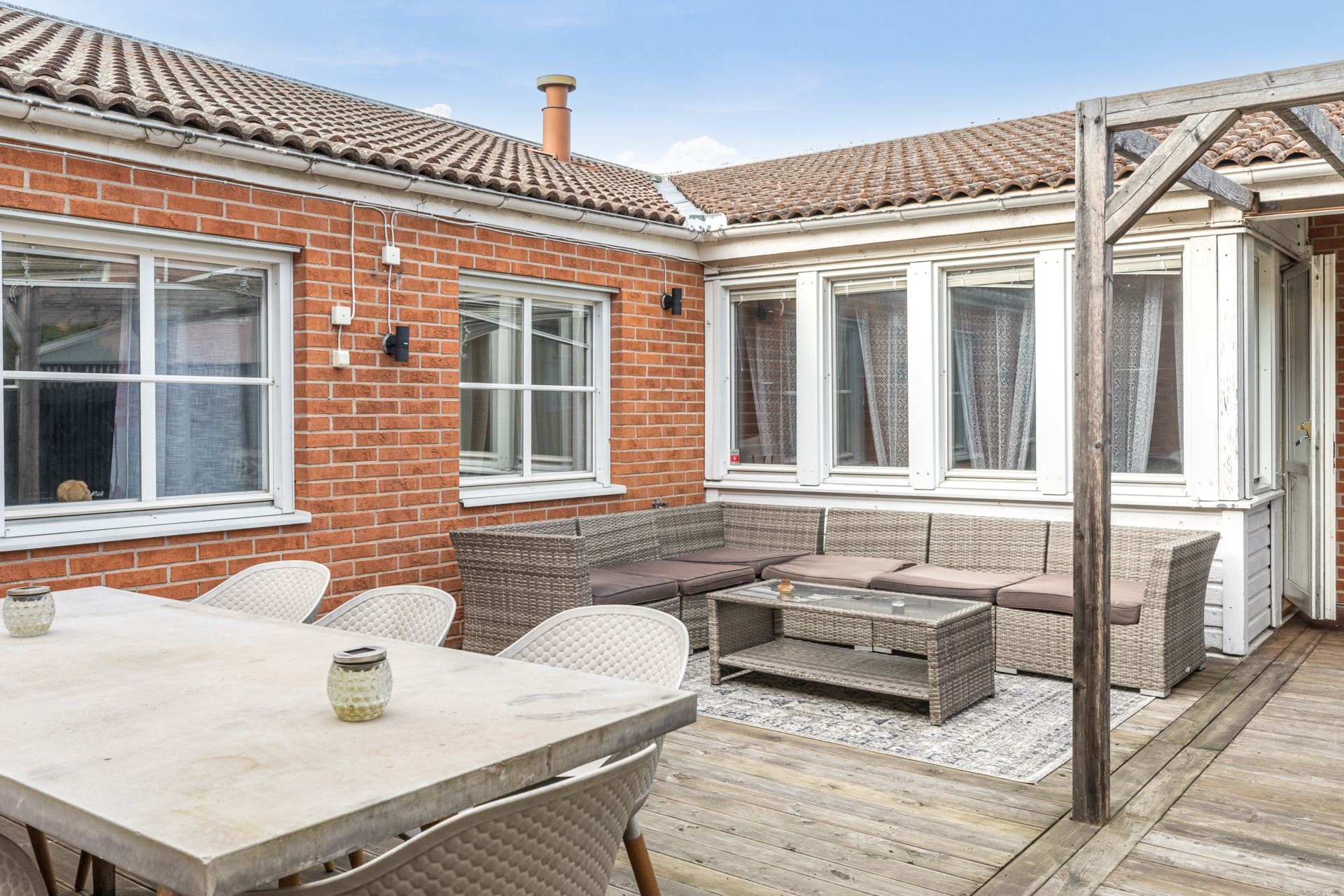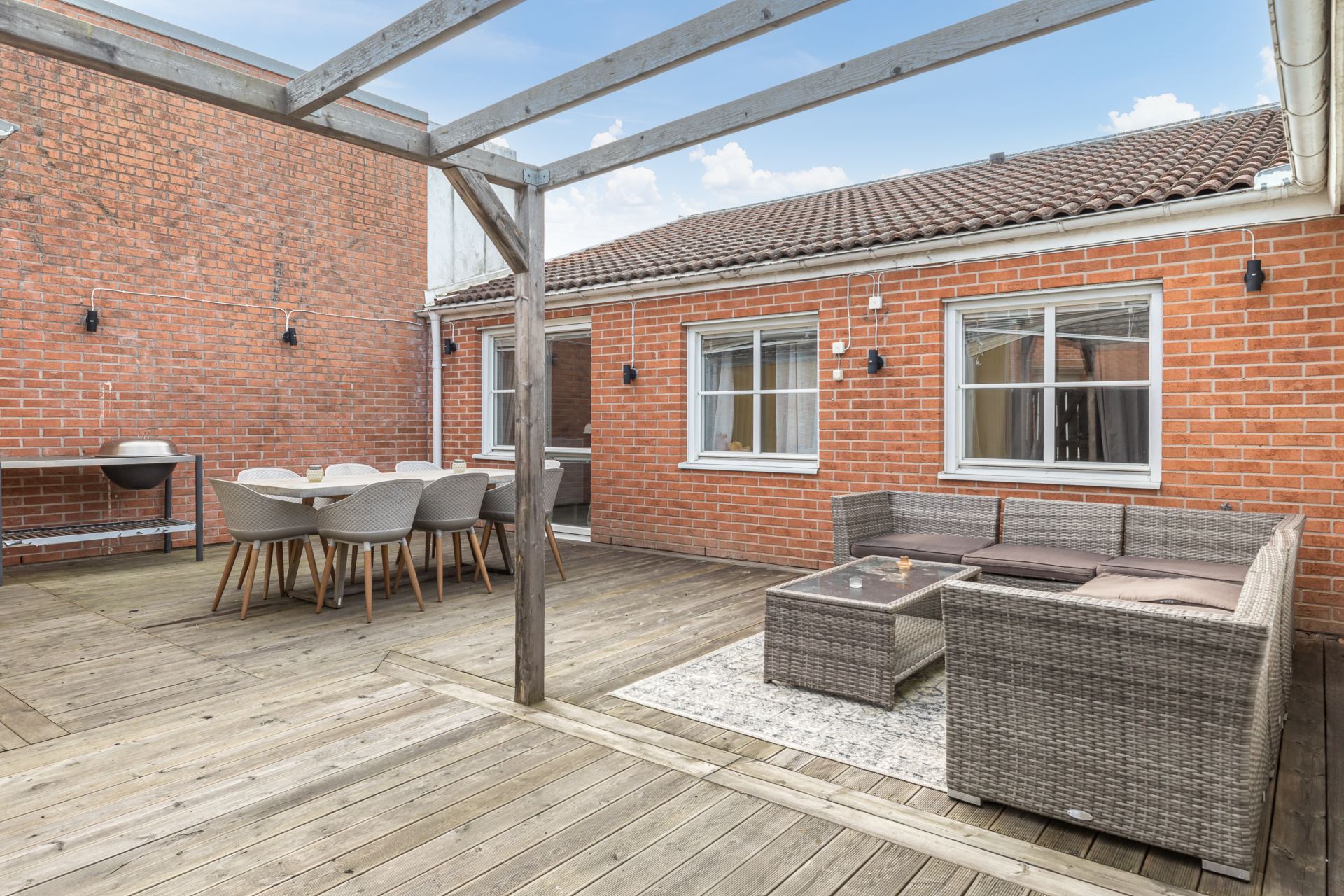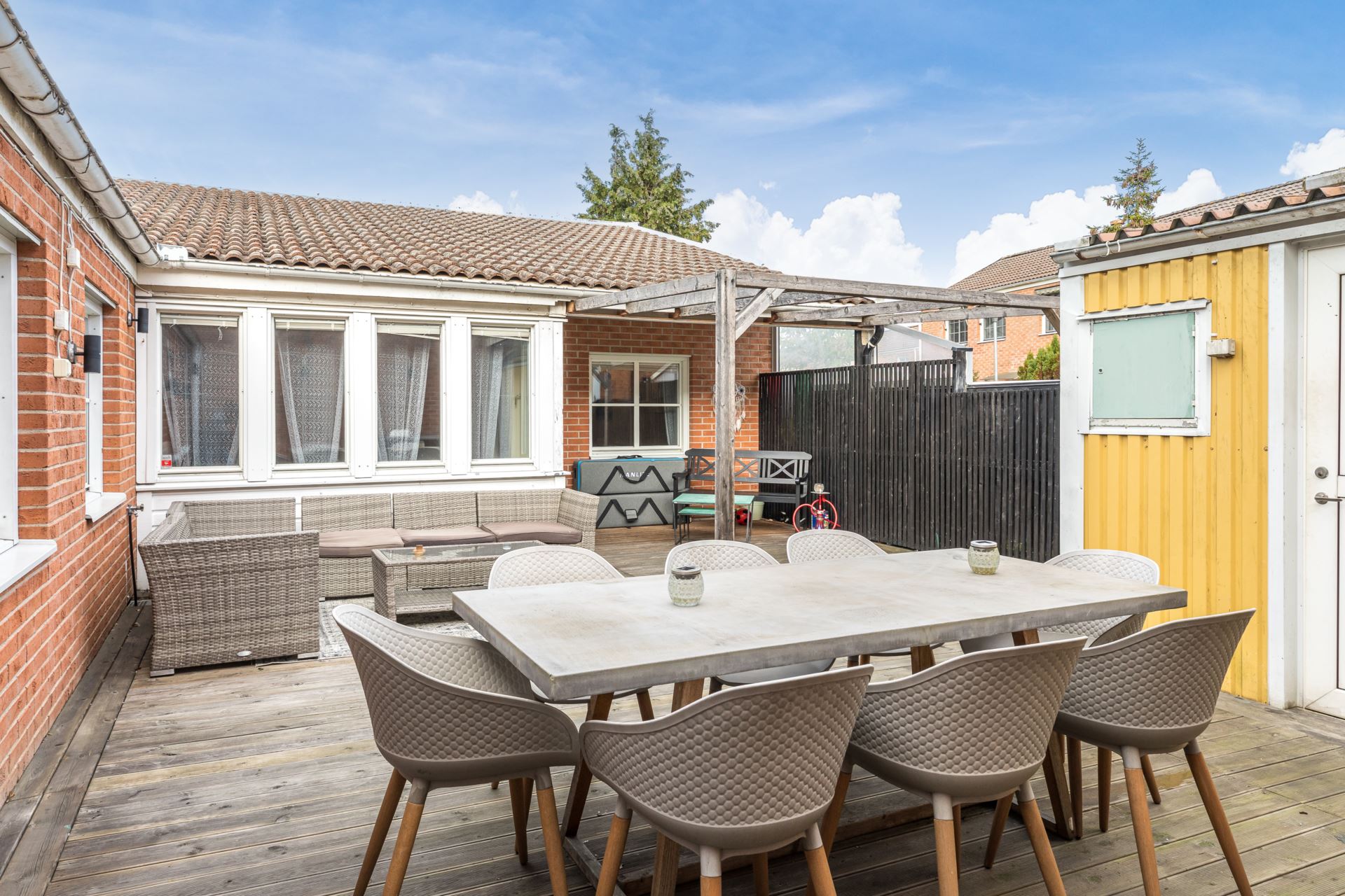 Rymlig, trädäckad altan i vinkel, helt insynsskyddad och lättmöblerad för både loungedel och matgrupp. Eluttag och belysning för sena kvällar. Förråd i anslutning ger plats åt cyklar, barnvagn och utemöbler. En privat oas som förlänger vardagsrummen utomhus.