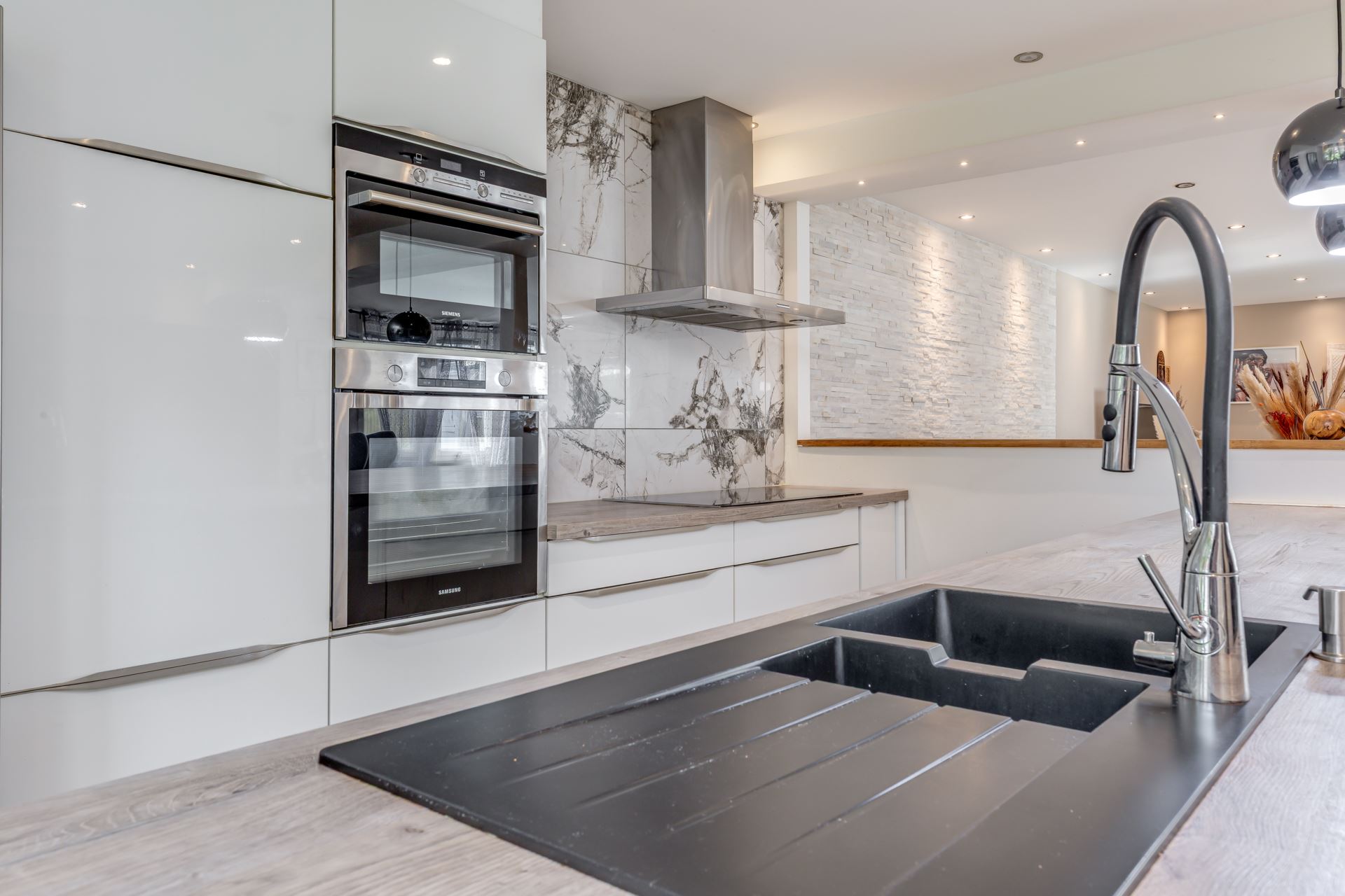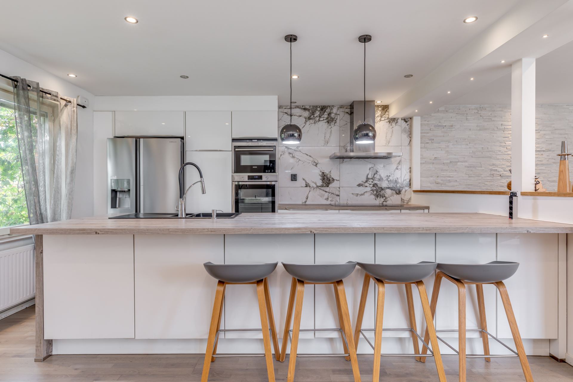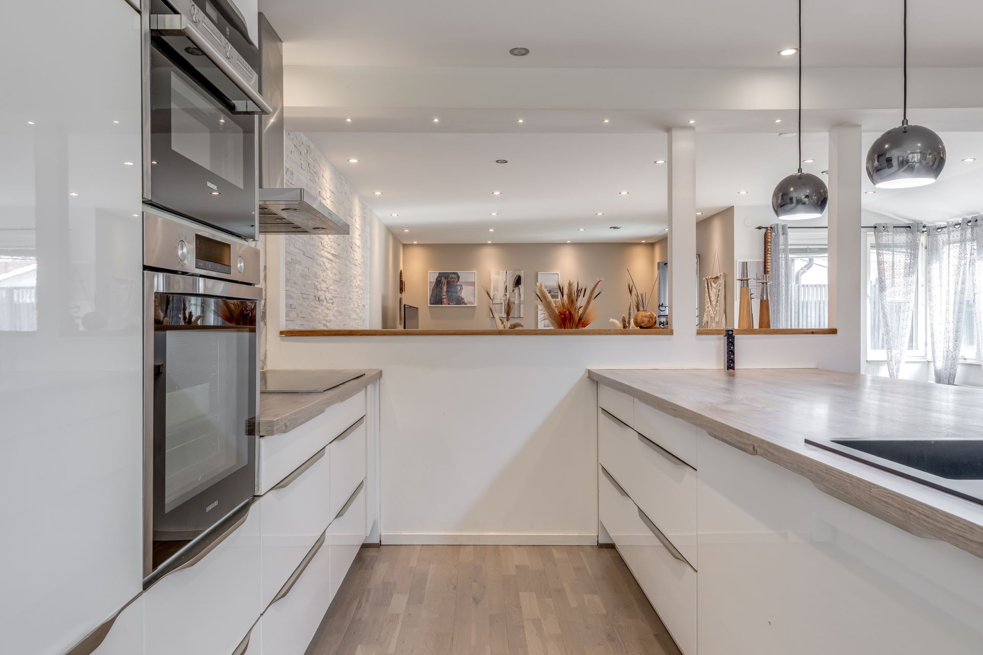 Påkostat kök i modern stil med stora arbetsytor och gott om förvaring. Köksö med bardel rymmer flera sittplatser, perfekt för frukost eller läxläsning. Blankvita luckor, bänkskivor i träton och marmormönstrat stänkskydd och inbyggda vitvaror. Öppet mot matplats och vardagsrum för smidig servering och trevligt umgänge. Fint ljusinsläpp från fönster mot grönska. Maskinell utrustning består av kyl/frys (2018), spishäll (2025), diskmaskin (2024), fläkt(2018) samt inbyggd ugn och micro.