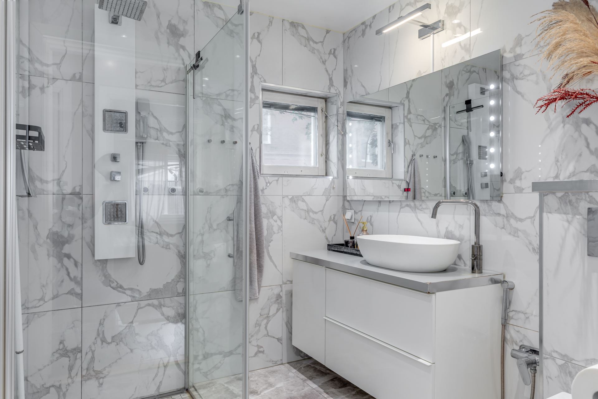 Stilrent, helkaklat badrum som renoverades 2018 med marmormönstrade väggar och glasad duschhörna med taksil. Rymlig kommod med ovanpåliggande tvättställ och stor spegel med belysning. Neutral klinker på golv och vägghängd wc. Fönster ger dagsljus och möjlighet till vädring. Genomtänkt förvaring för en ordnad start på dagen.