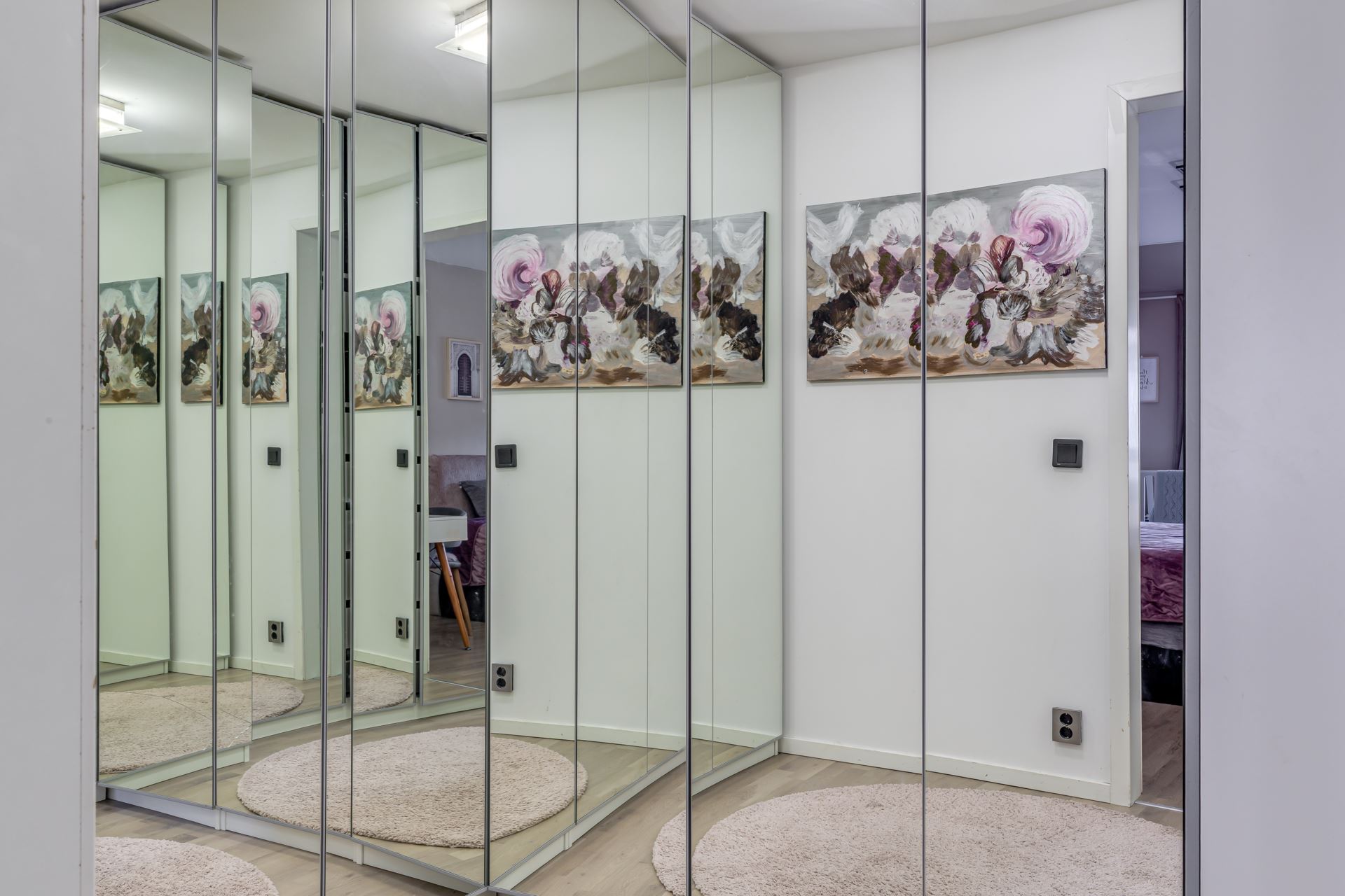 Välkomnande entré med plats för avhängning och förvaring. Ljusa ytskikt och infällda spotlights ger ett rent intryck. Praktisk kontakt med både kök och sovrumsdel, vilket underlättar vardagslogistiken. Från hallen nås gäst wc, badrum och tvättstuga. Golv i slitstarkt material som tål hög trafik.