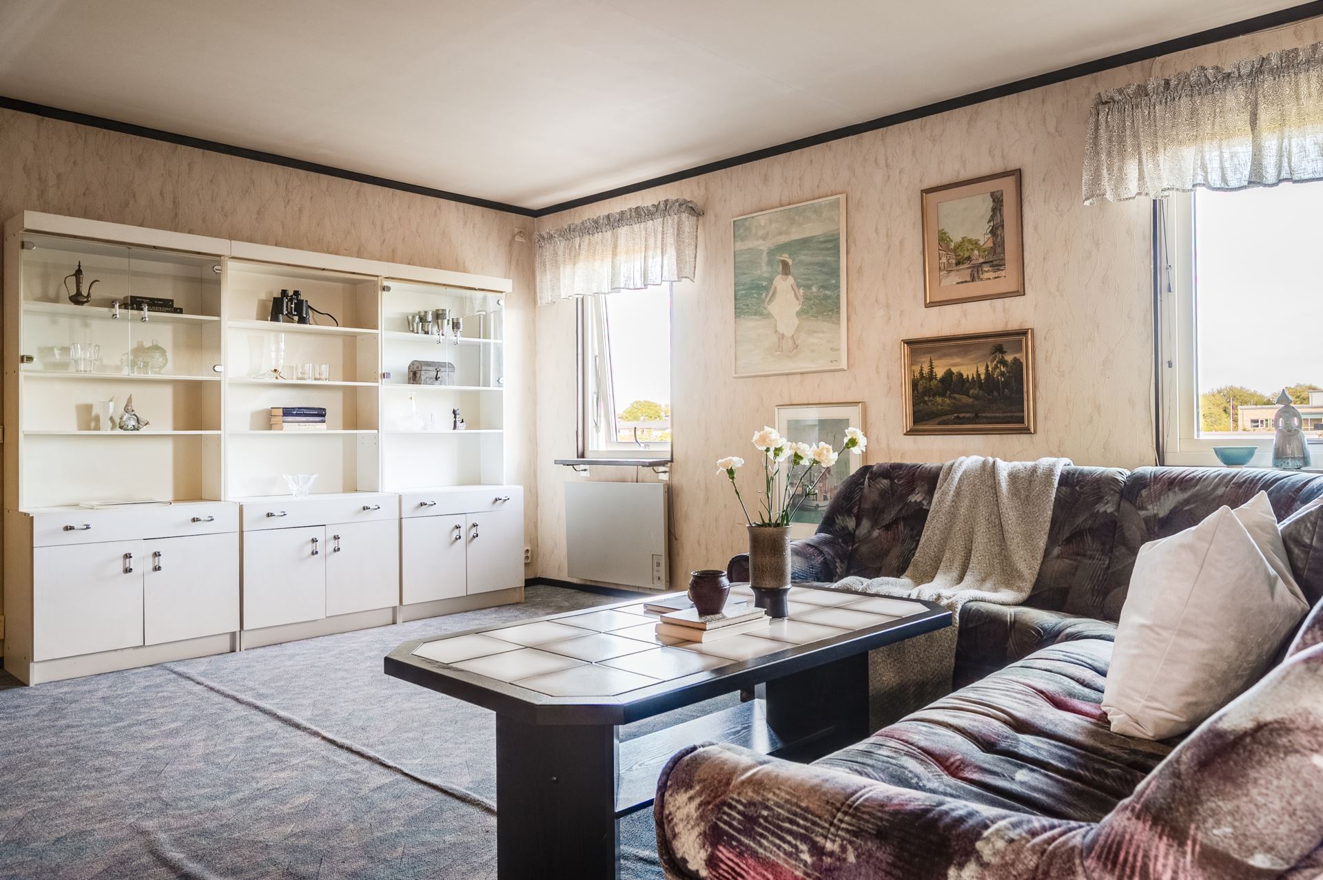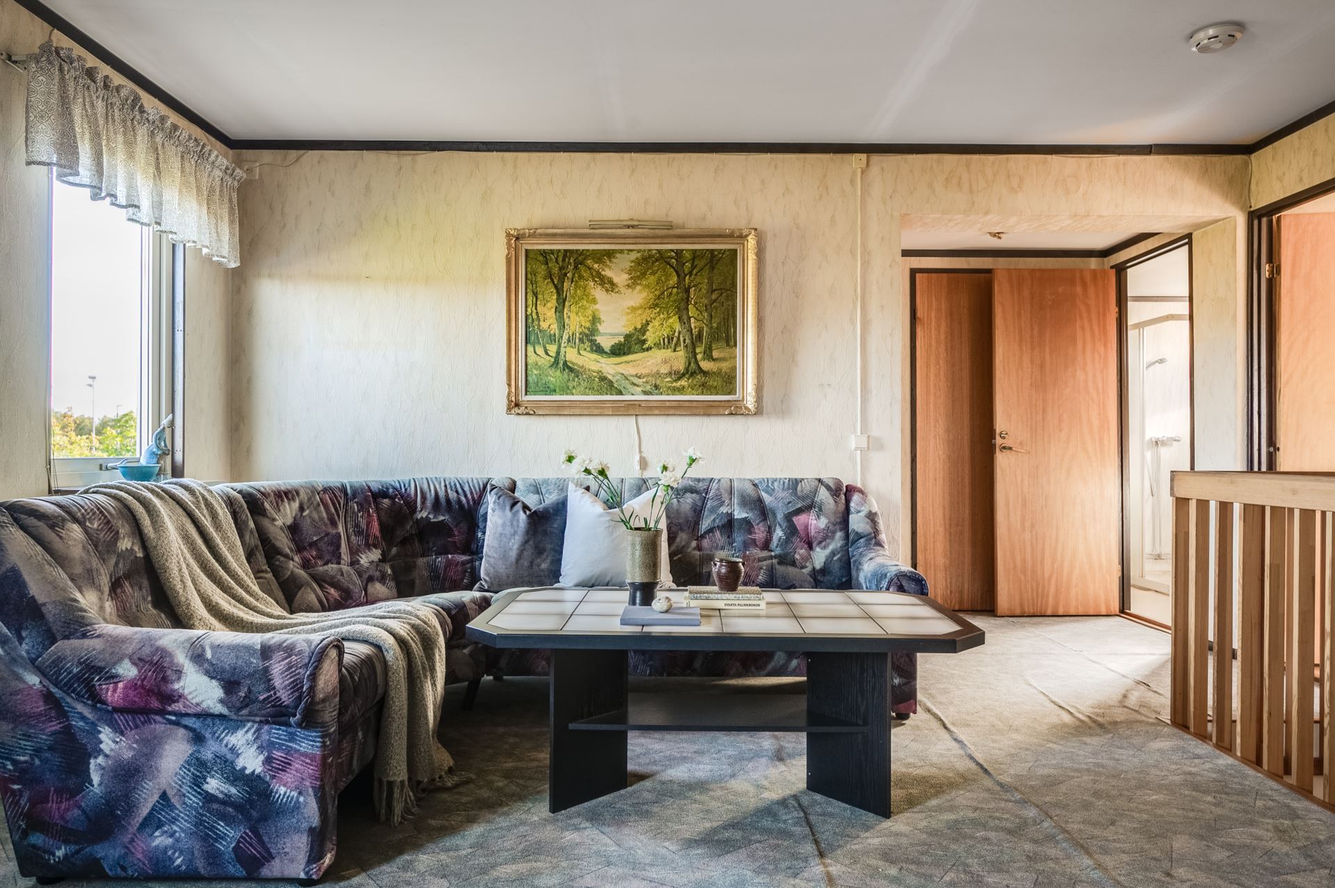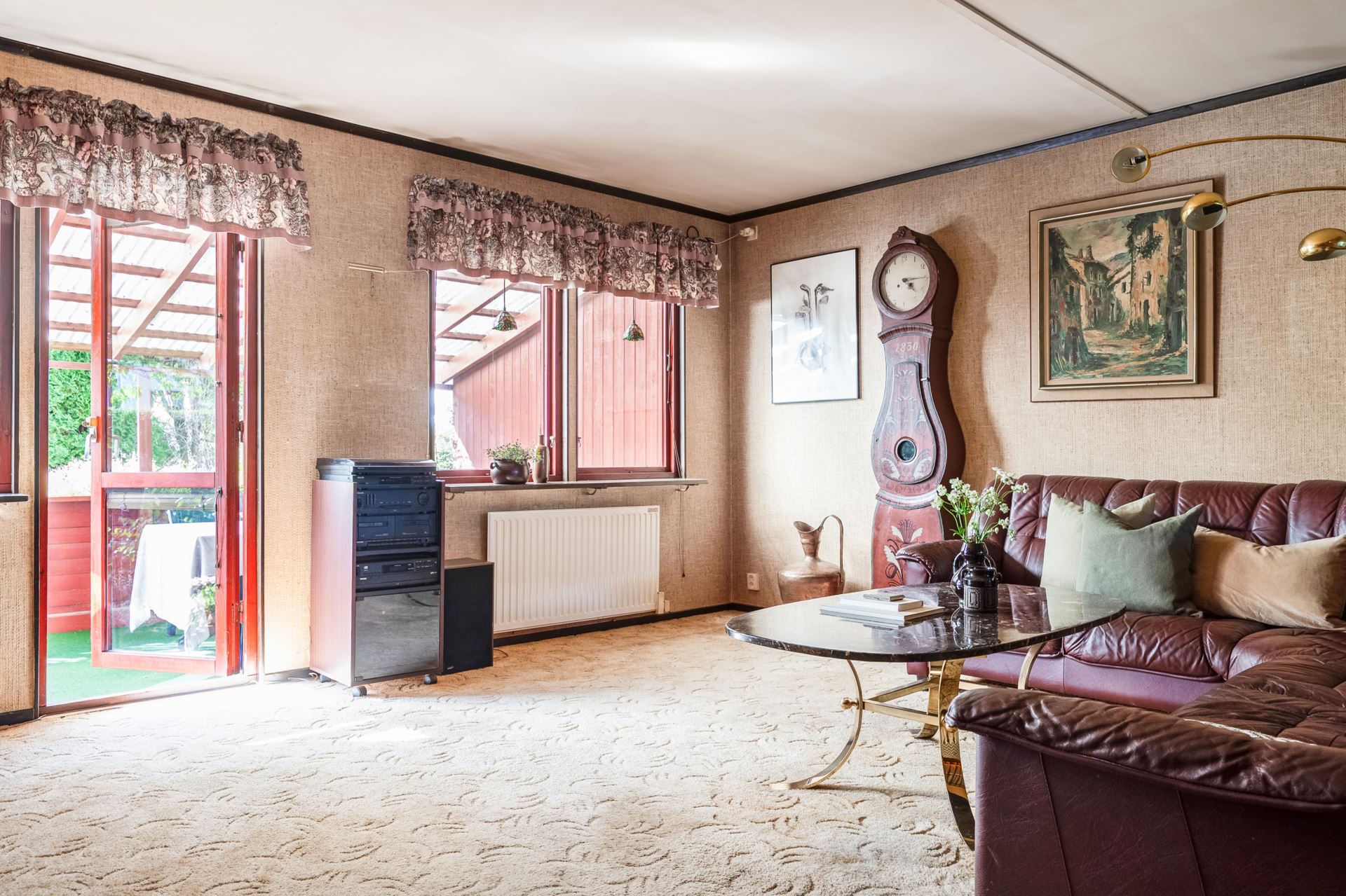 Trivsamt vardagsrum med flertalet fönster som släpper in rikligt med ljus. Här finns plats för både soffgrupp och läshörna. Altandörren leder ut till uteplats med skärmtak och framsidans trädgård.