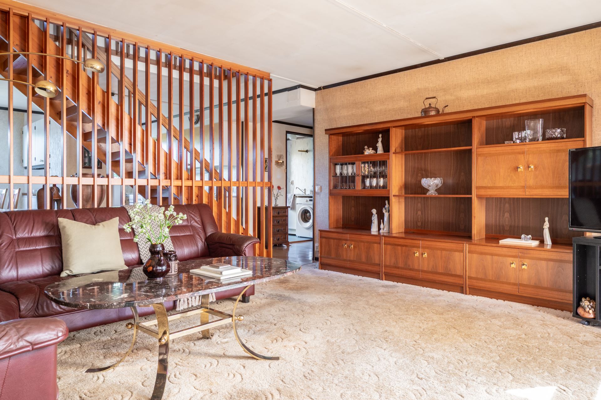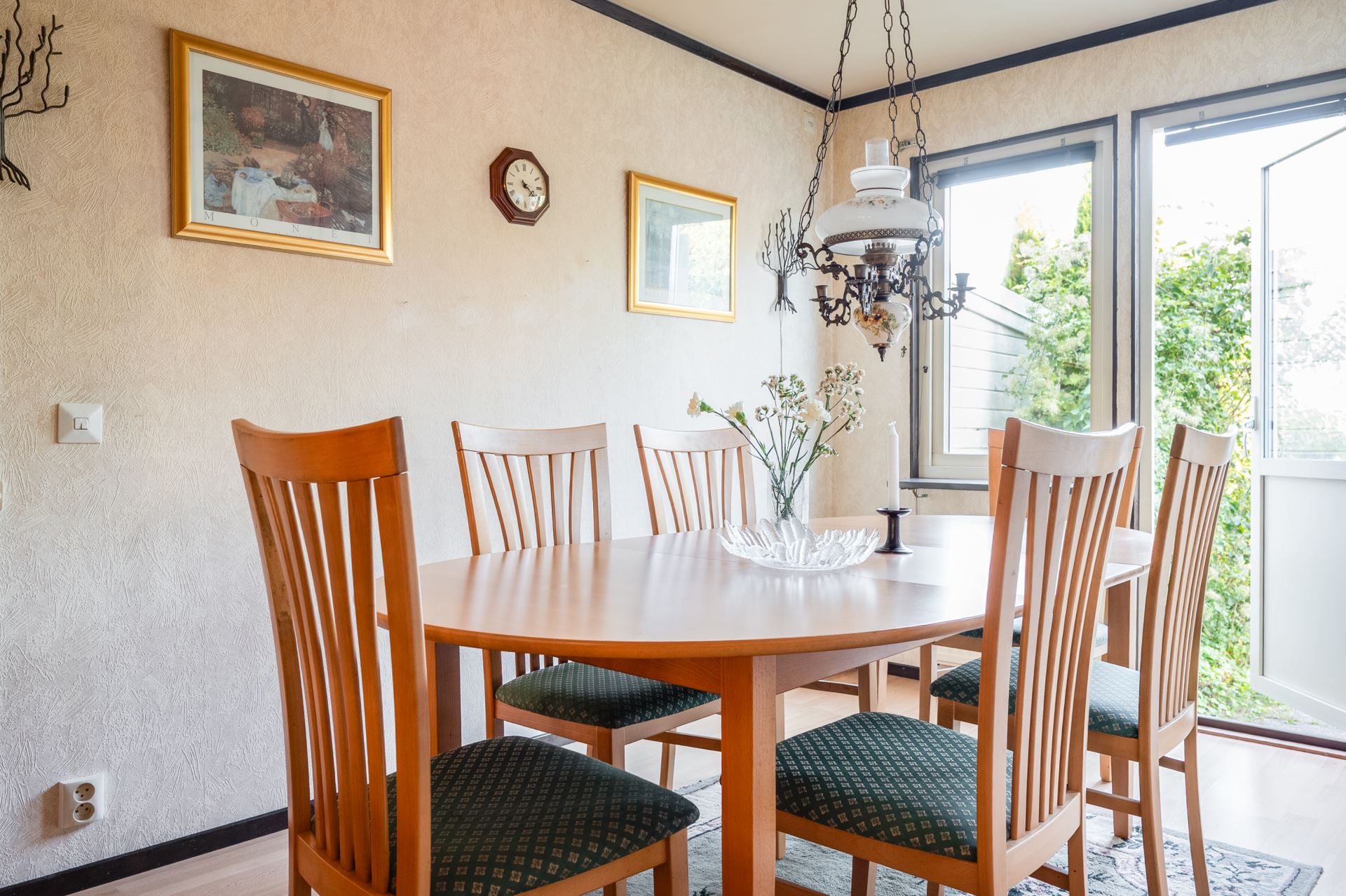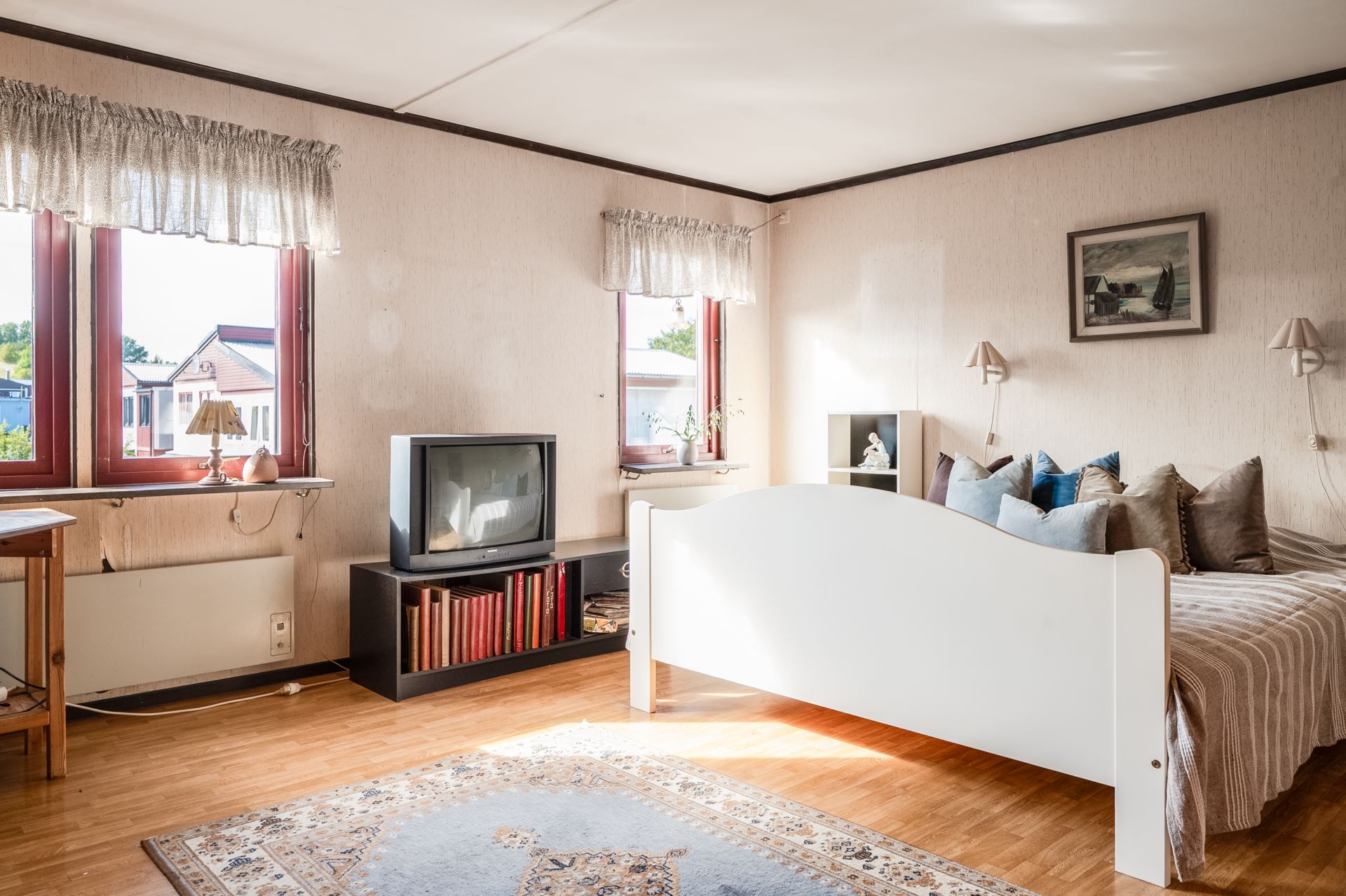 Trivsamt vardagsrum med flertalet fönster som släpper in rikligt med ljus. Här finns plats för både soffgrupp och läshörna. Altandörren leder ut till uteplats med skärmtak och framsidans trädgård.