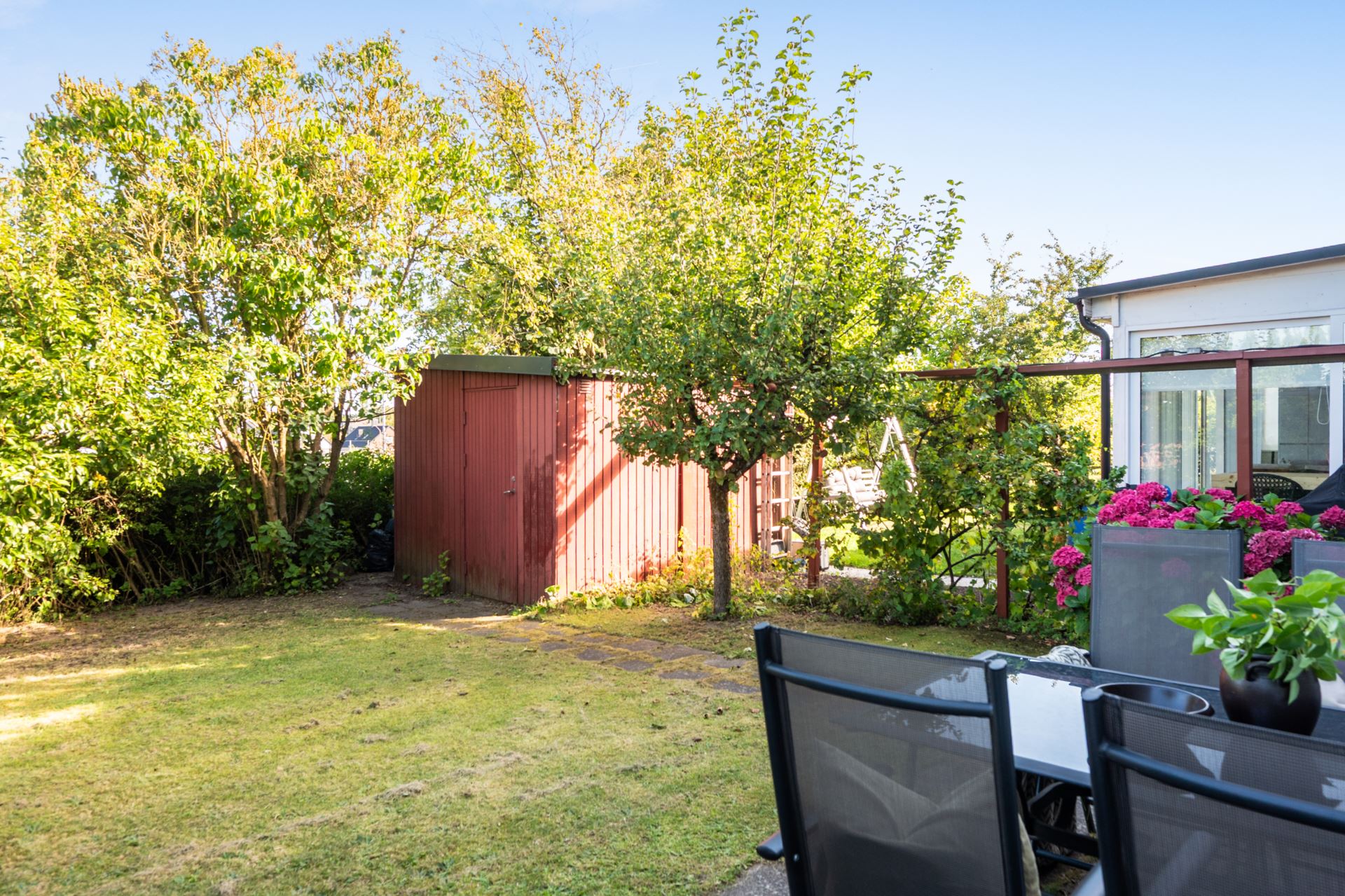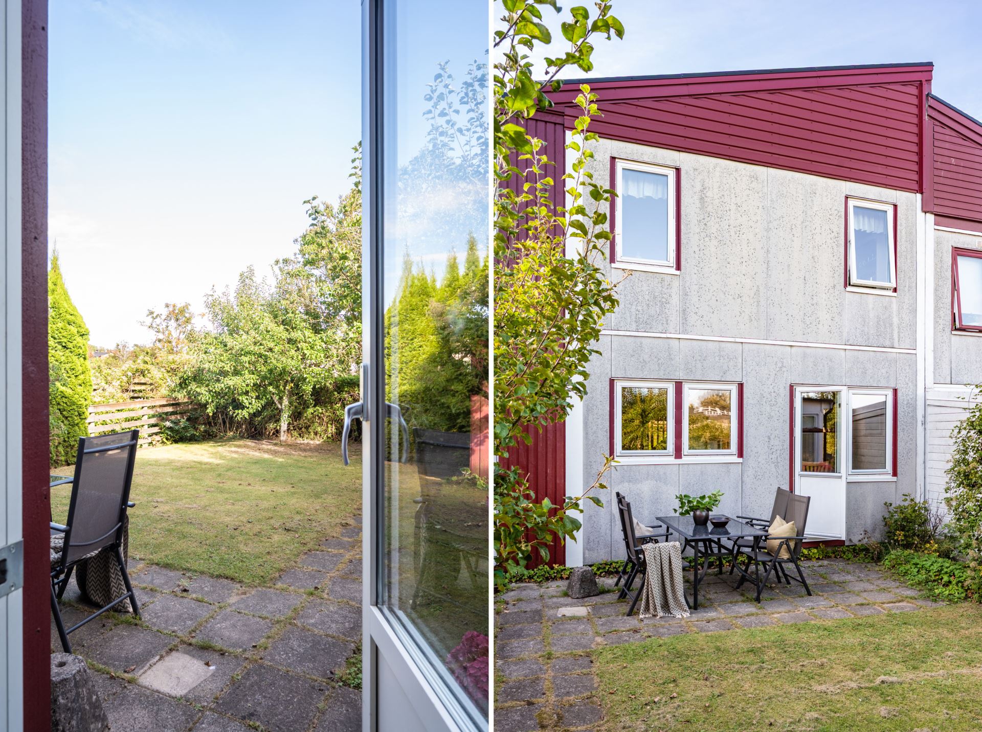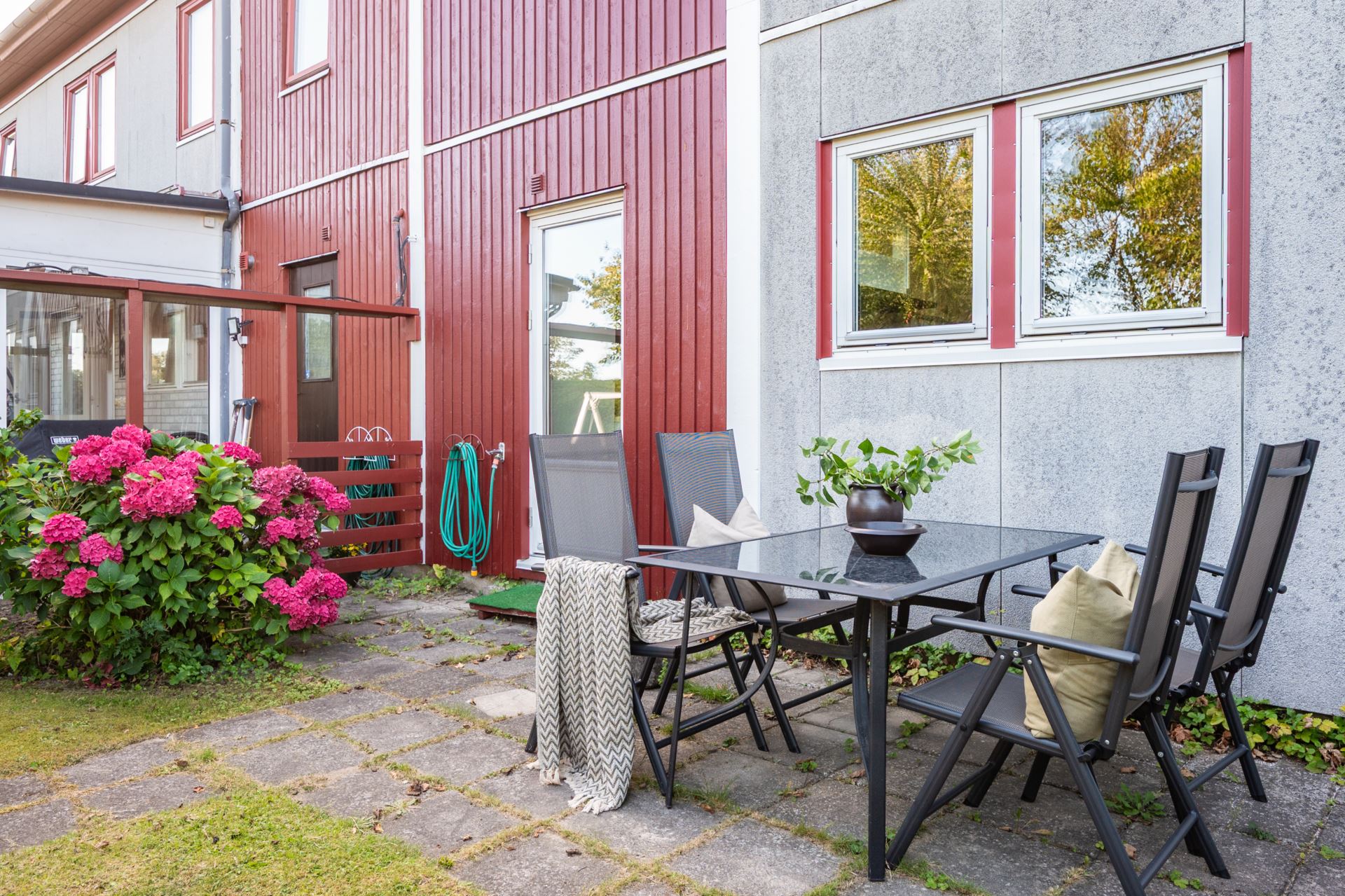 Lättskött och insynsskyddad tomt med trädgård i bästa solläge. Här finns både gräsmatta, plantering och uteplats. Ett förråd i trädgården samt ytterligare ett i gemensam byggnad ger gott om förvaringsmöjligheter. Garageplats finns bekvämt i längan intill huset.