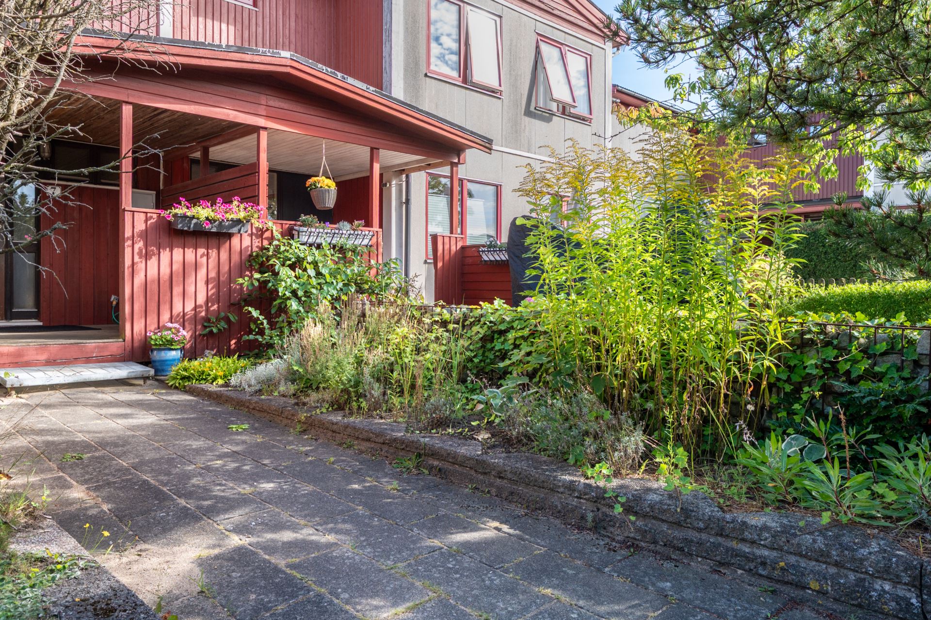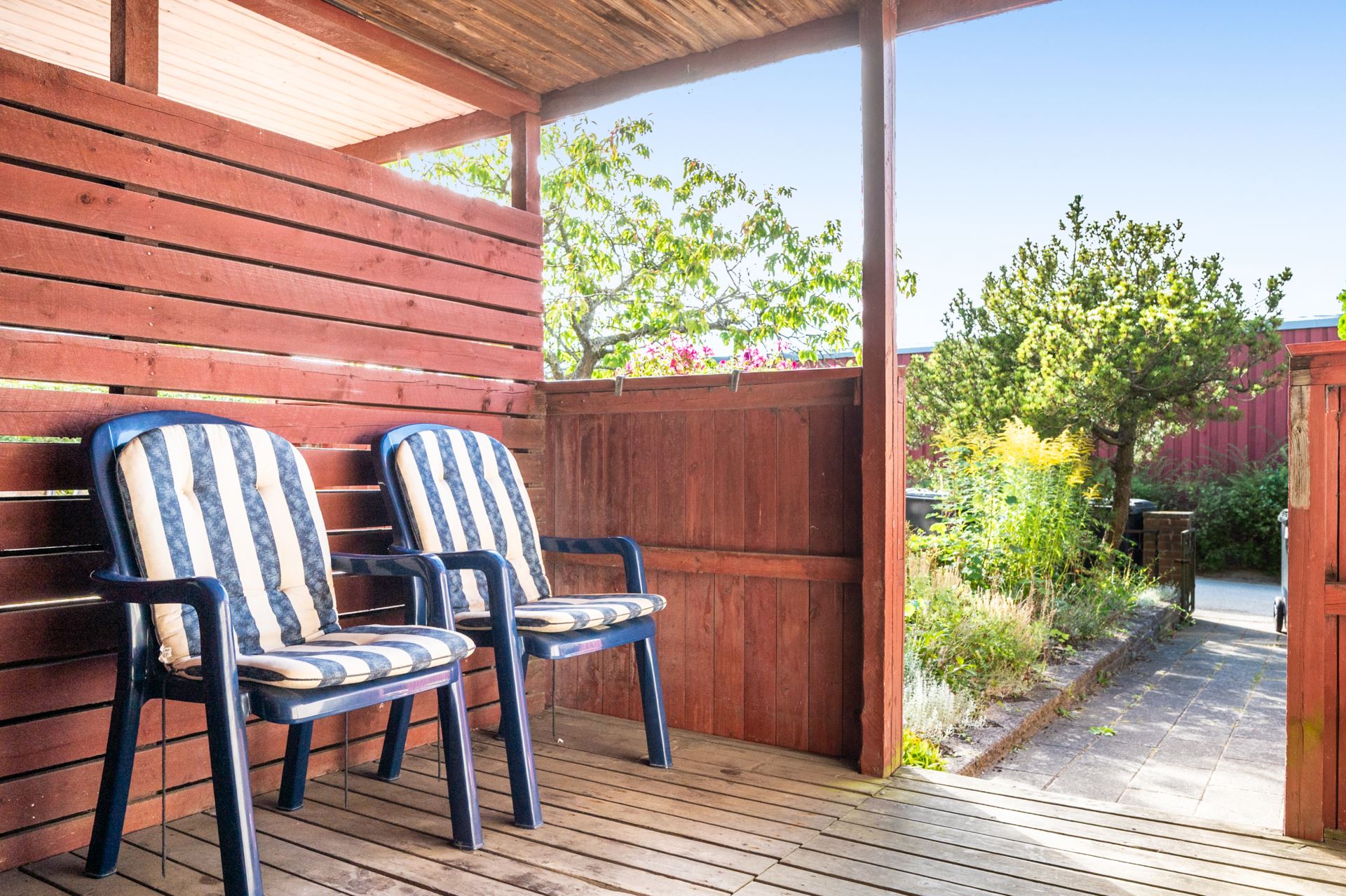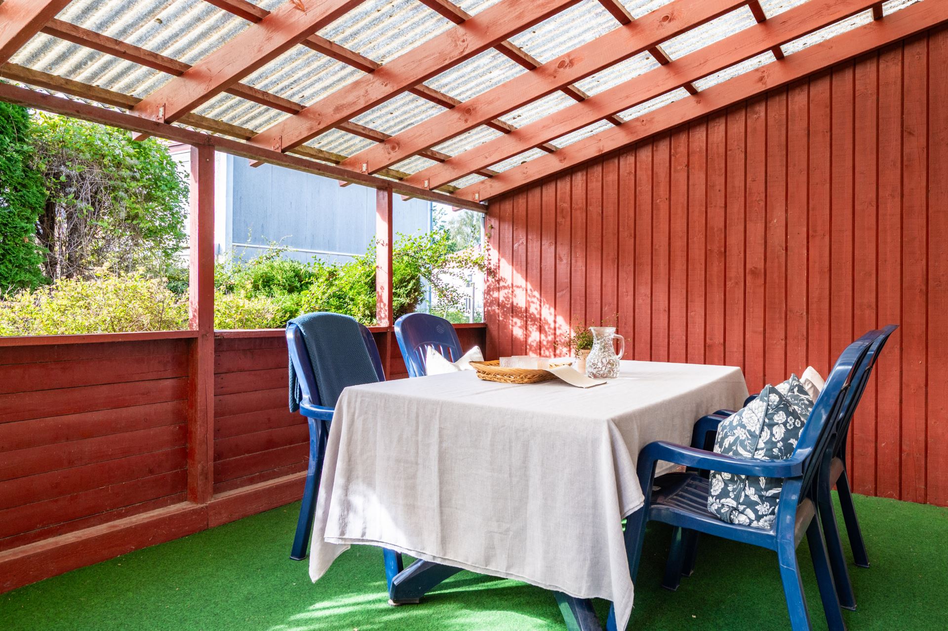 Lättskött och insynsskyddad tomt med trädgård i bästa solläge. Här finns både gräsmatta, plantering och uteplats. Ett förråd i trädgården samt ytterligare ett i gemensam byggnad ger gott om förvaringsmöjligheter. Garageplats finns bekvämt i längan intill huset.