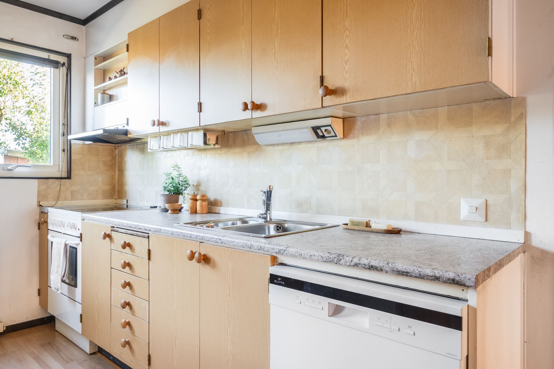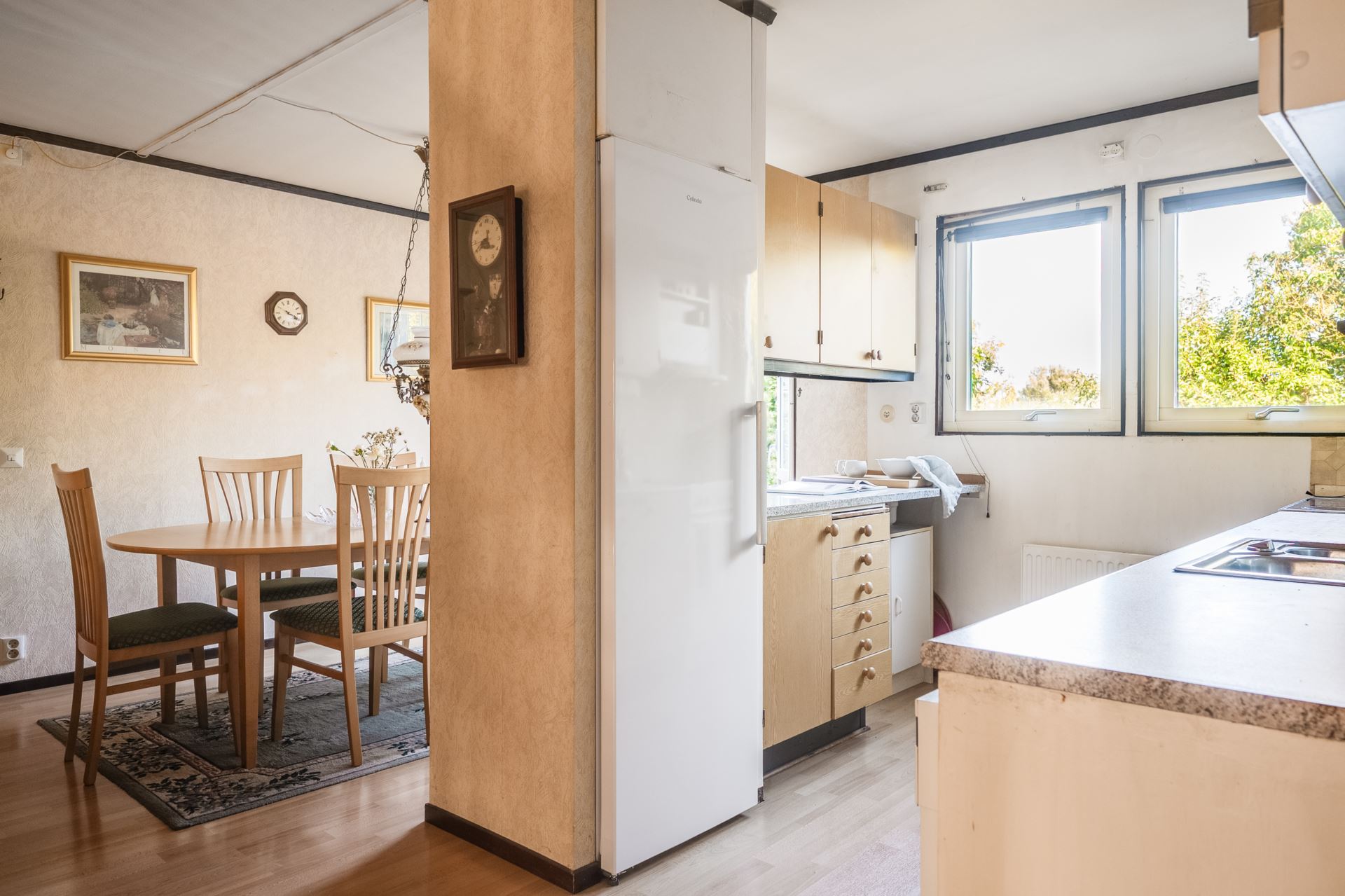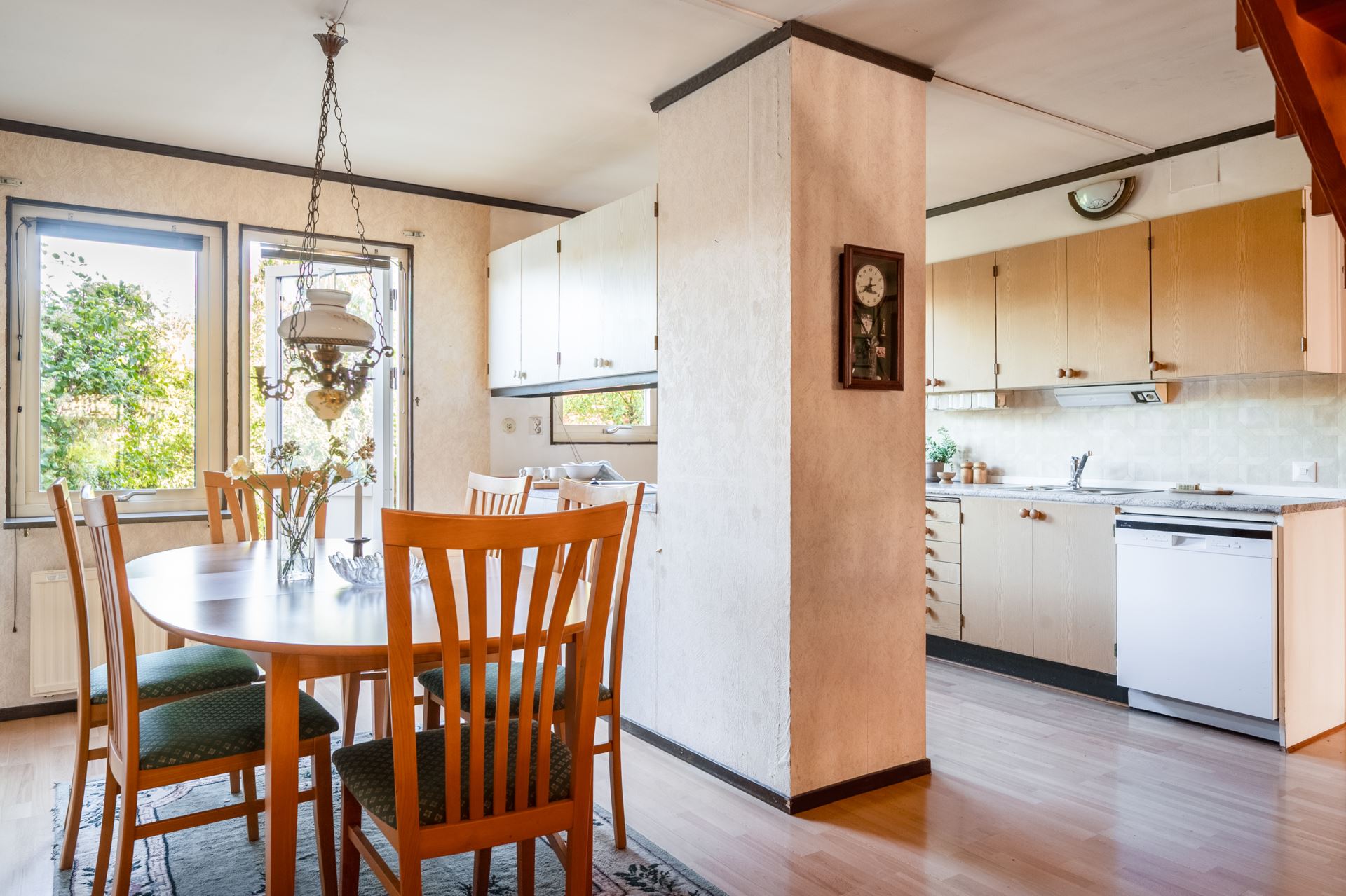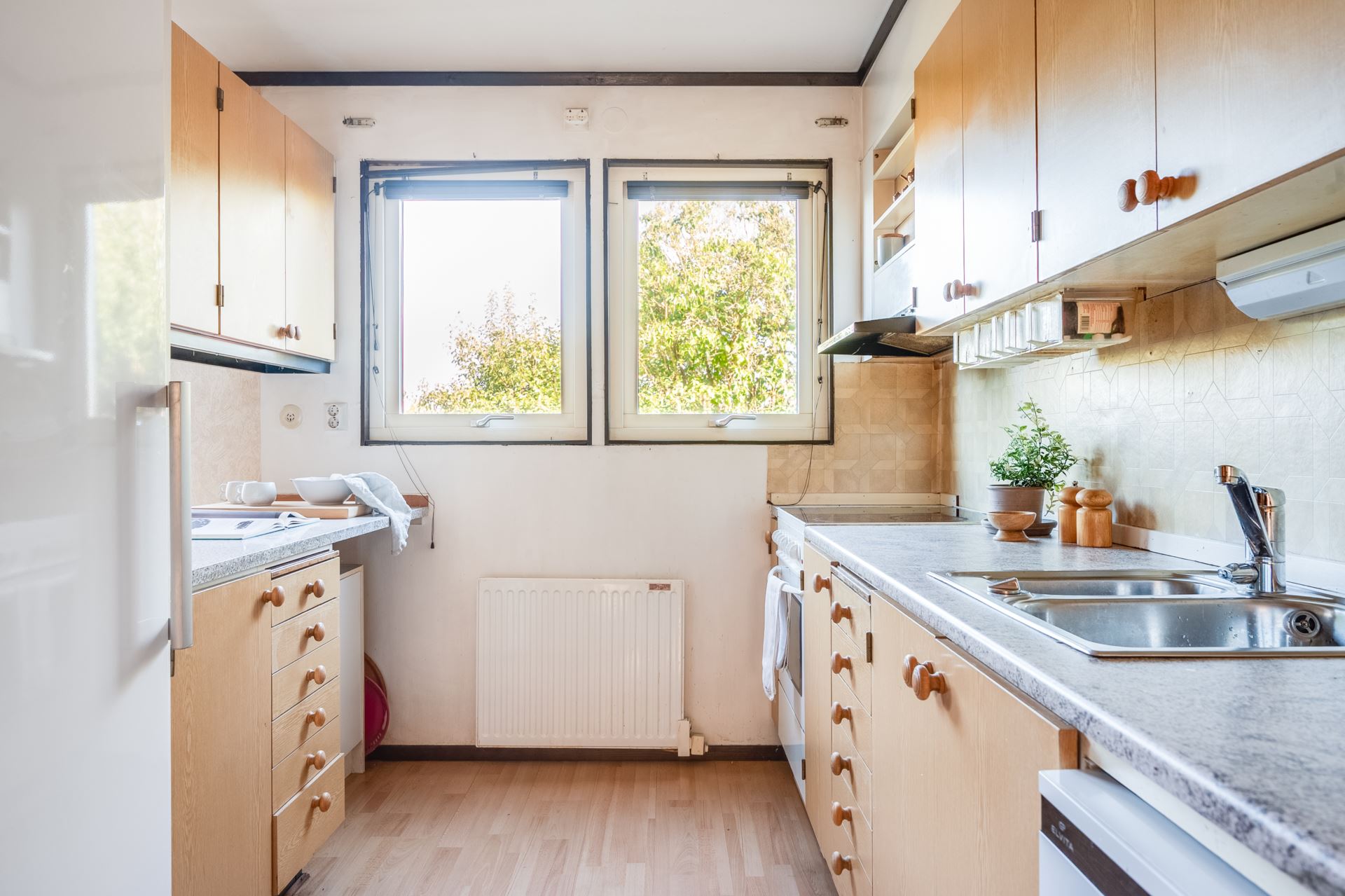 Ljust och rymligt kök med gott om arbetsytor och förvaring. Här finns plats för ett rejält matbord invid fönstren med utsikt mot baksidans trädgård. Maskinell utrustning består av kyl (2023) diskmaskin (2023), spishäll med ugn samt fläkt (defekt). Som pricken över i:et ges här en direkt utgång till trädgården.