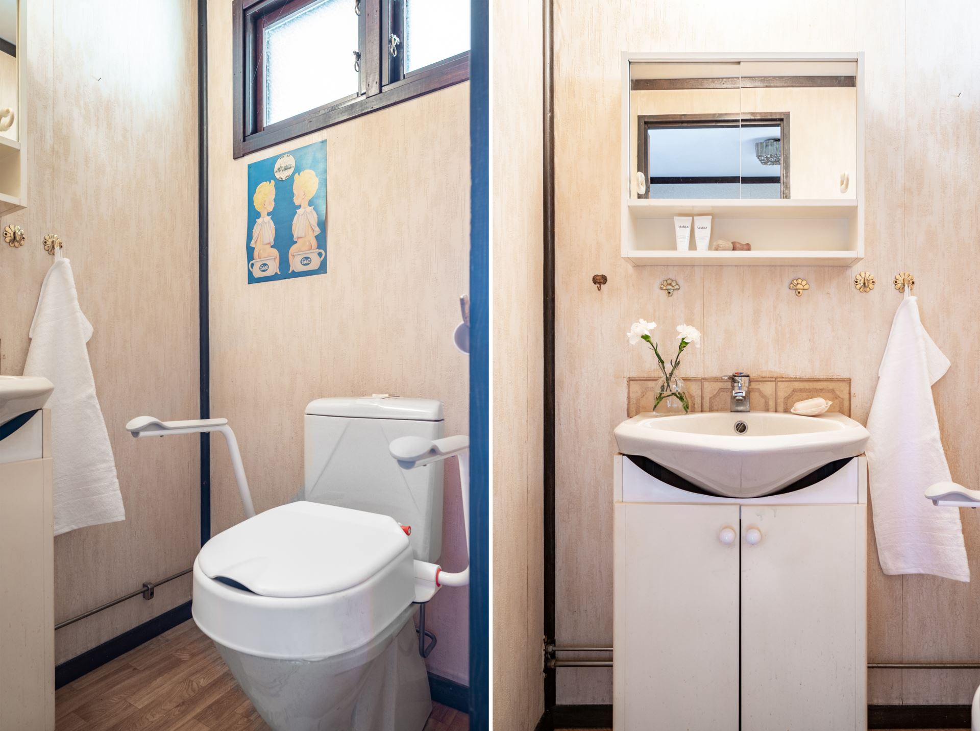 Gäst-wc i ljusa toner med wc, handfat med underskåp och spegelskåp. Praktiskt placerat i anslutning till hall och vardagsrum.