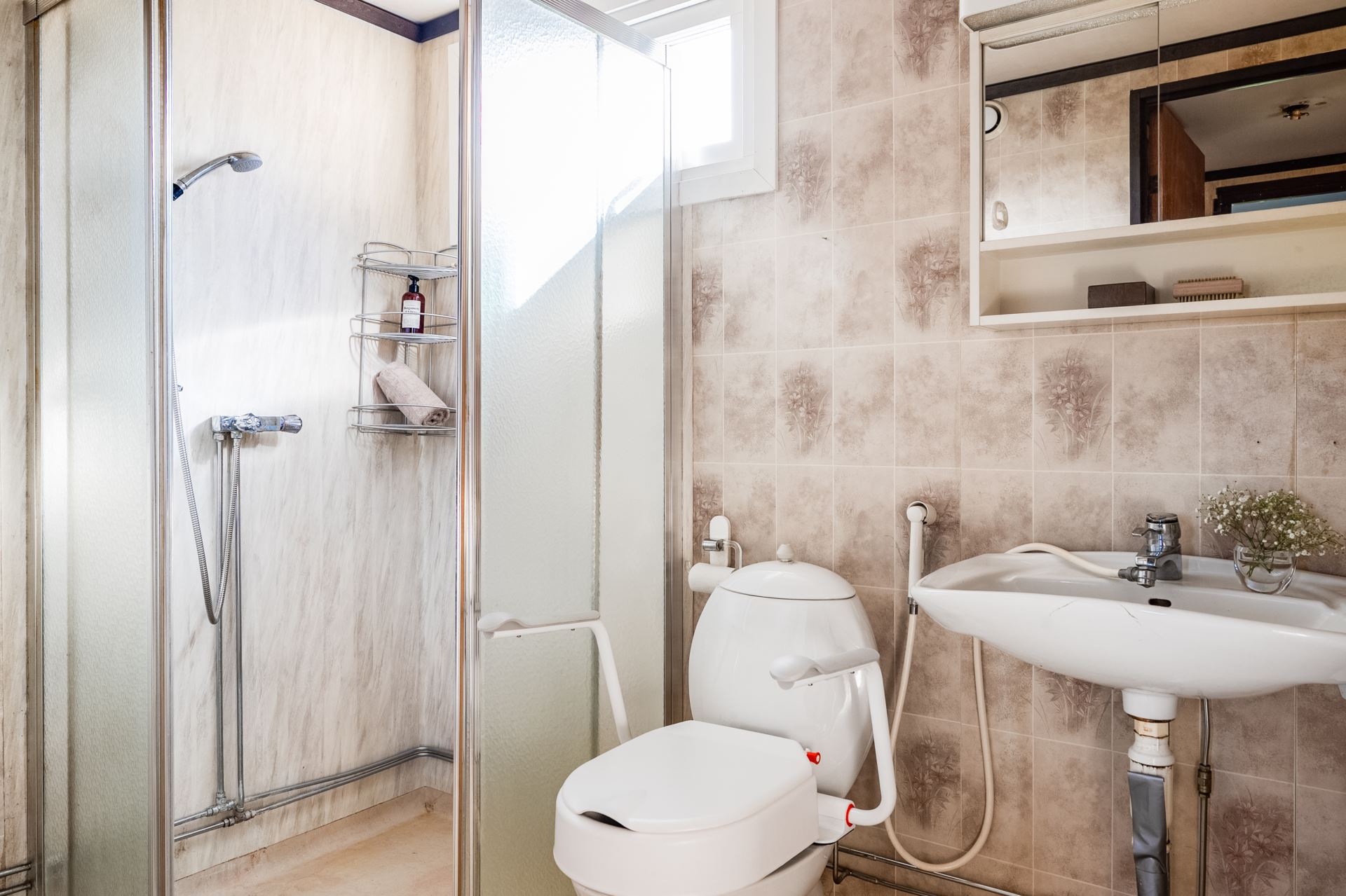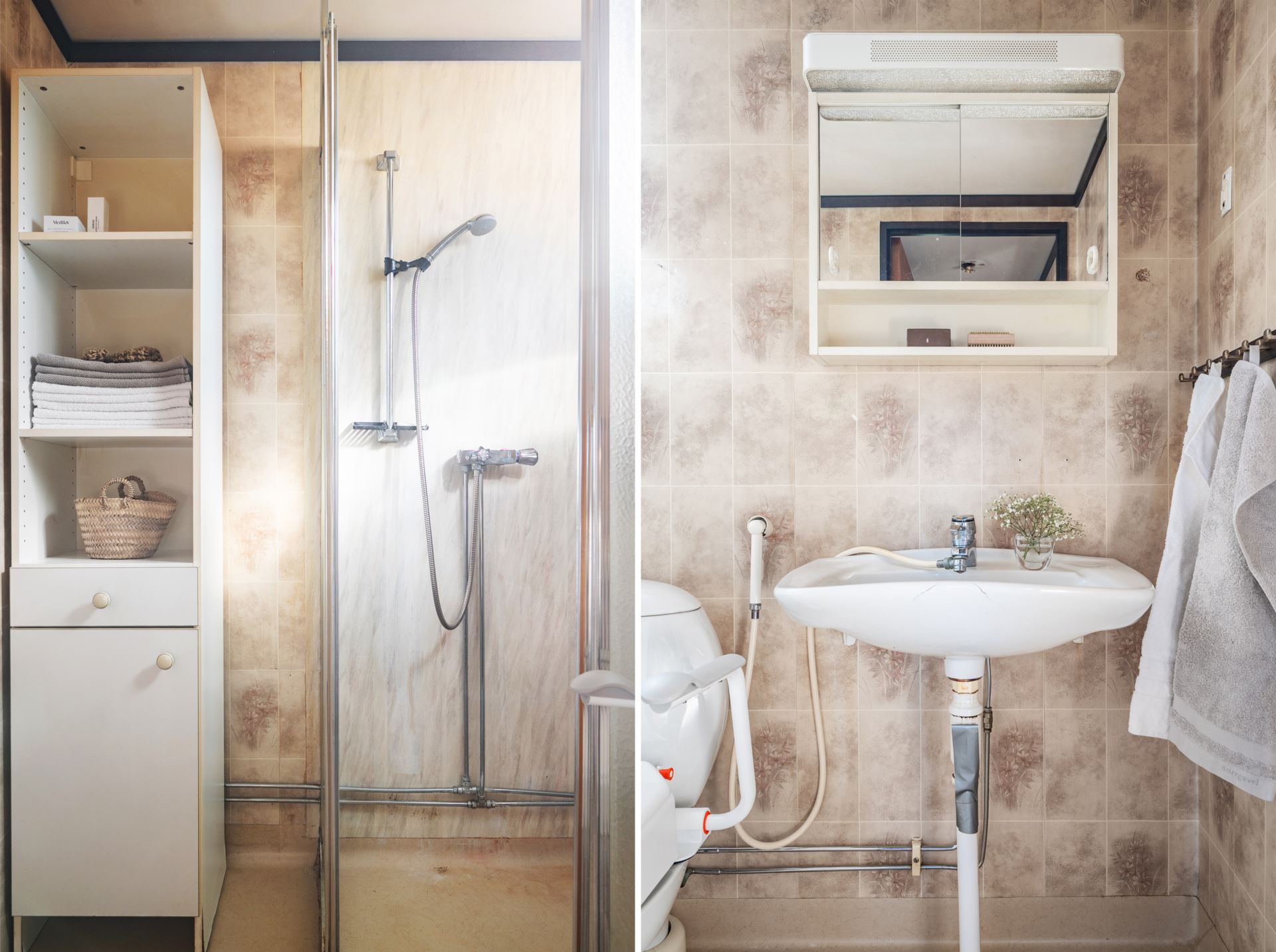 Rymligt badrum med våtrumstapet och plastmatta, utrustat med duschväggar, wc, handfat och spegelskåp. Ett fönster ger både dagsljus och god vädringsmöjlighet.