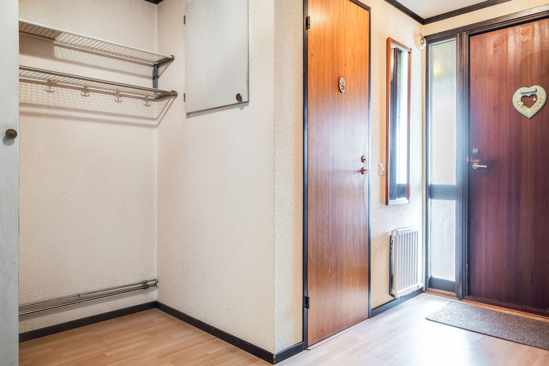 Välkomnande hall med praktiskt ljust laminatgolv och gott om förvaring i garderob hatthylla. Härifrån når du gäst wc, tvättstuga och resten av entréplanet.