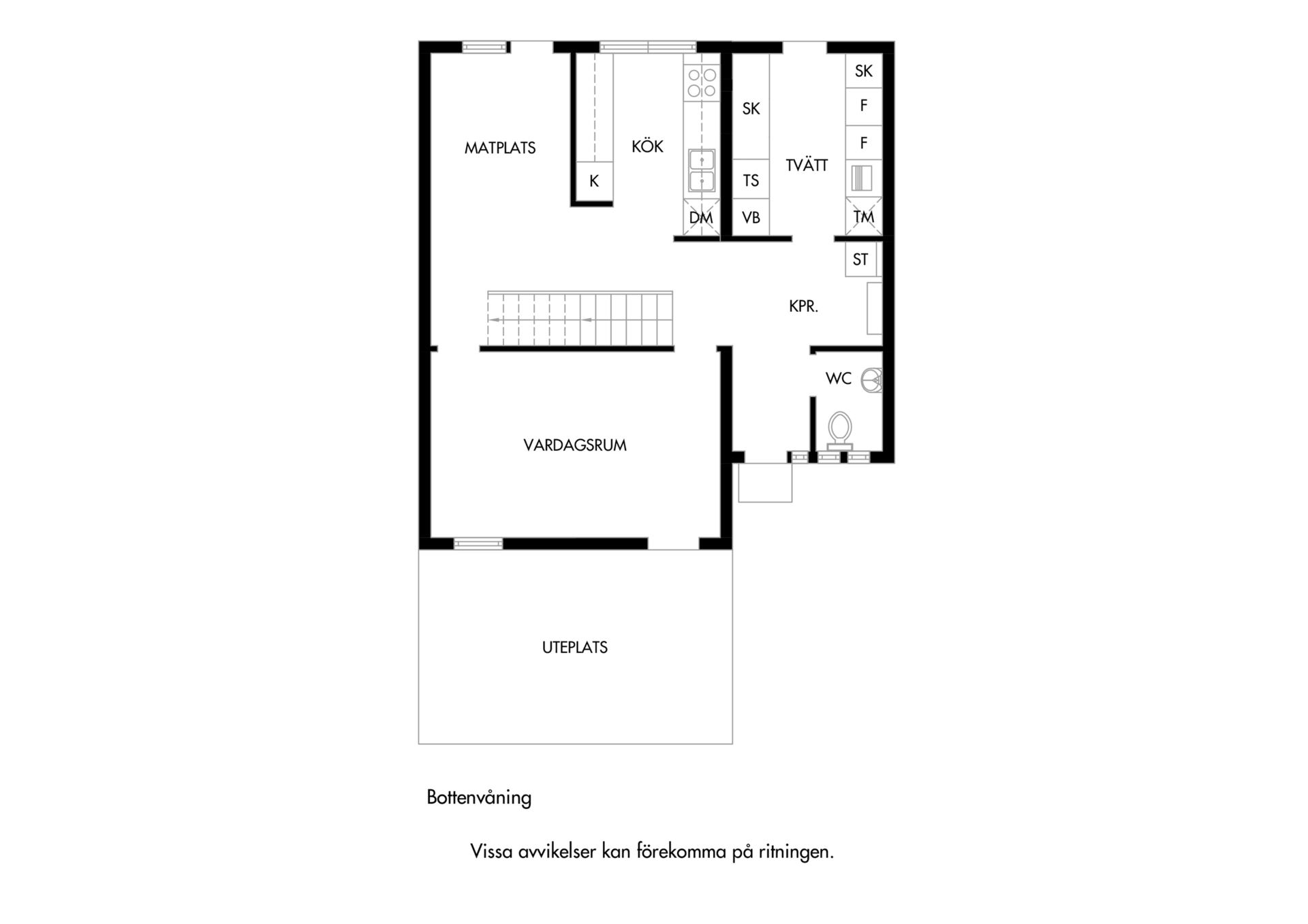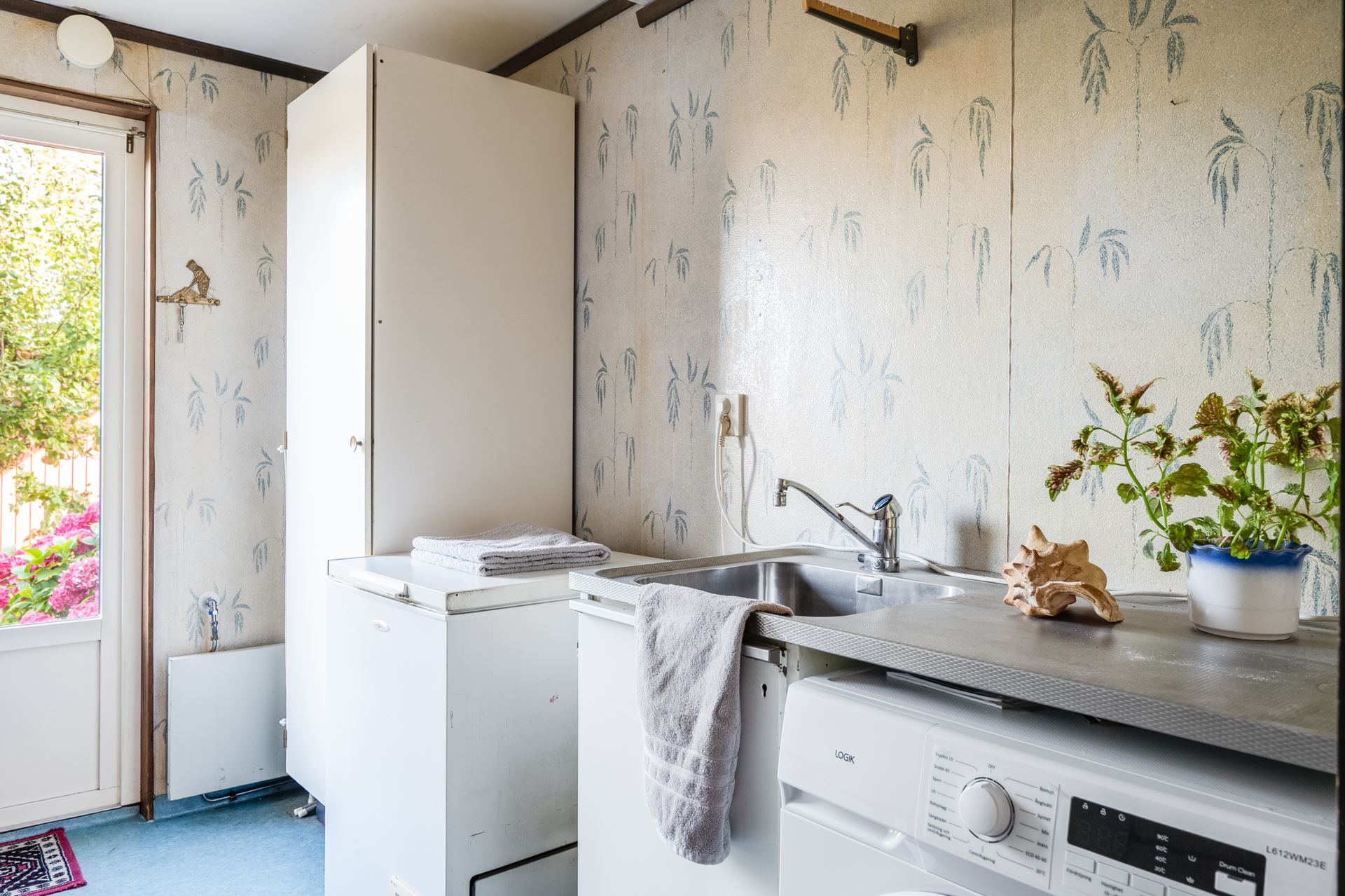 Separat tvättstuga med tvättmaskin (2024), torkskåp, garderober, diskho med arbetsyta och frys. Här finns även en praktisk groventré mot trädgården.