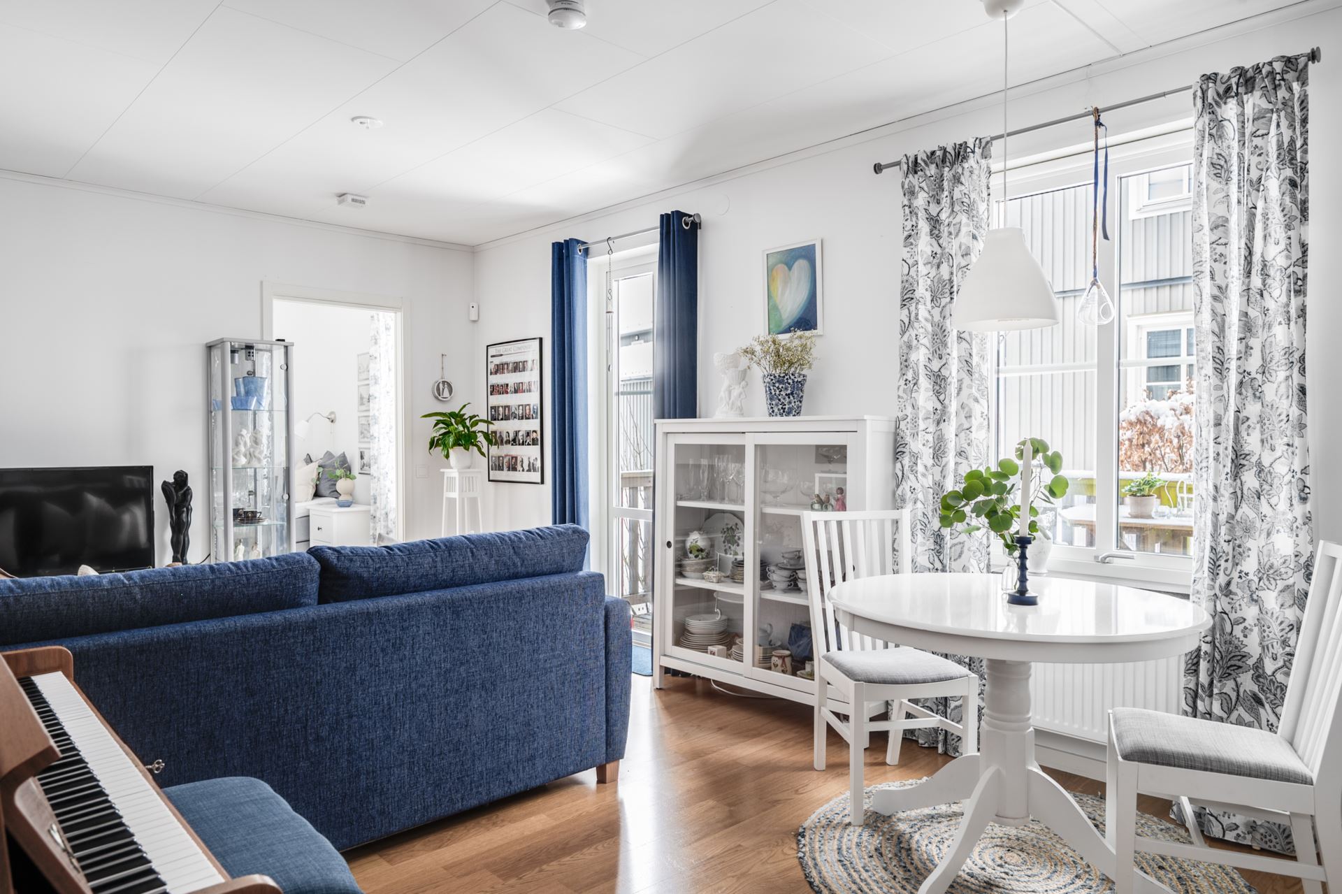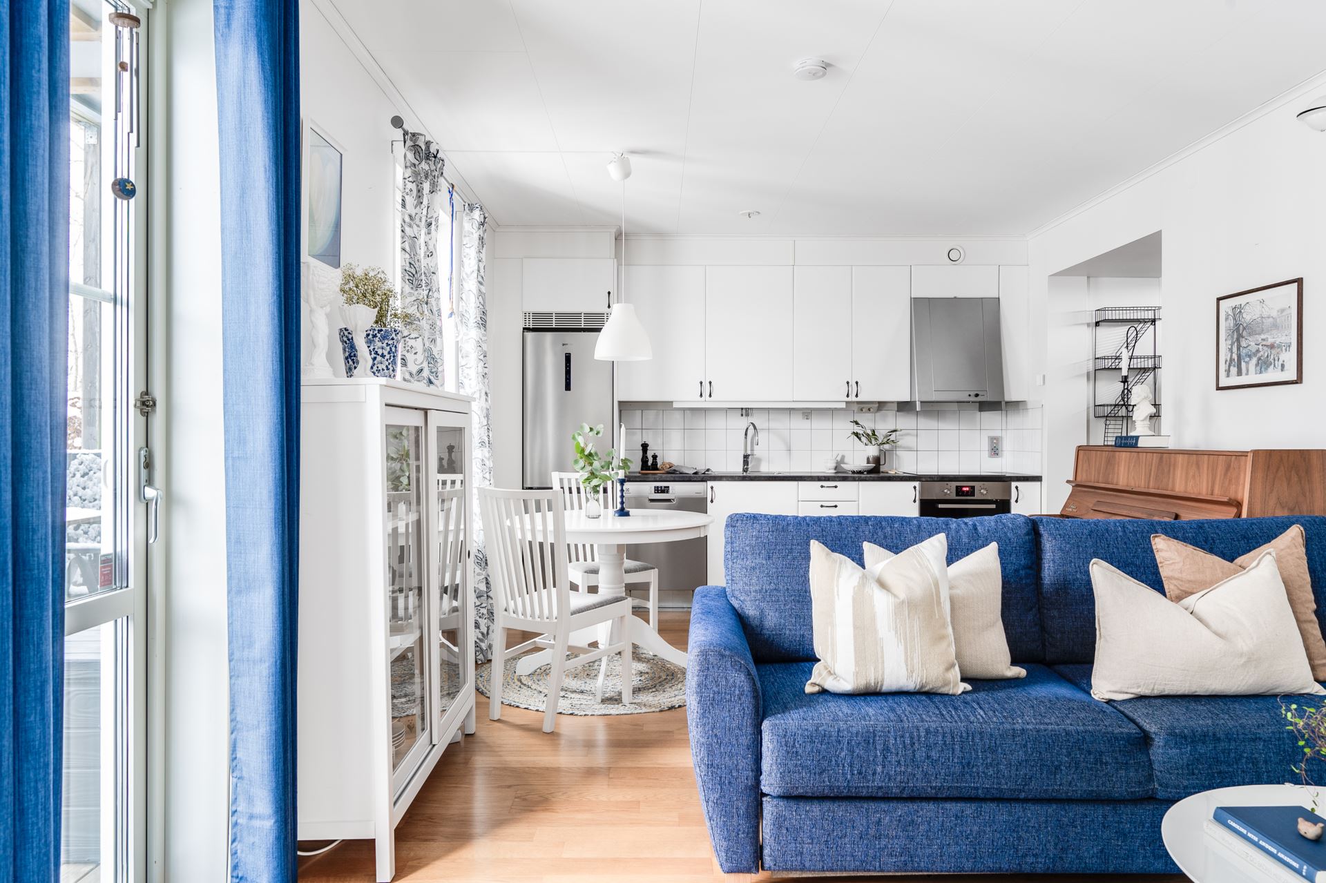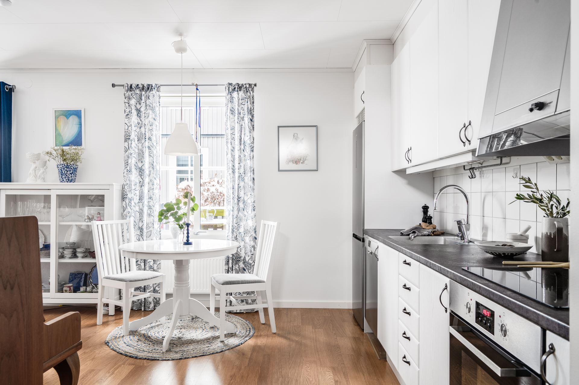 Vidare in når du vardagsrum och kök i en öppen planlösning. Parkettgolv pryder golvet och väggarna går i vitt. Här ryms så väl soffgrupp som matrumsmöblemang. Härliga fönsterpartier skänker rikligt med ljus åt rummet. Det är även härifrån du når den inbjudande terrassen med direktaccess till den grönskande omgivningen och trädgården.