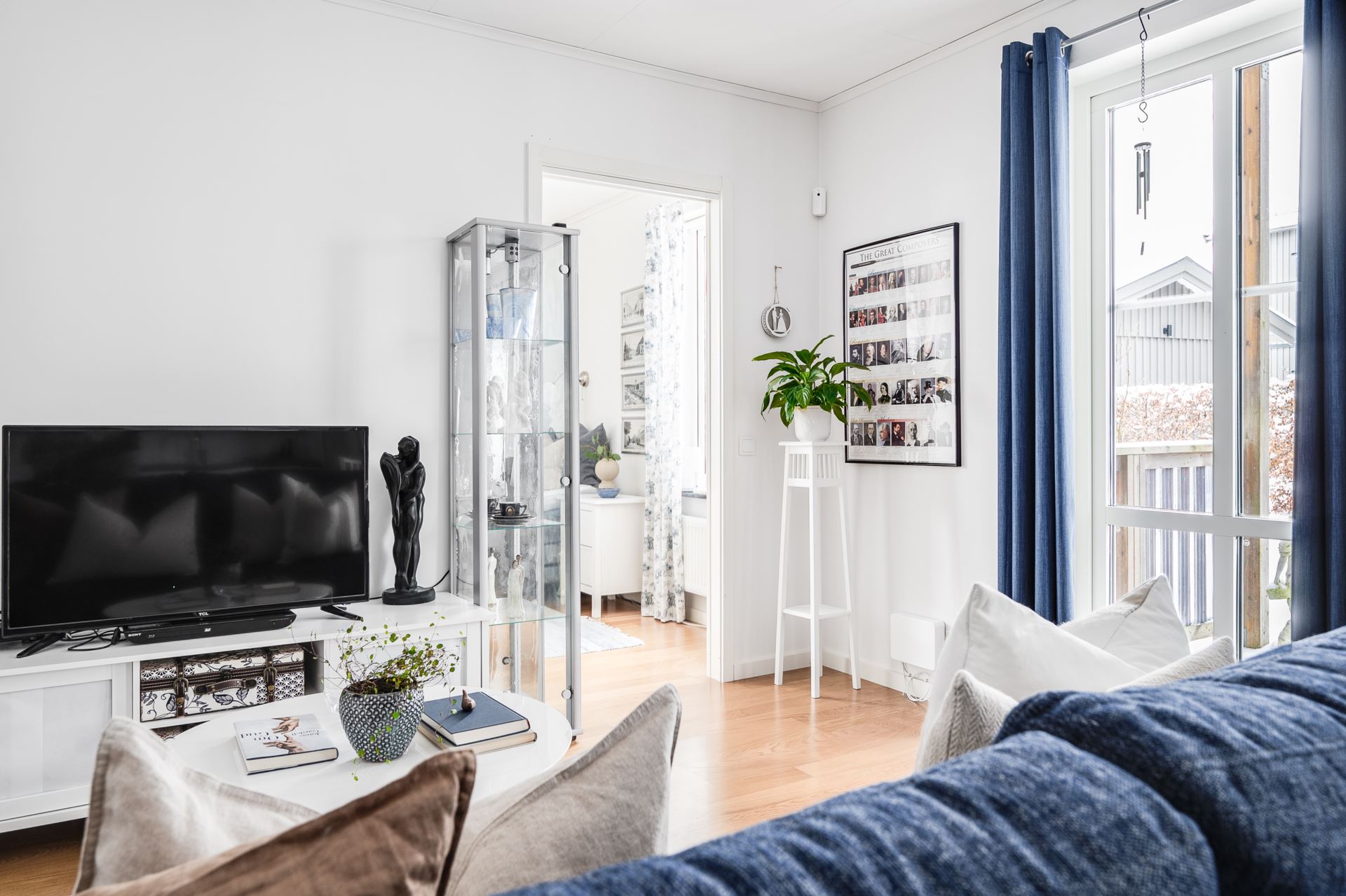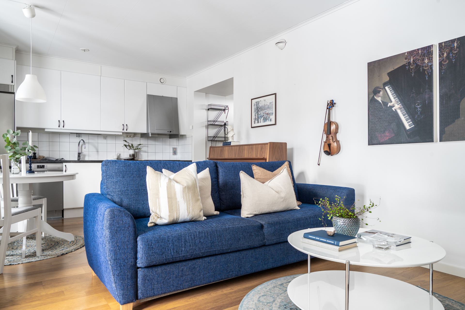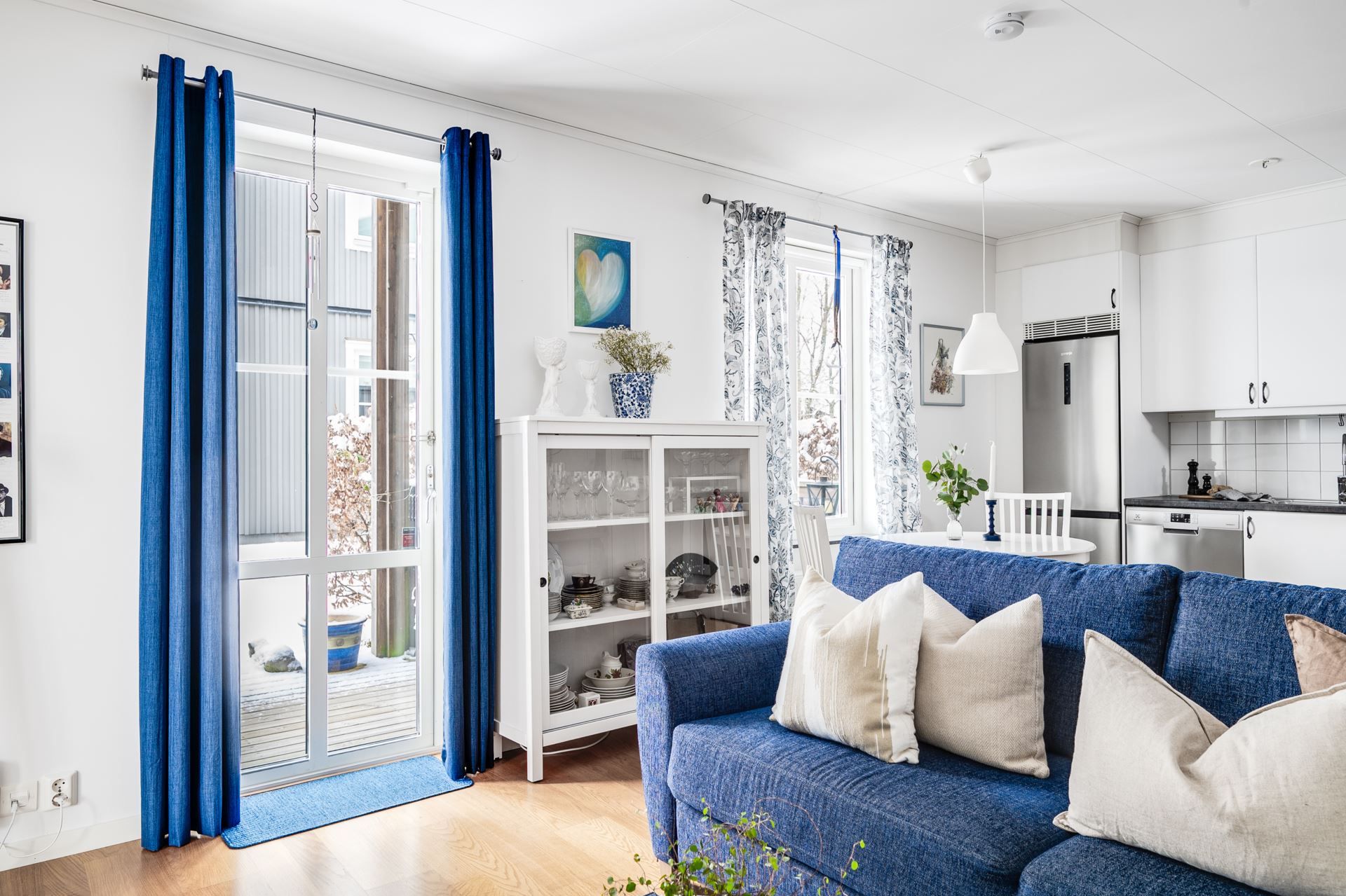 Vidare in når du vardagsrum och kök i en öppen planlösning. Parkettgolv pryder golvet och väggarna går i vitt. Här ryms så väl soffgrupp som matrumsmöblemang. Härliga fönsterpartier skänker rikligt med ljus åt rummet. Det är även härifrån du når den inbjudande terrassen med direktaccess till den grönskande omgivningen och trädgården.