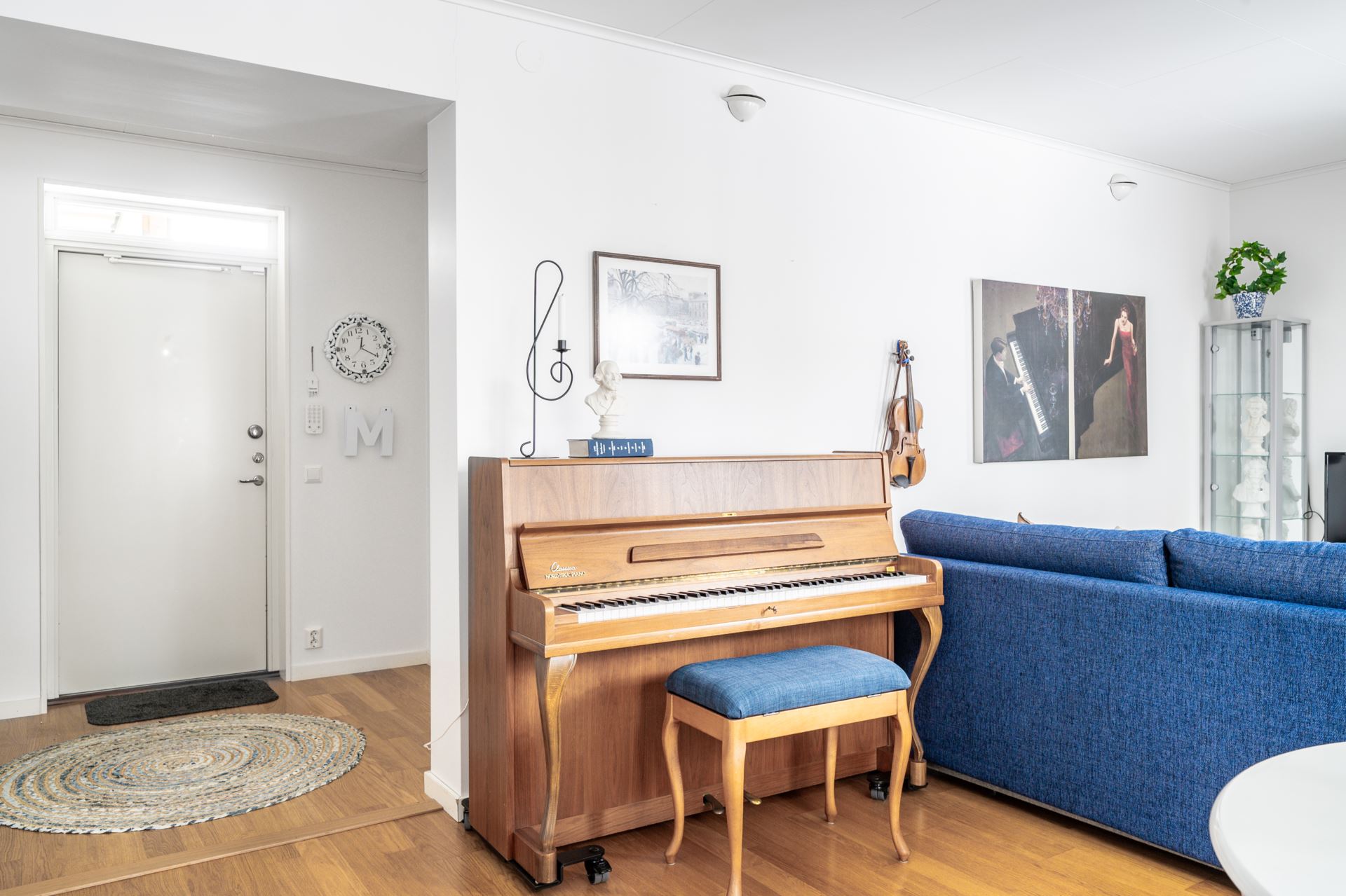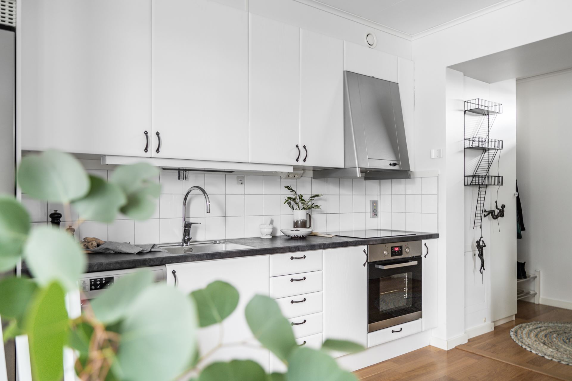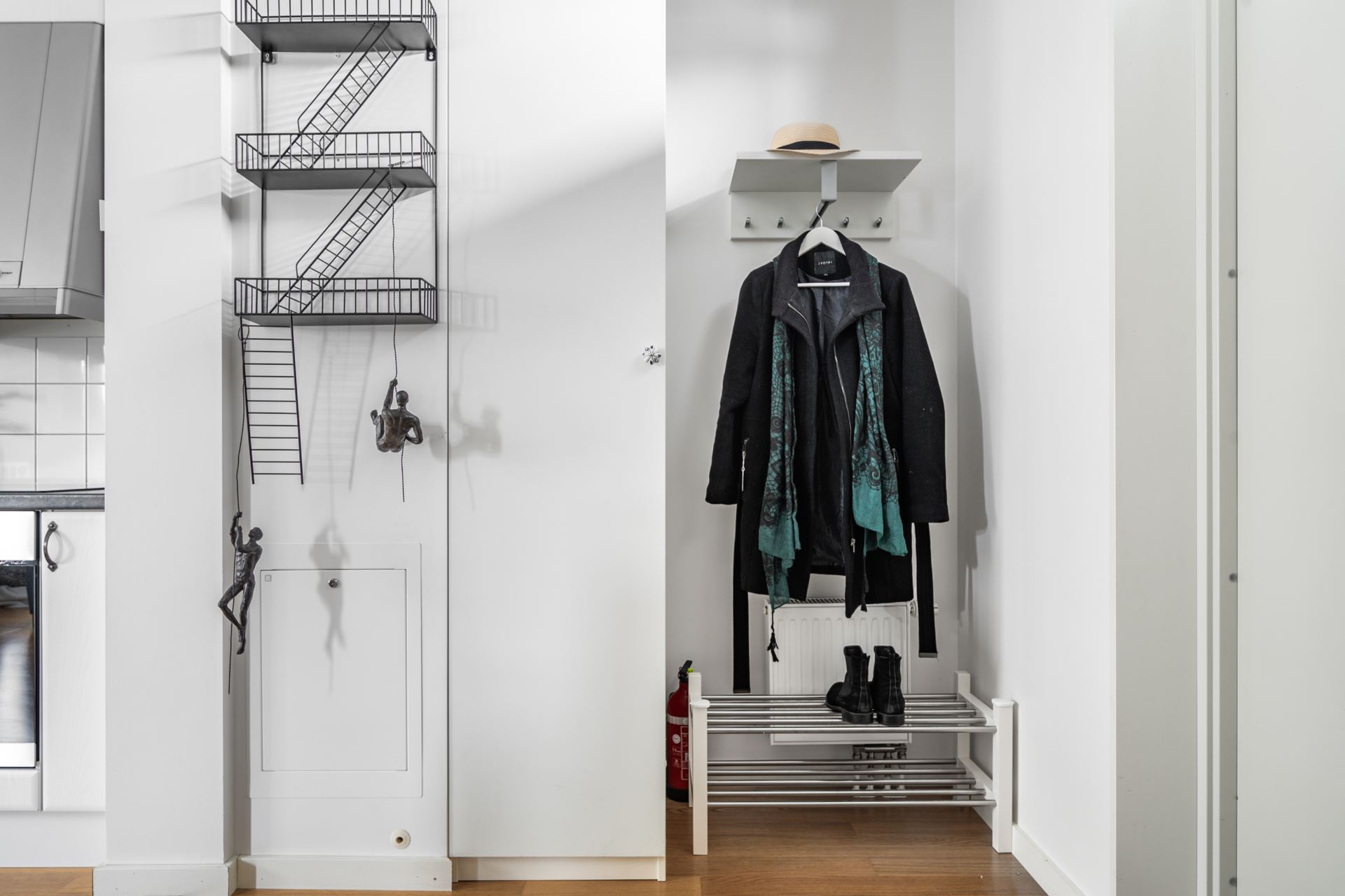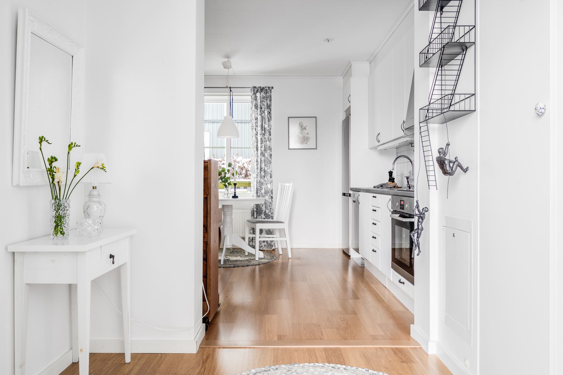 Hallen tar emot med möblerbara ytor och snyggt parkettgolv i kombination med vita väggar. Förvaring finns i form av en platsbyggd garderob och hatthylla.