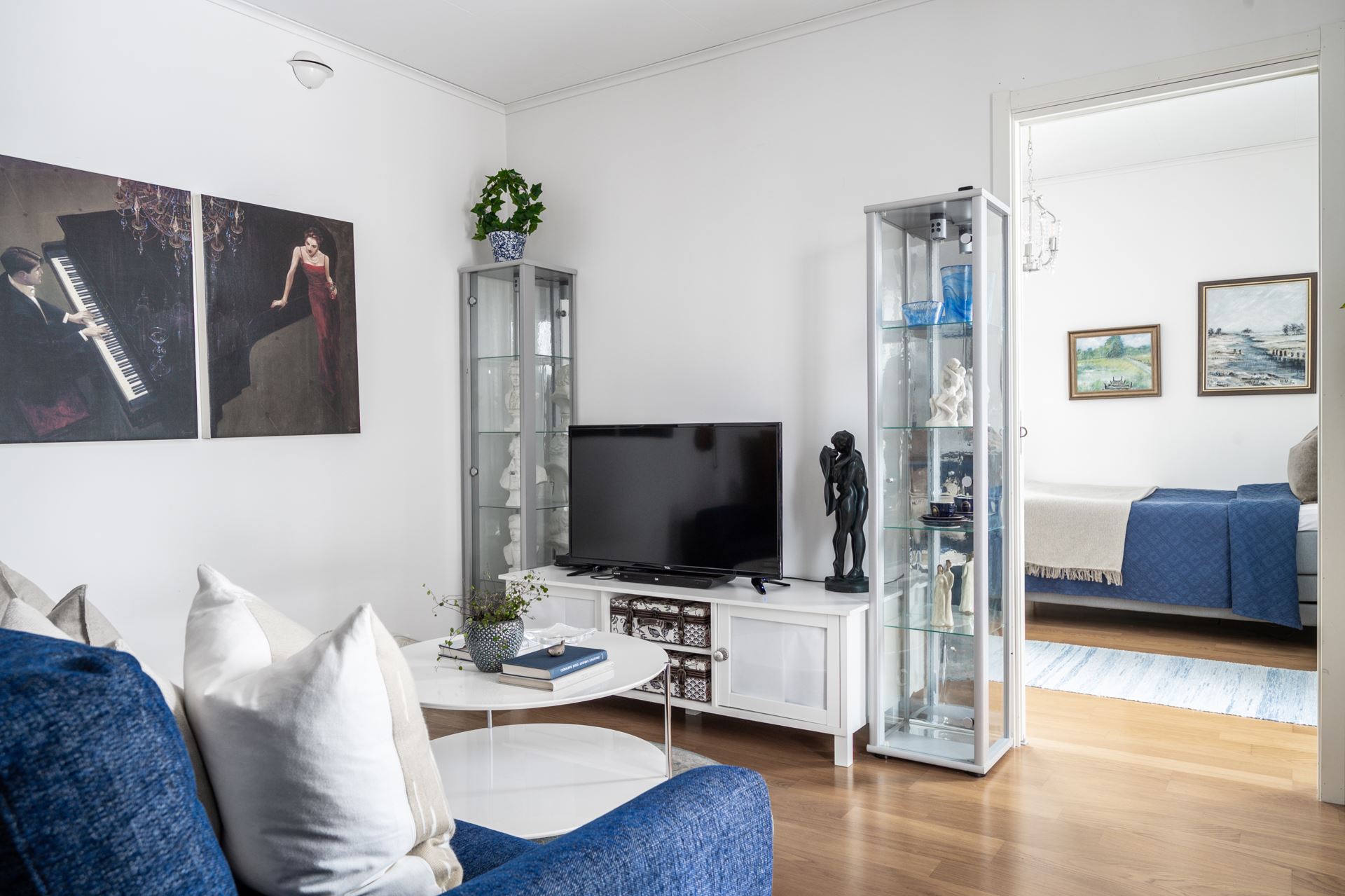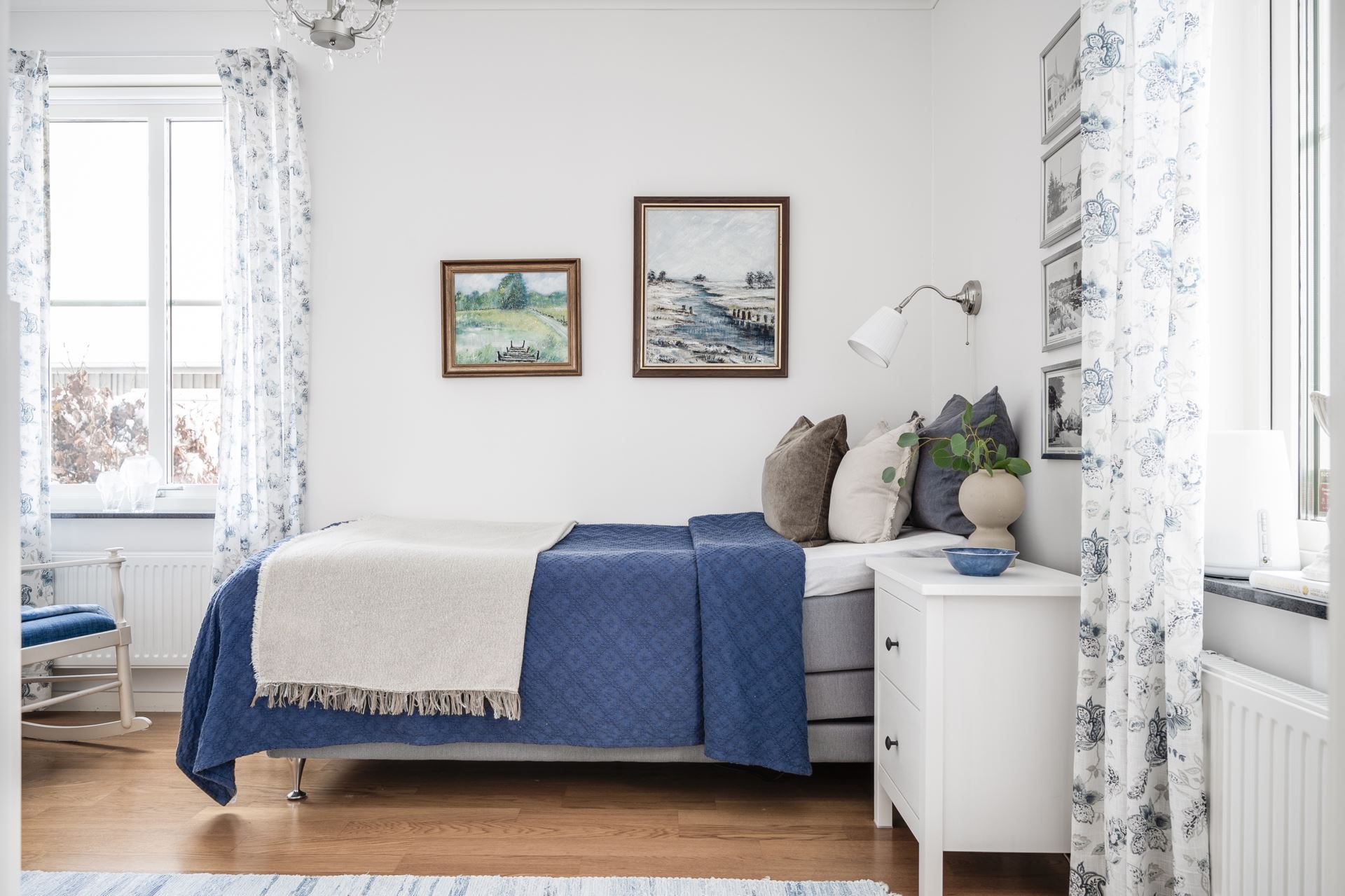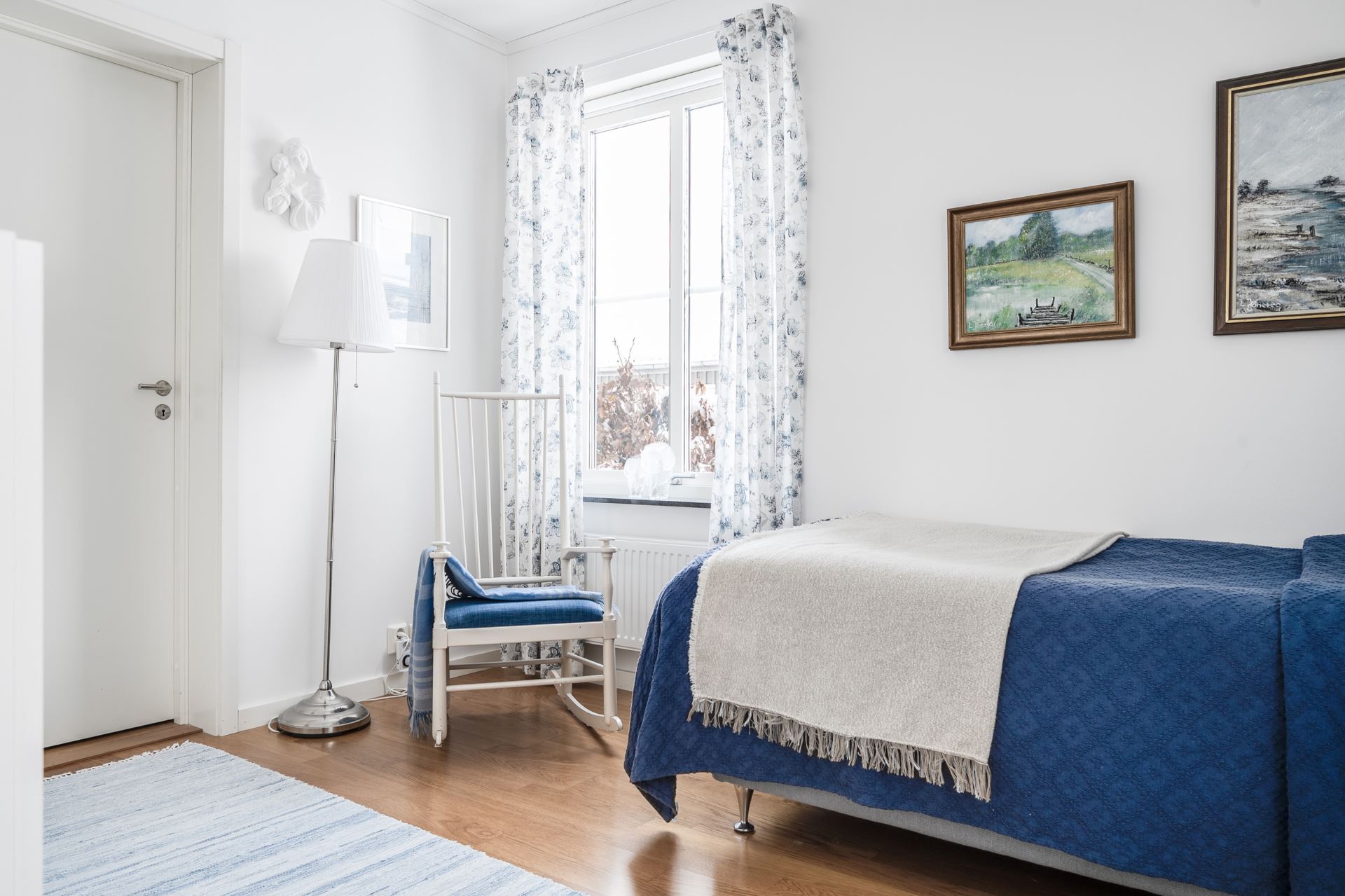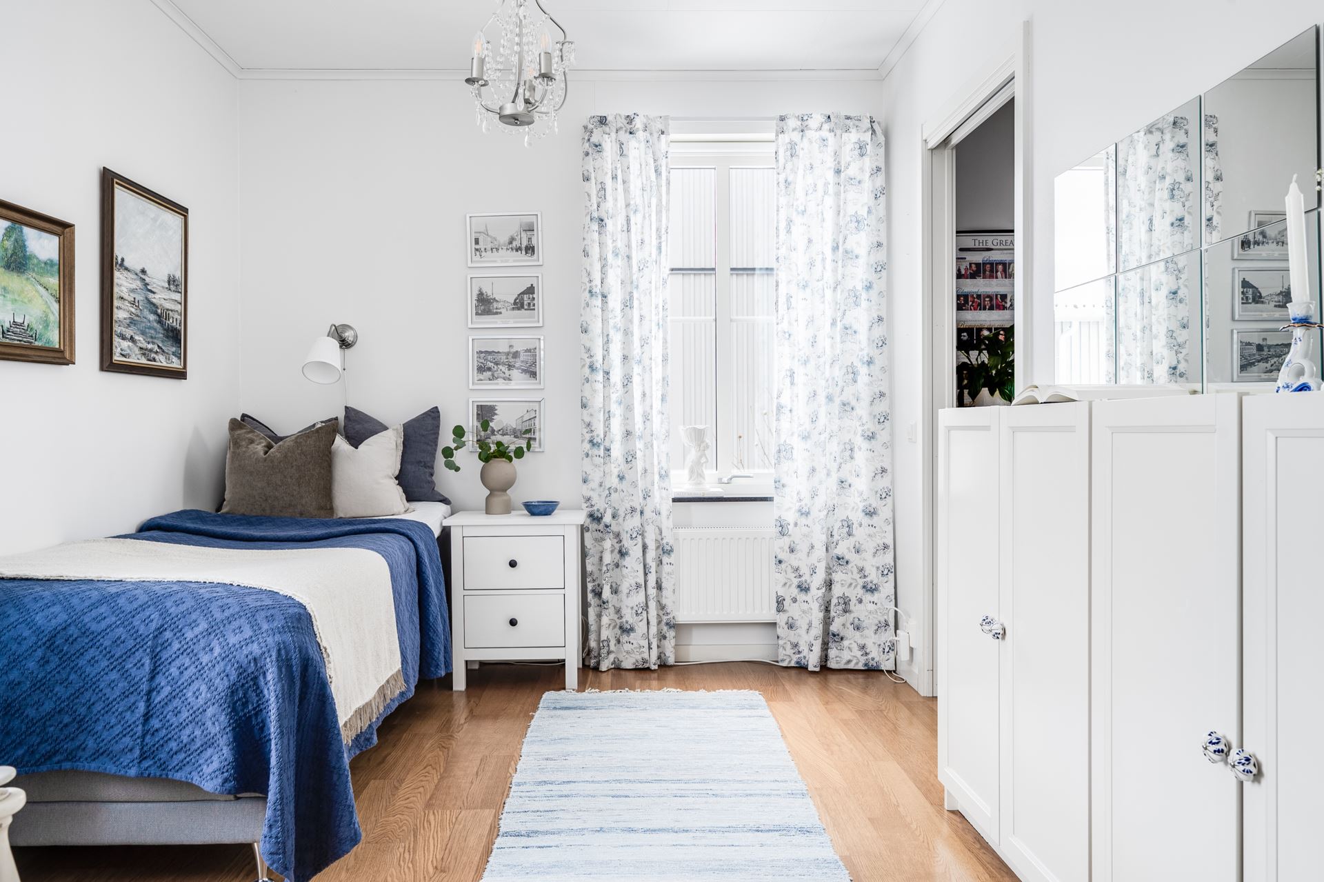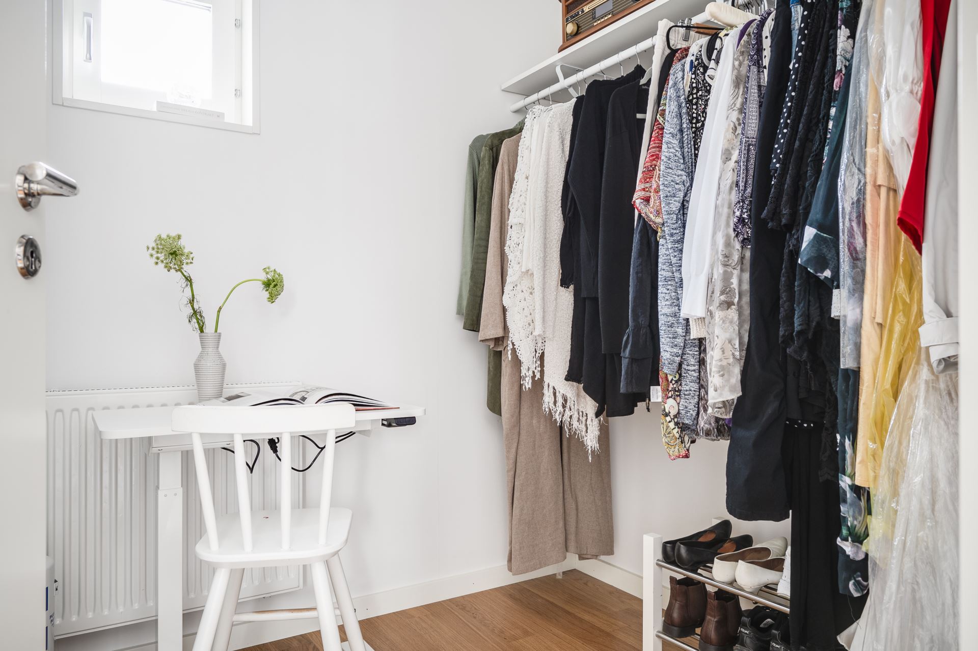 Genom vardagsrummet kommer vi in i det rymliga sovrummet med samma snygga parkettgolv och krispiga vita väggar som övriga kvadrat i bostaden. Här ryms både säng och förvaringsmöbel om så skulle önskas. Från sovrummet har man tillgång till bostadens walk in closet som erbjuder väldigt god förvaring.