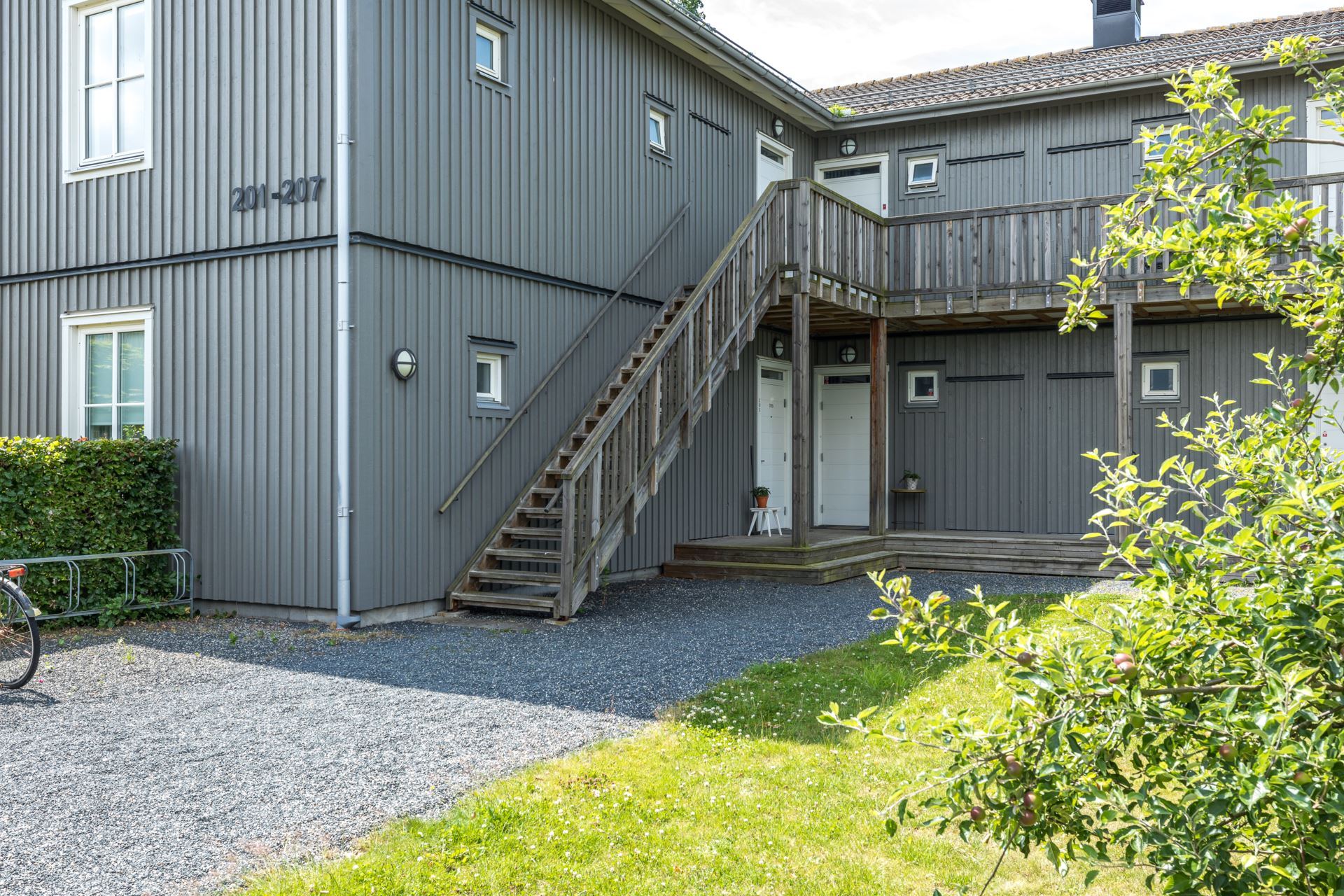 Cykelställ för medlemmar att nyttja. Gröna häckar, buskar och äppelträd är signum för BoKlok koncepten.