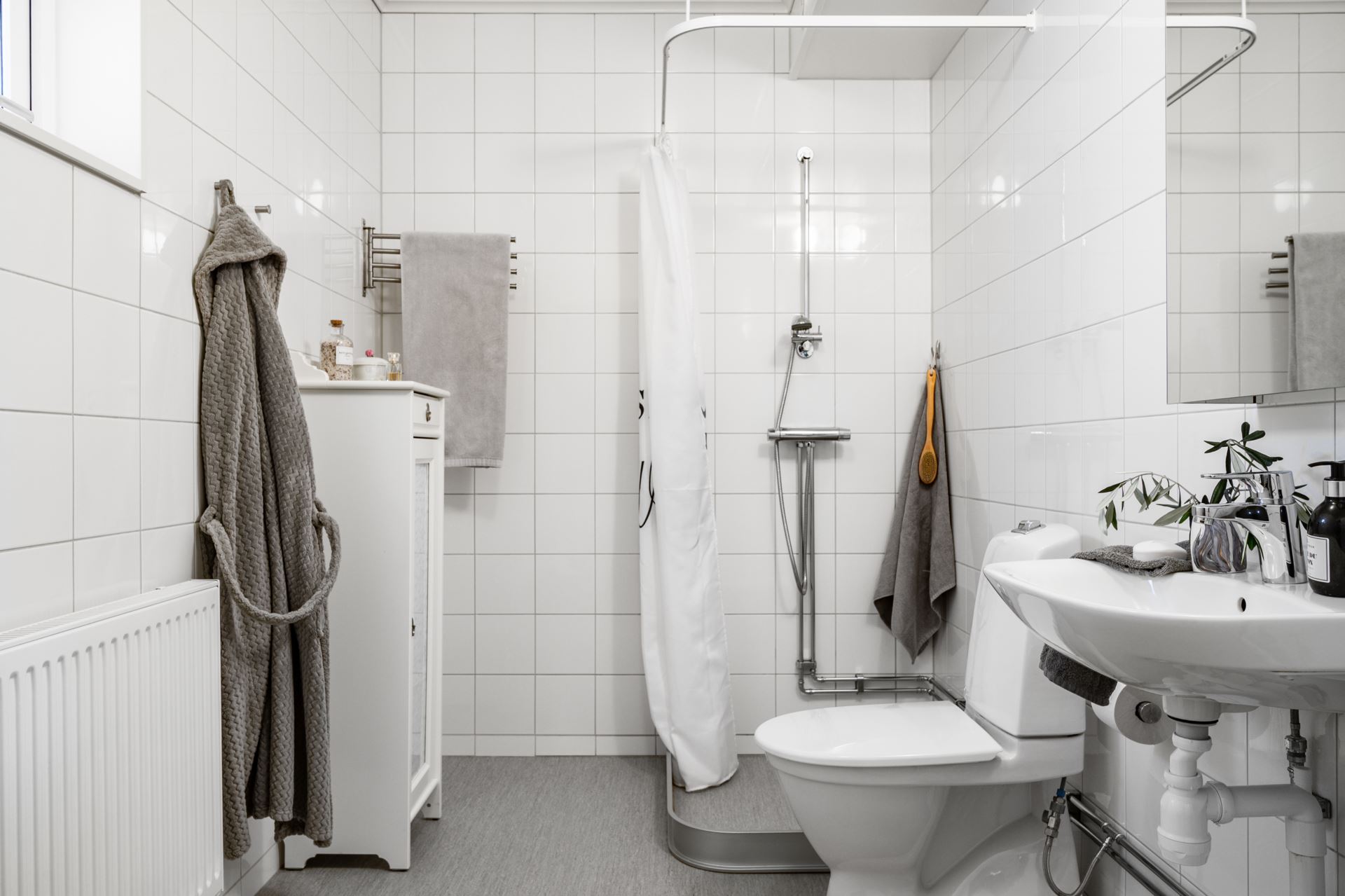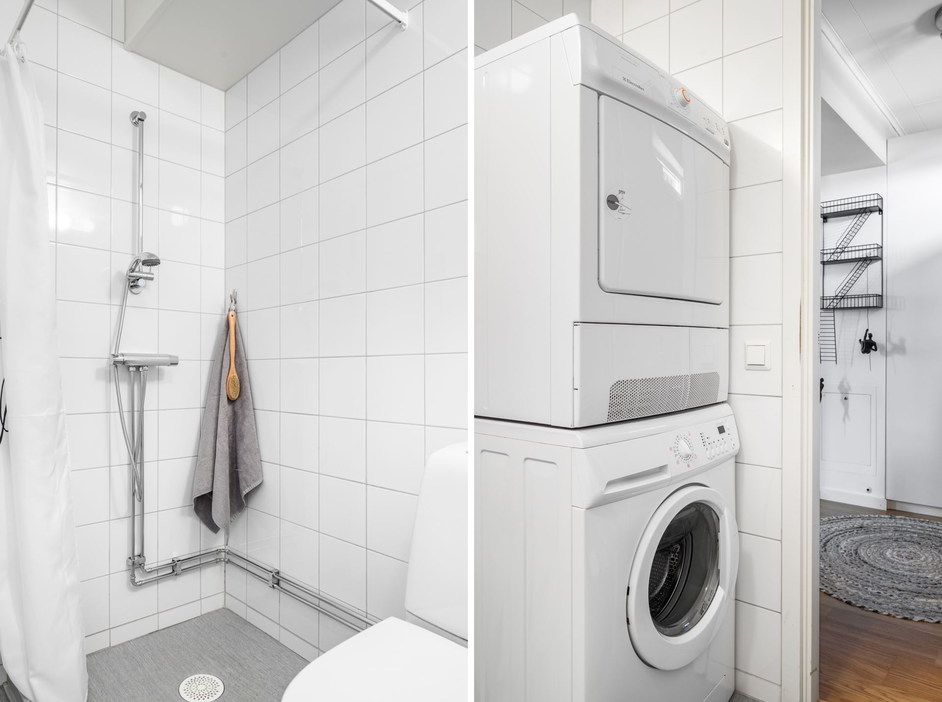 Utöver kaklade väggar i vitt och våtrumsmatta på golv erbjuder hemmets badrum även på rymliga kvadrat med ljusinsläpp från frostat fönster. Inredningen består av WC, tvättställ, badrumsskåp, dusch, tvättmaskin och torktumlare.