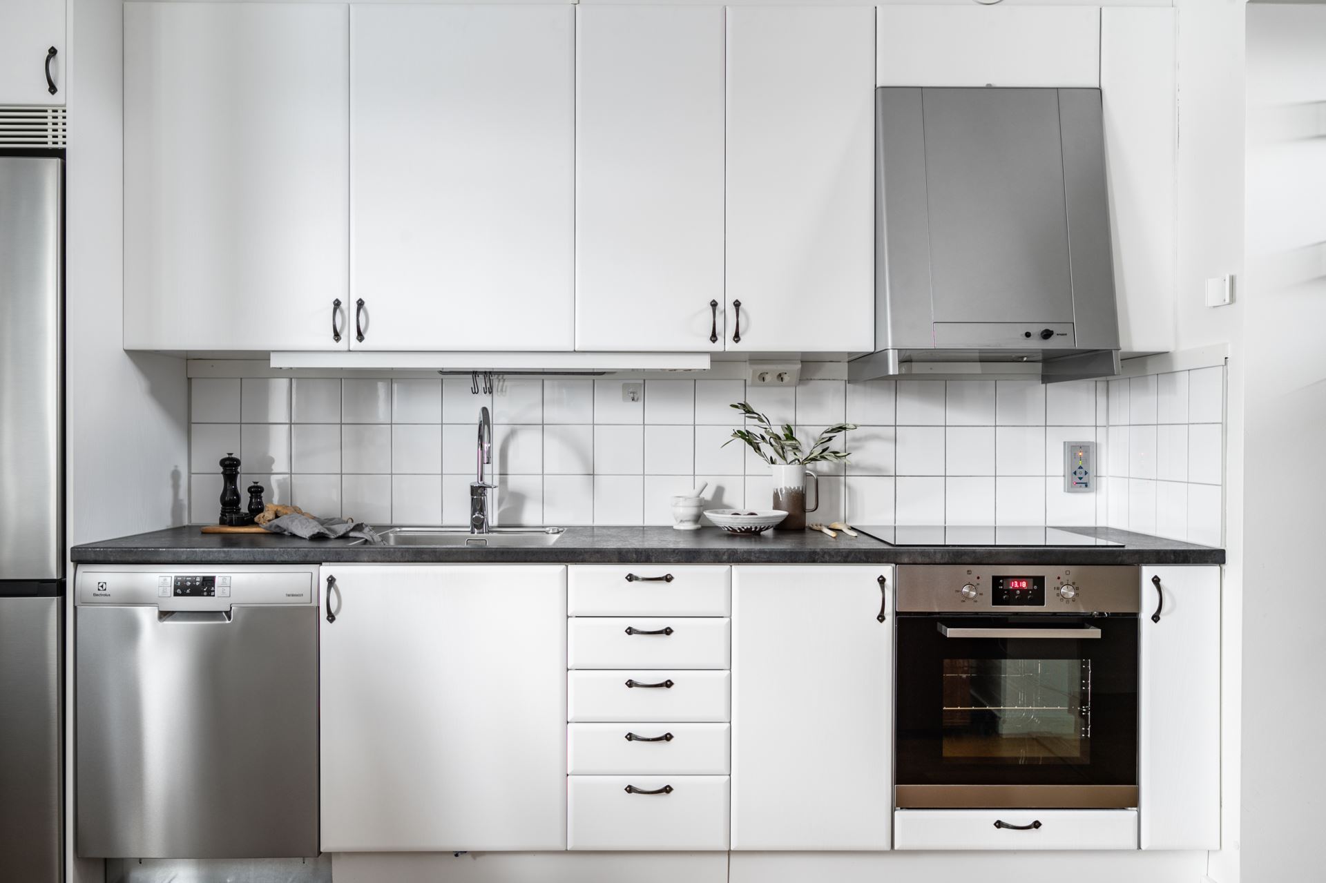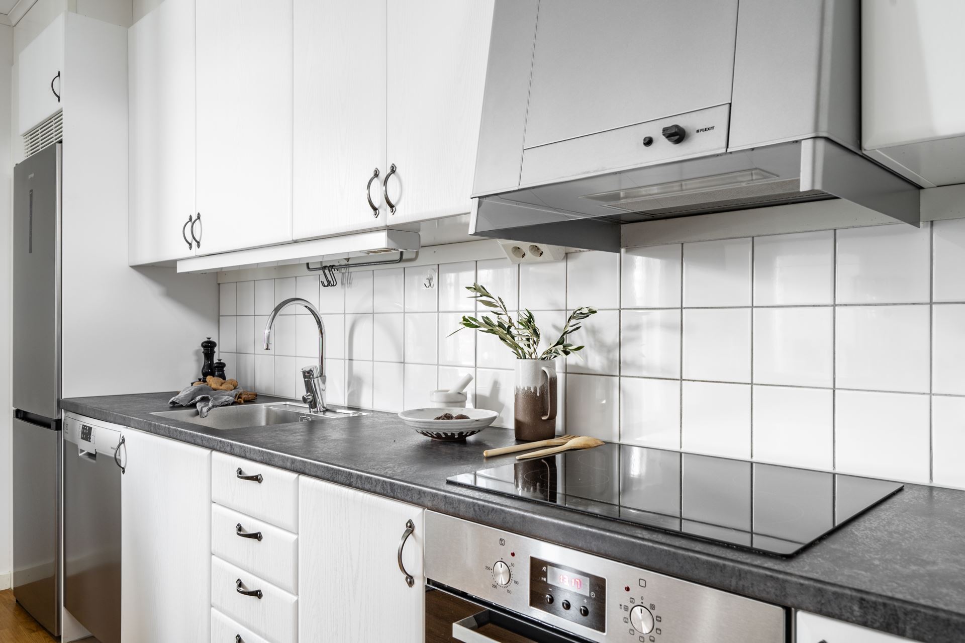 Köket är inrett med nya köksluckor och bänkskiva från 2021samt med vitt kakel ovan. Maskinparken består av kyl/frys (2021), spishäll, ugn och fläkt.