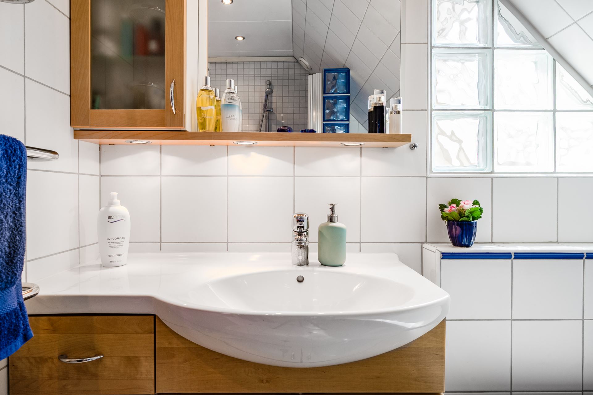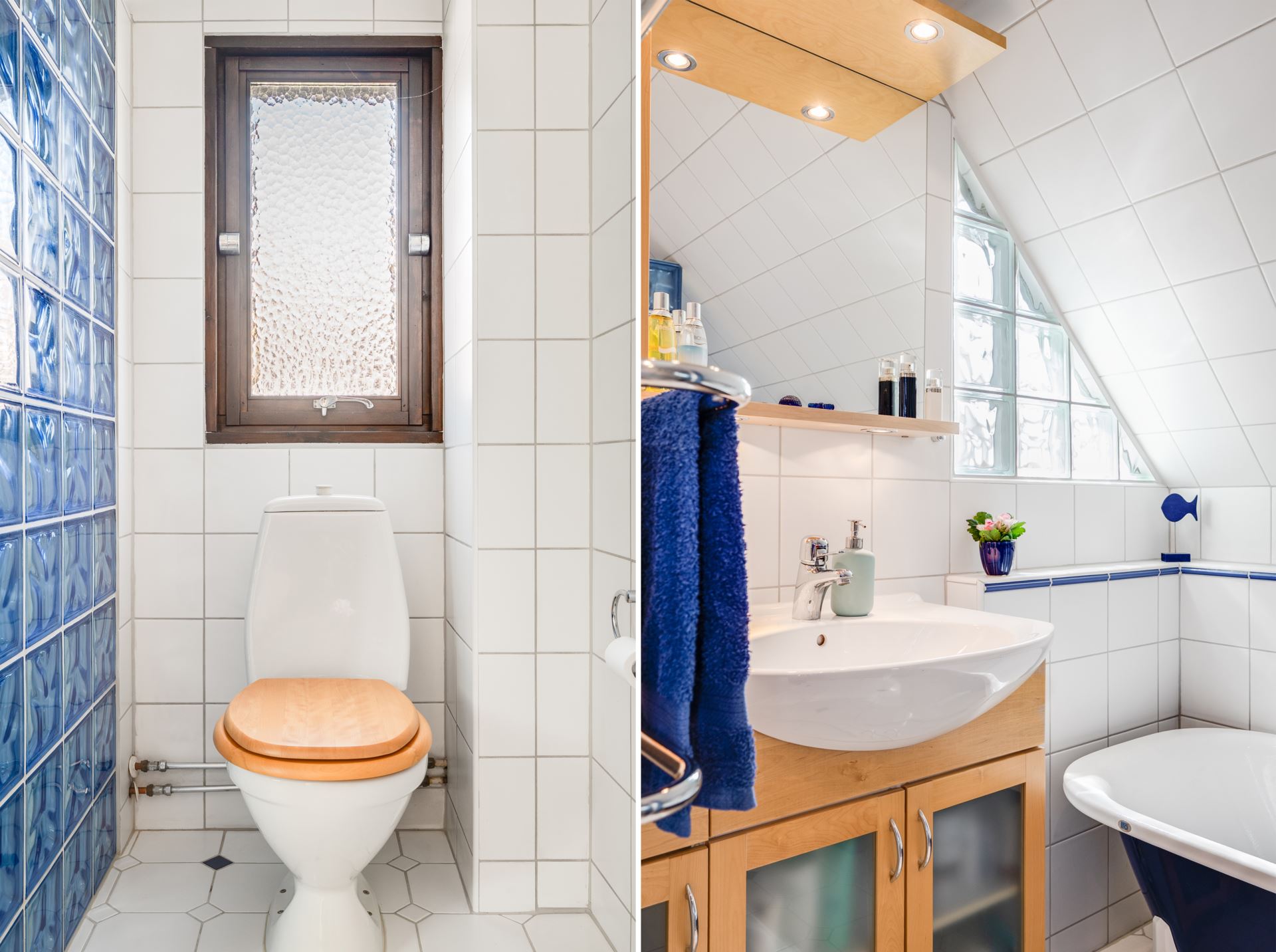 Smakfullt inrett badrum med vitt kakel, blå detaljer och generösa ytor. Här finns både duschhörna med glasbetongvägg och ett charmigt badkar med lejontassar. Stort tvättställ med kommod, spegelskåp och belysning. För extra komfort är badrummet utrustat med golvvärme och handdukstork.