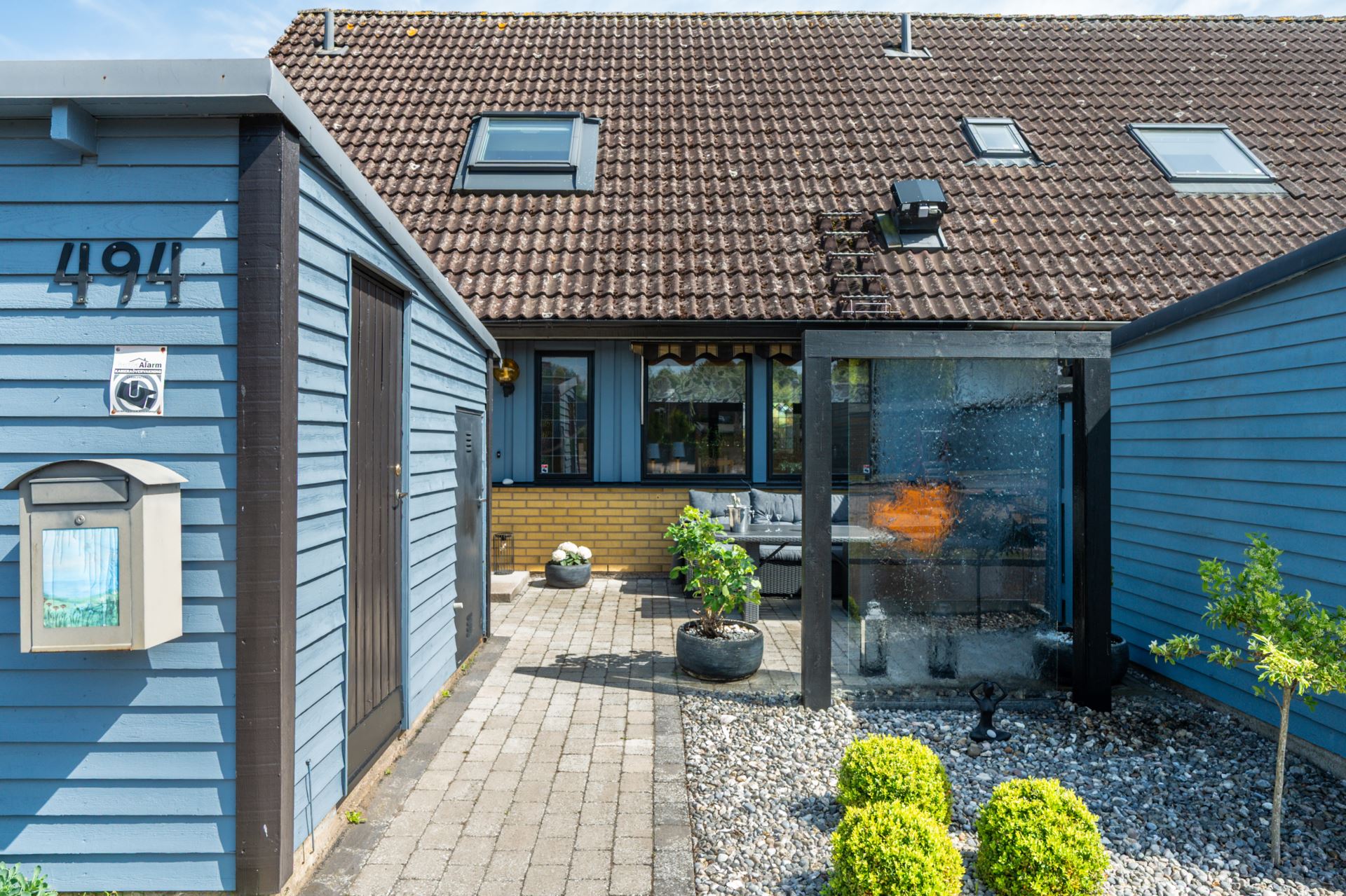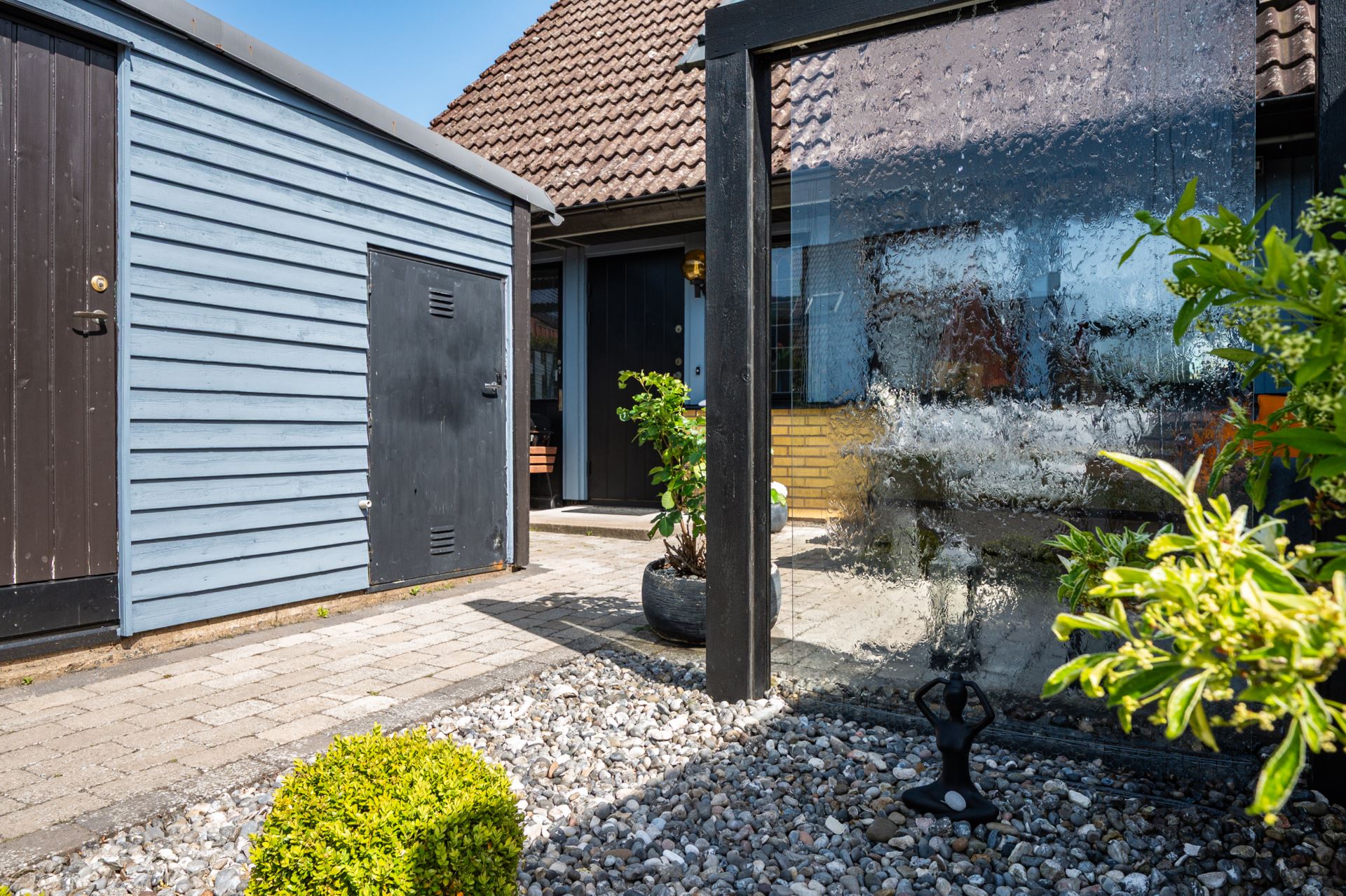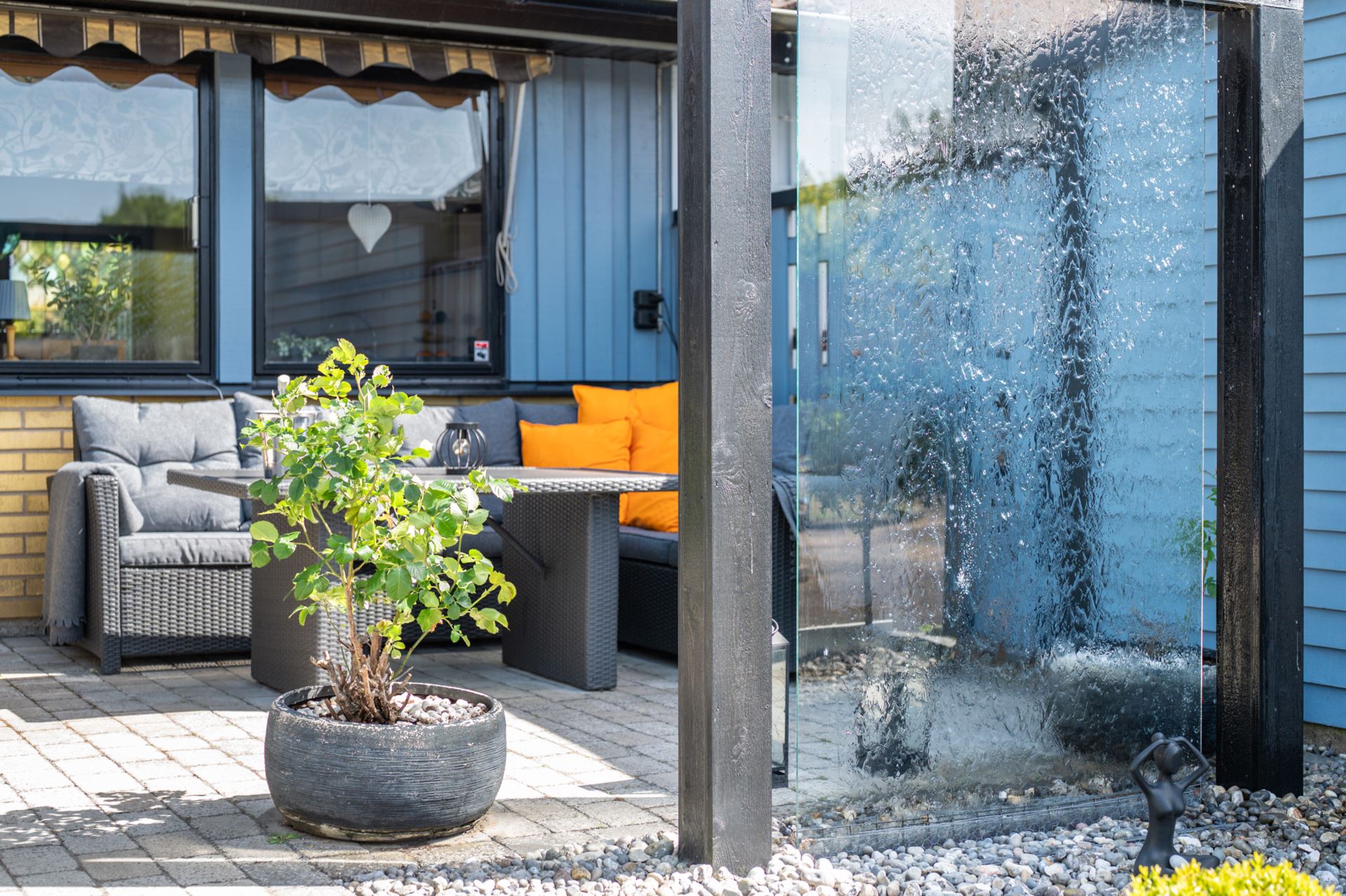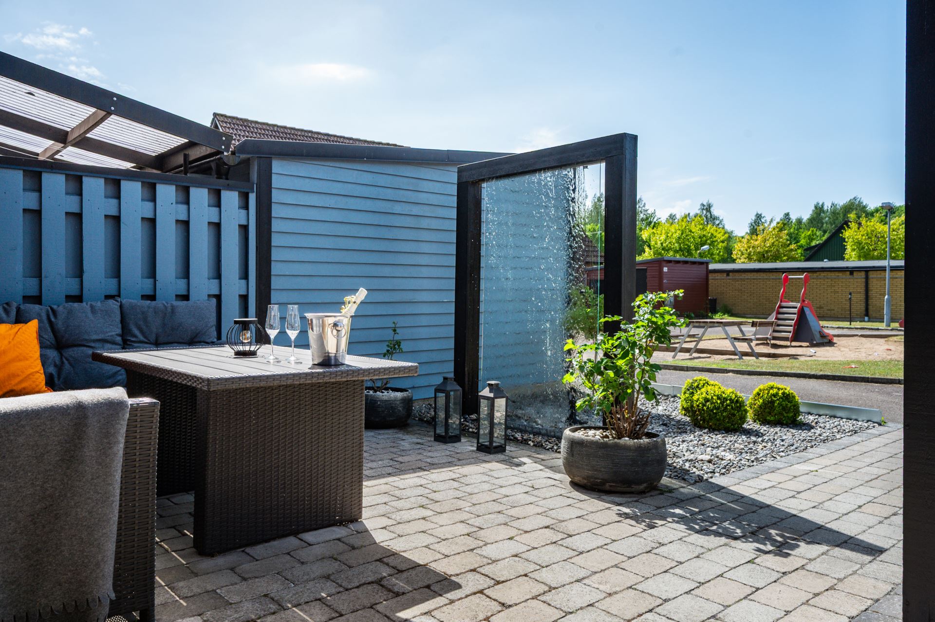Framsidan bjuder på en genomtänkt och inbjudande loungeyta med vattenvägg som skapar ett behagligt och avskilt uterumskänsla. Här finns plats för utemöbler, grill och njutbara stunder i eftermiddags och kvällssolen. Platsen ramas in av planteringar och staket som ger både insynsskydd och trivsel.