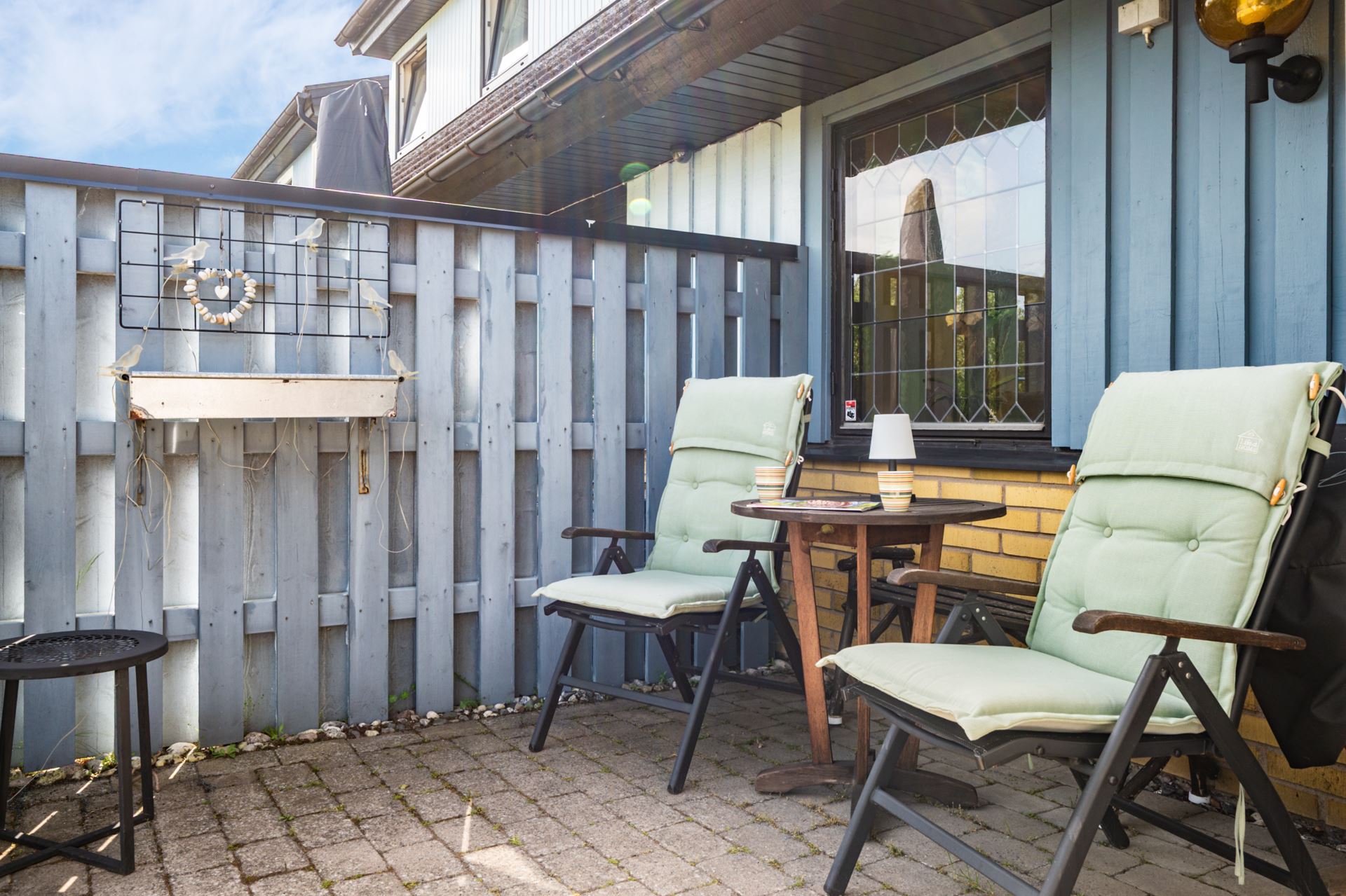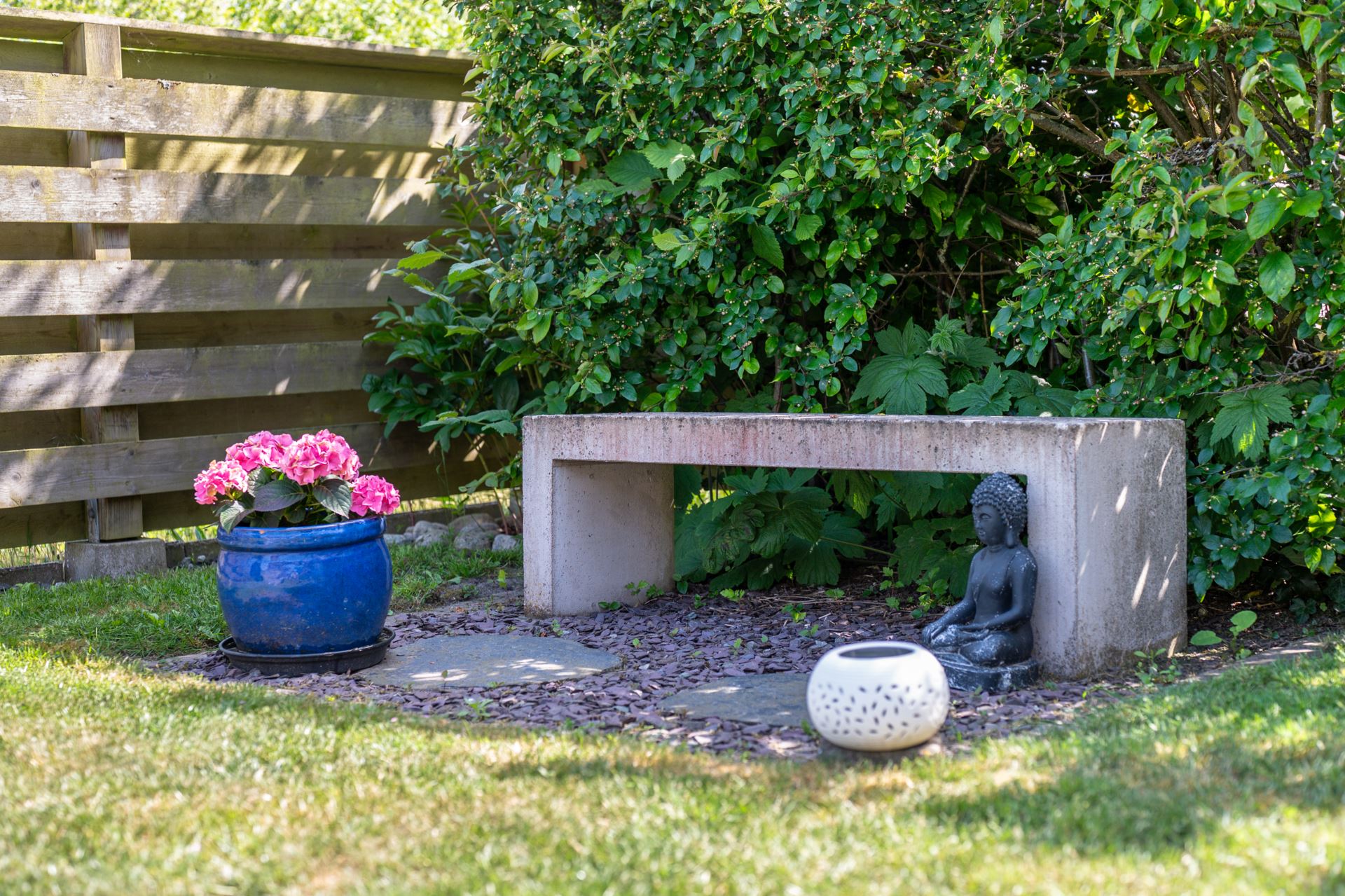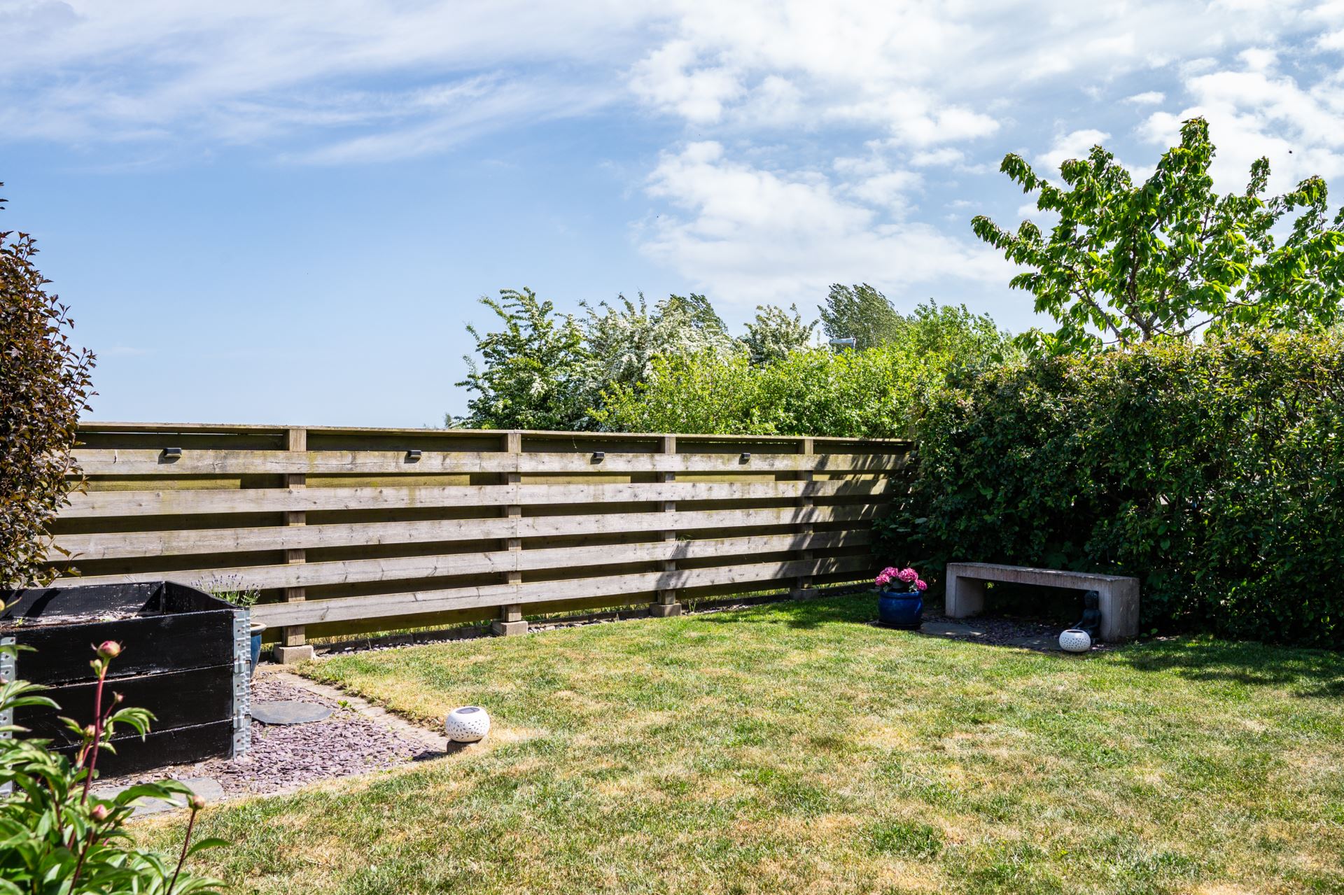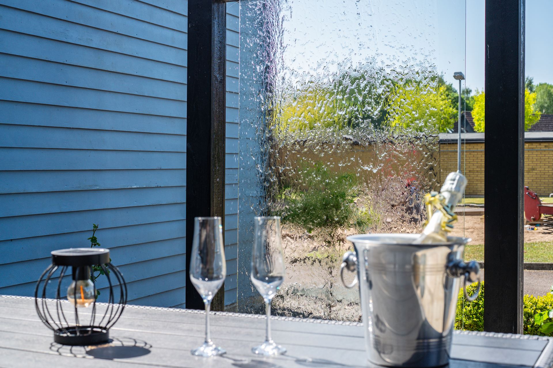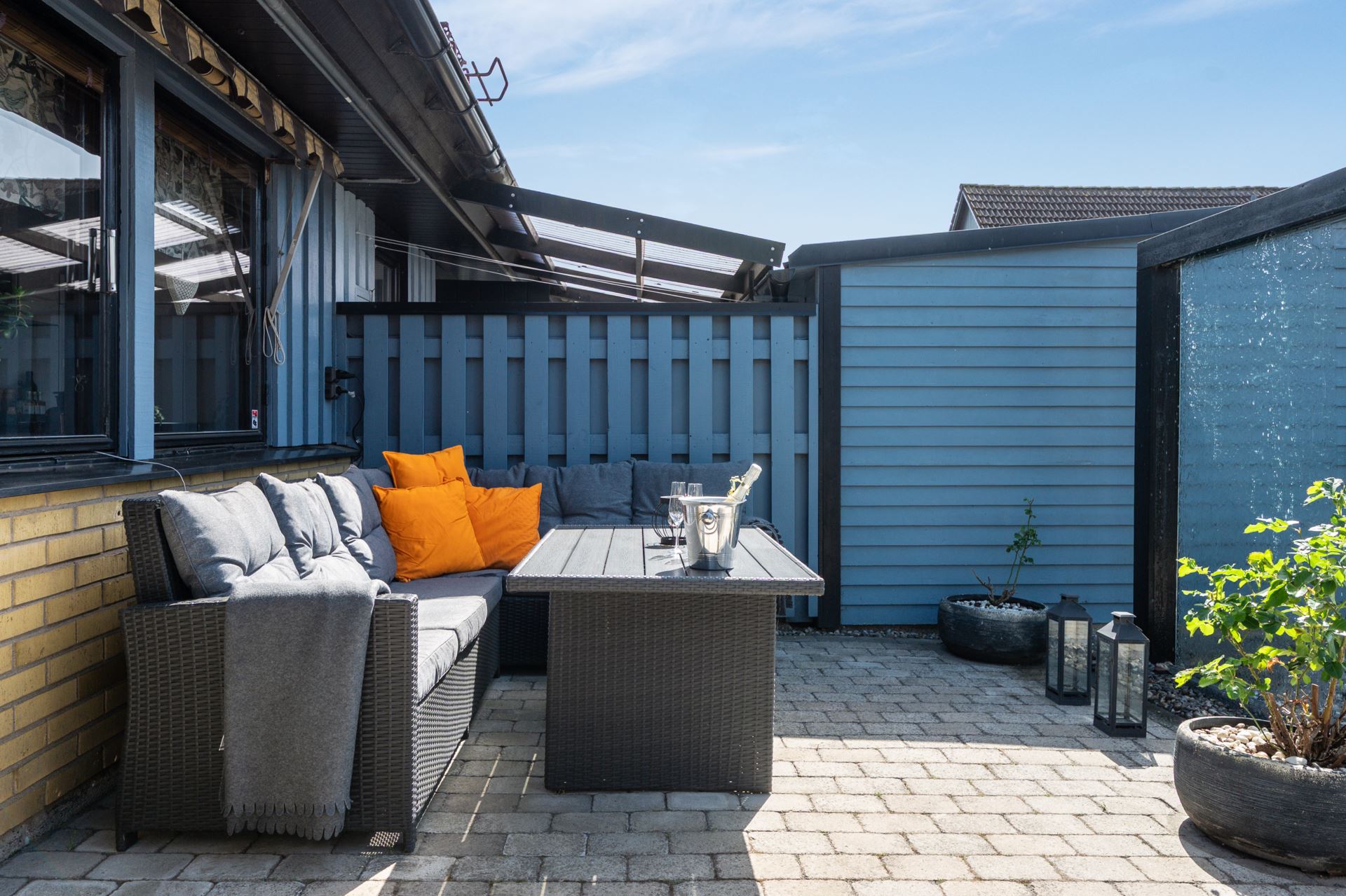 Framsidan bjuder på en genomtänkt och inbjudande loungeyta med vattenvägg som skapar ett behagligt och avskilt uterumskänsla. Här finns plats för utemöbler, grill och njutbara stunder i eftermiddags och kvällssolen. Platsen ramas in av planteringar och staket som ger både insynsskydd och trivsel.
