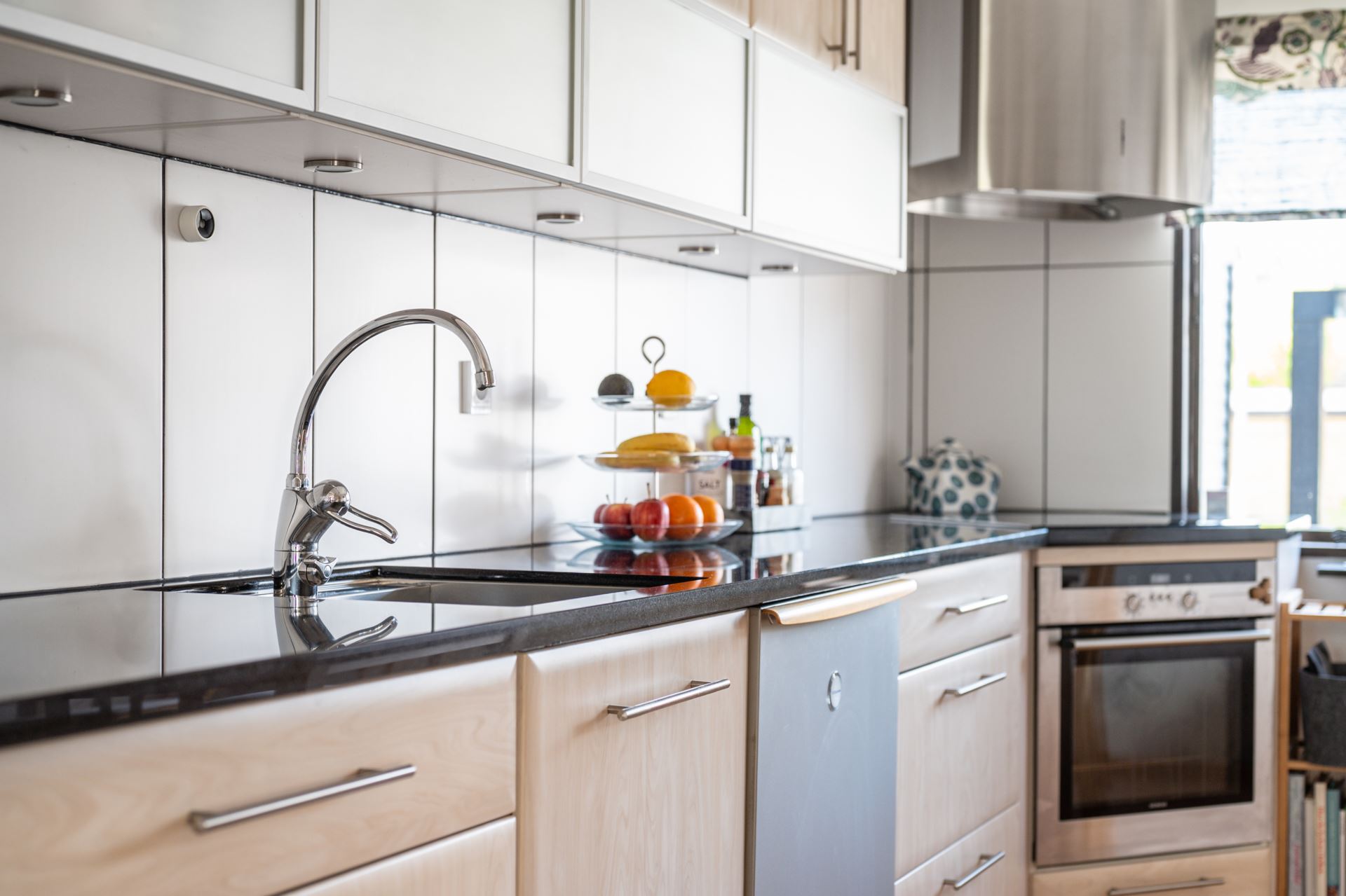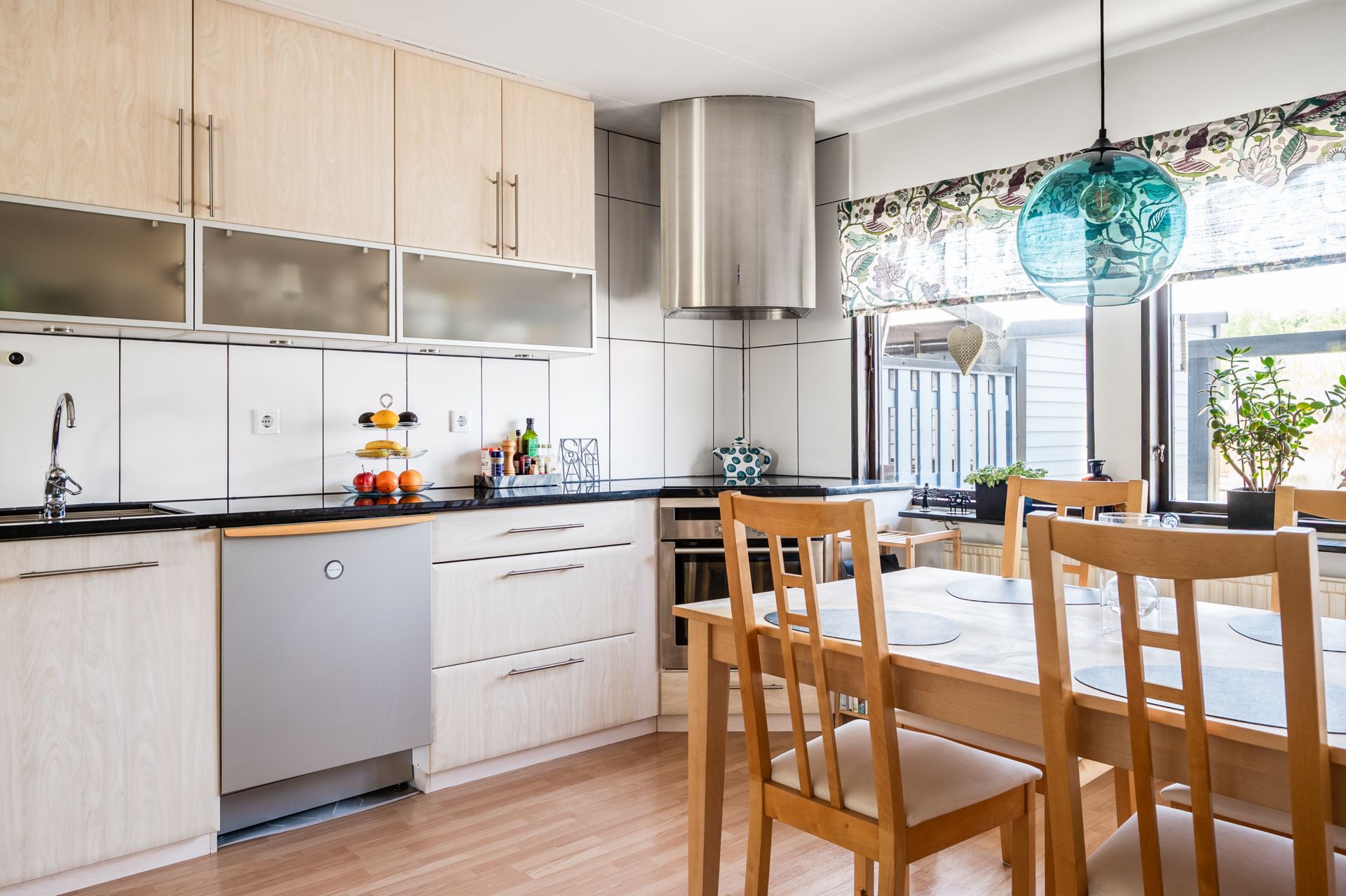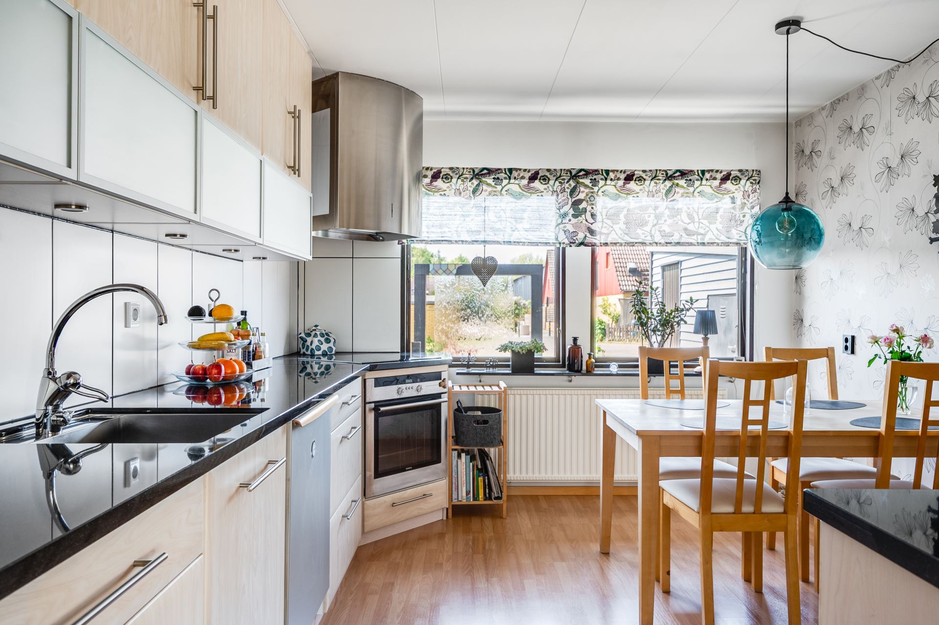 Modernt och trivsamt kök från Kvik (2017) med luckor i björkträ, svart granitbänkskiva och matchande vitvaror i rostfritt. Gott om arbetsyta och skåpförvaring samt en naturlig plats för matbord vid fönsterparti mot framsidan.