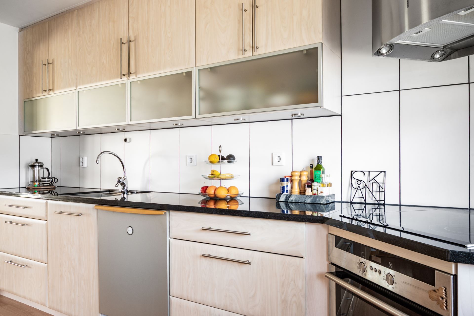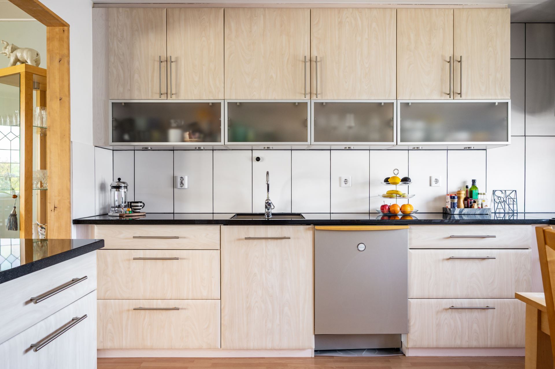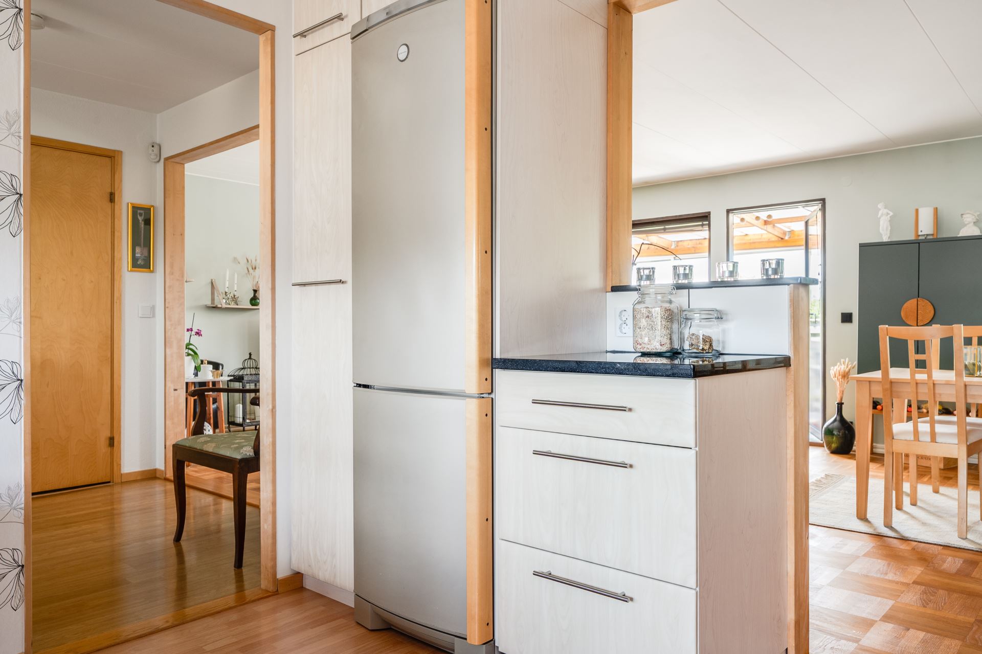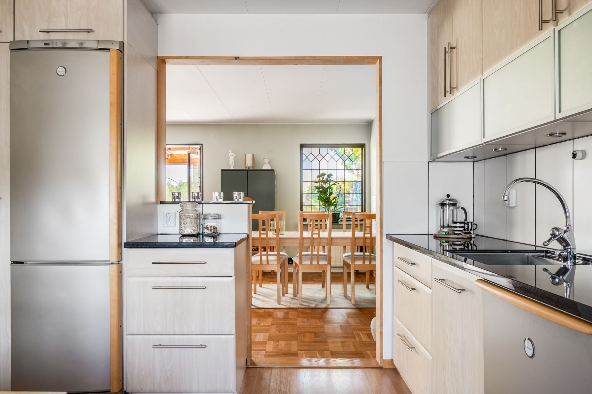 Modernt och trivsamt kök från Kvik (2017) med luckor i björkträ, svart granitbänkskiva och matchande vitvaror i rostfritt. Gott om arbetsyta och skåpförvaring samt en naturlig plats för matbord vid fönsterparti mot framsidan.