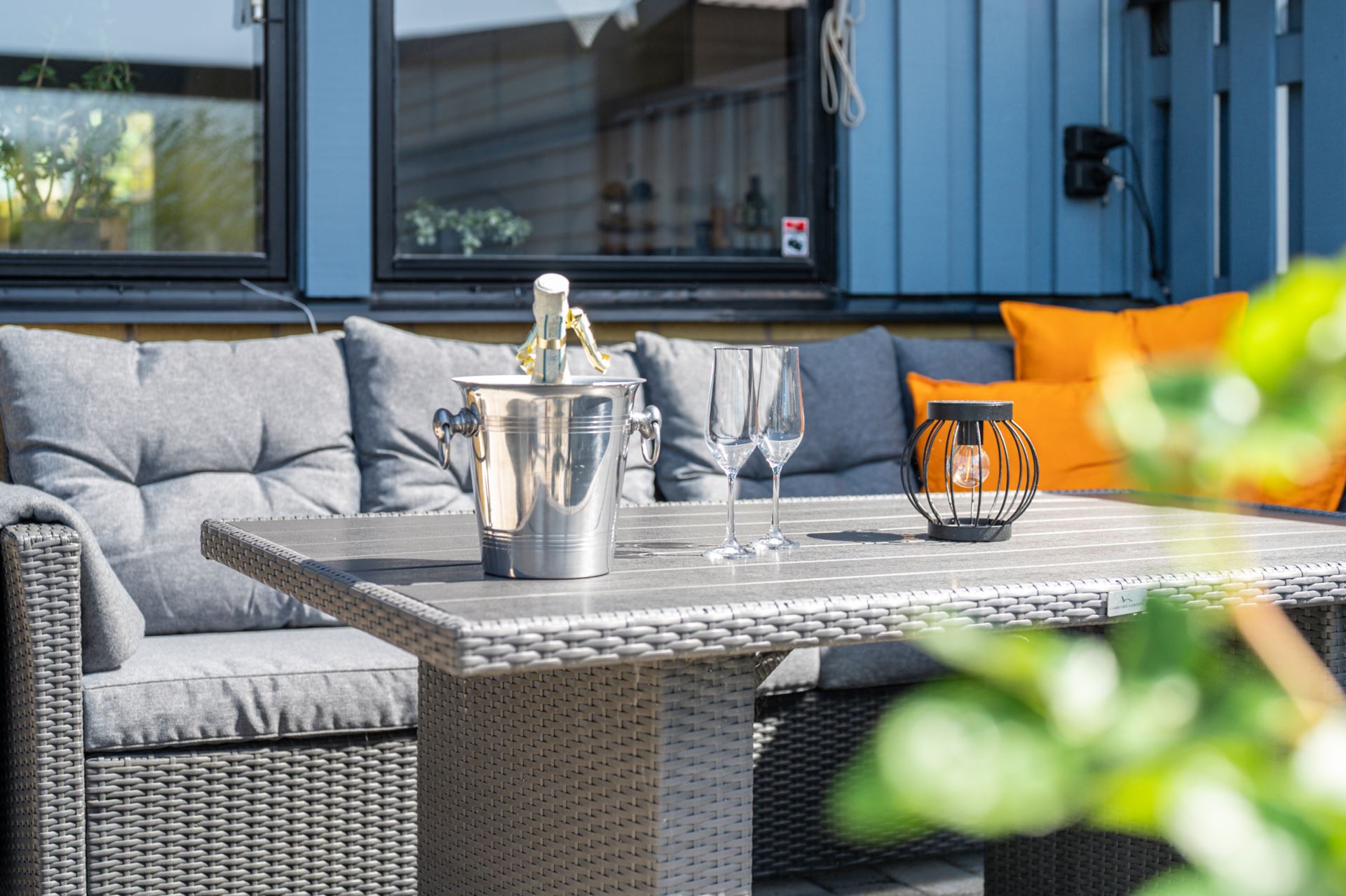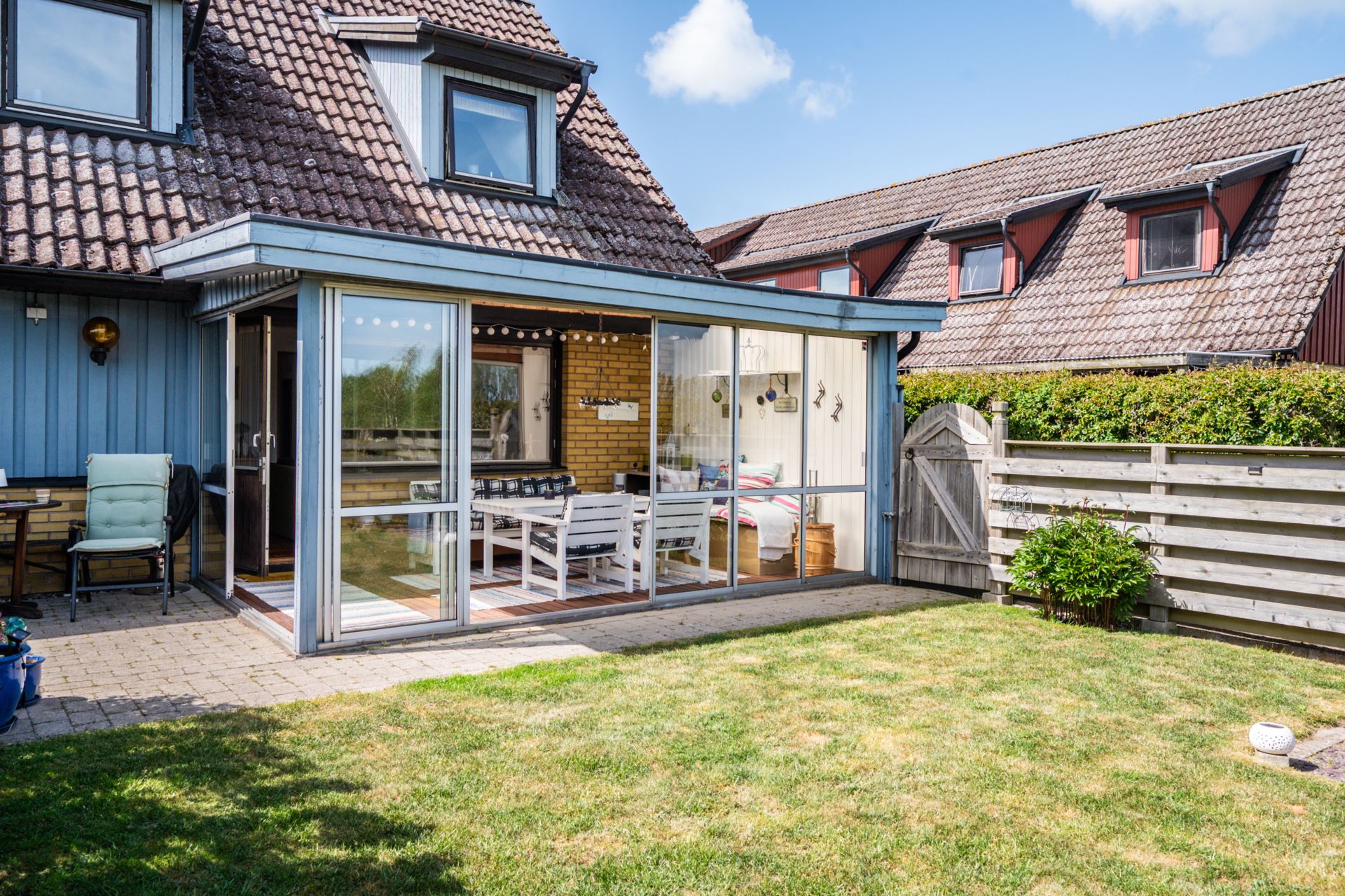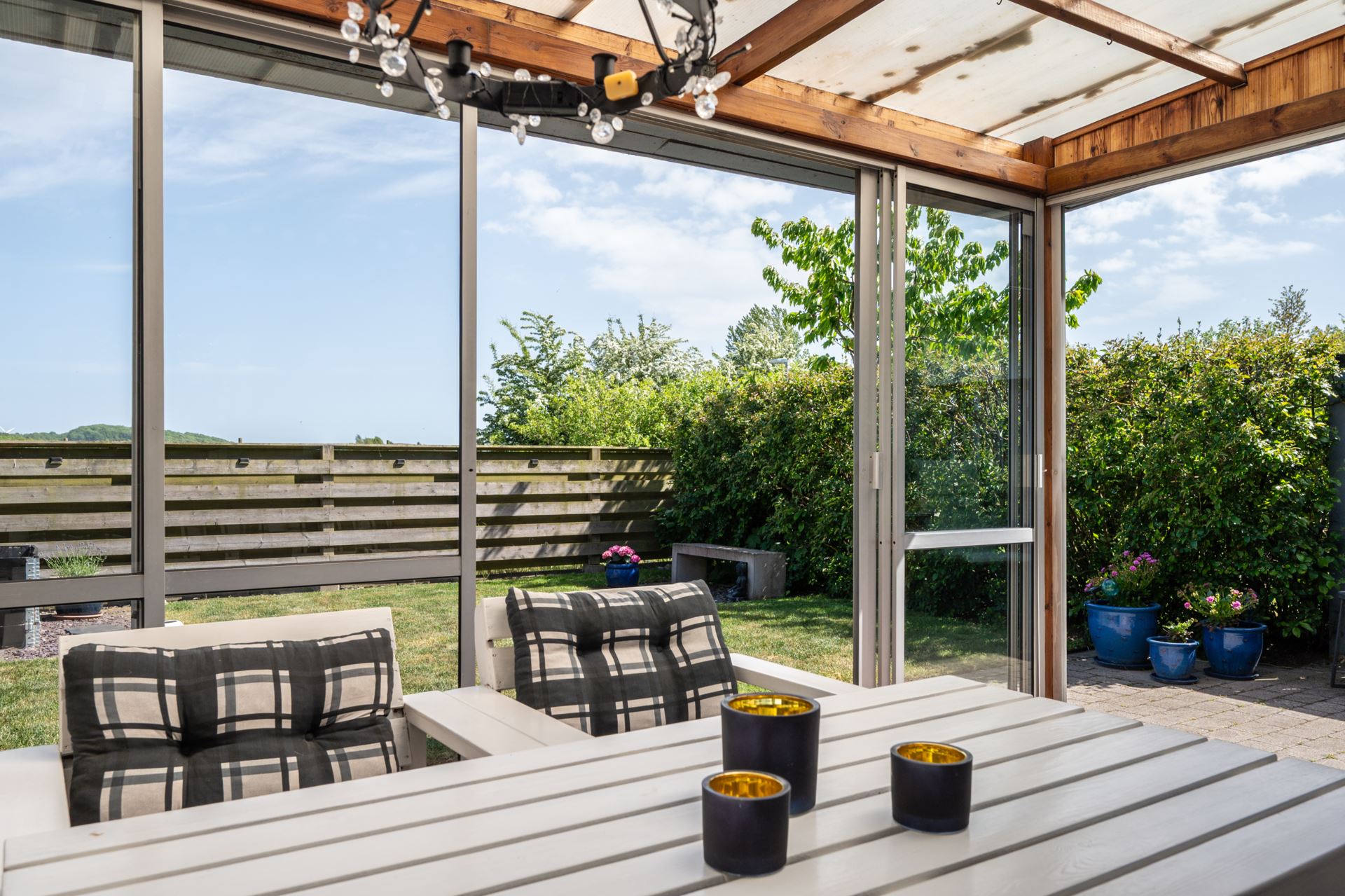 Baksidan är en riktig pärla med en öppen trädgård i fritt och soligt läge. Det inglasade uterummet förlänger säsongen och blir ett naturligt extra vardagsrum. Med plats för både matbord och loungemöbler blir detta snabbt favoritplatsen från vår till sen höst. Trädgården är lättskött och vetter mot det öppna landskapet med fri sikt över natur, kullar och golfbana. En utsikt som verkligen sätter guldkant på tillvaron.