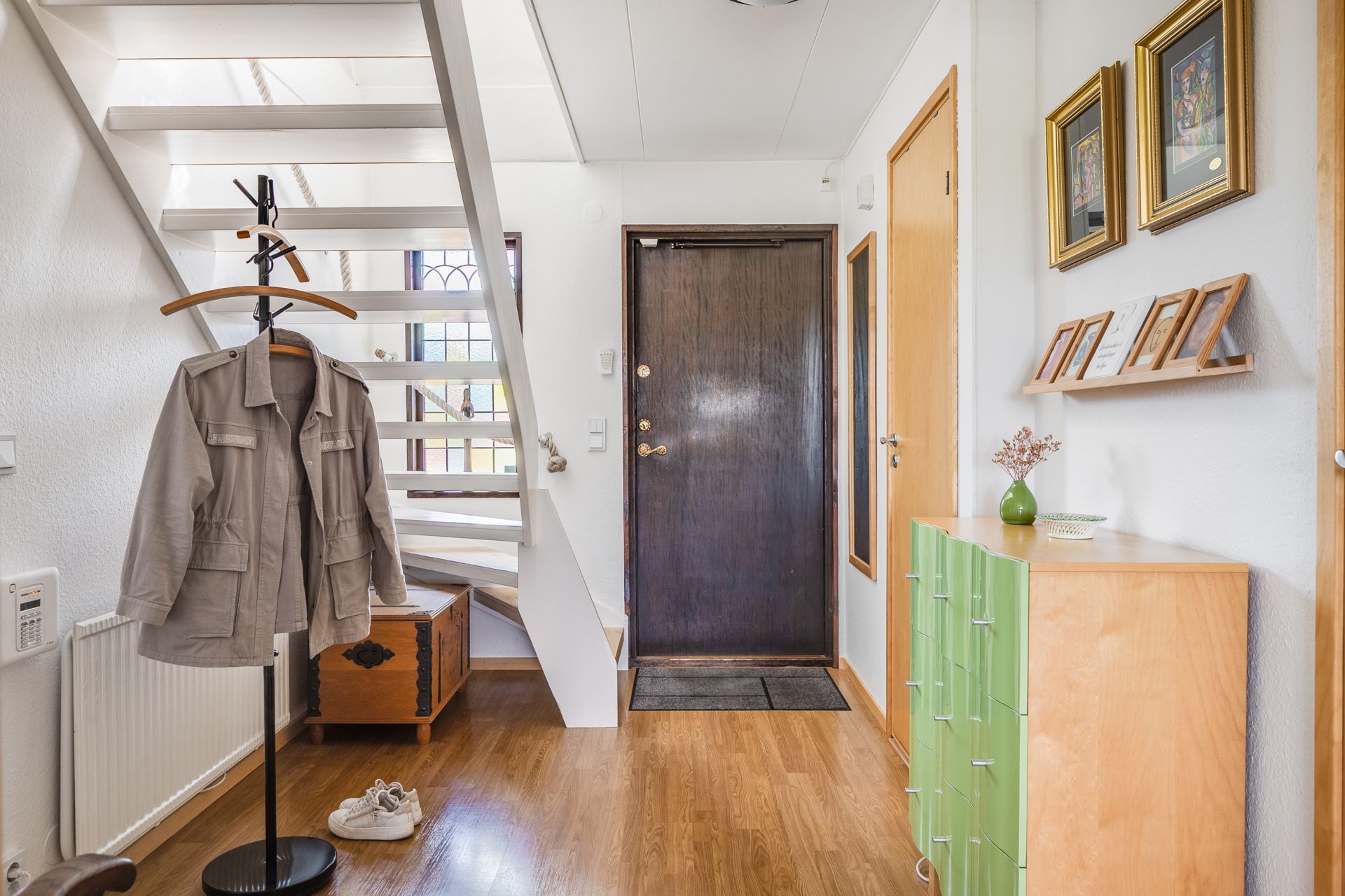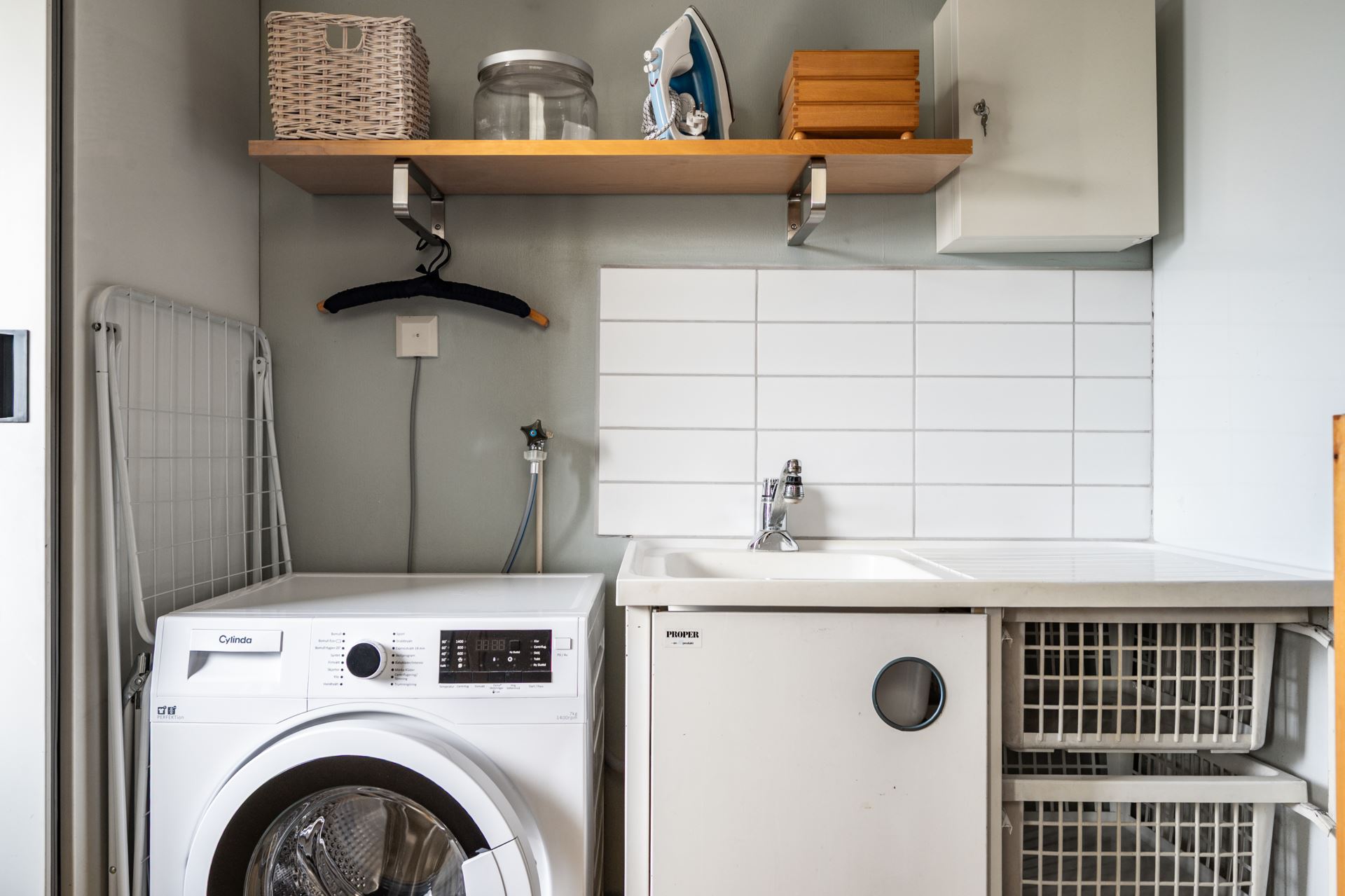 Praktisk tvättdel med tvättmaskin, grovtvättho och förvaring. Här finns plats för både tvätt och klädvård. Praktisk groventré mot framsidan.