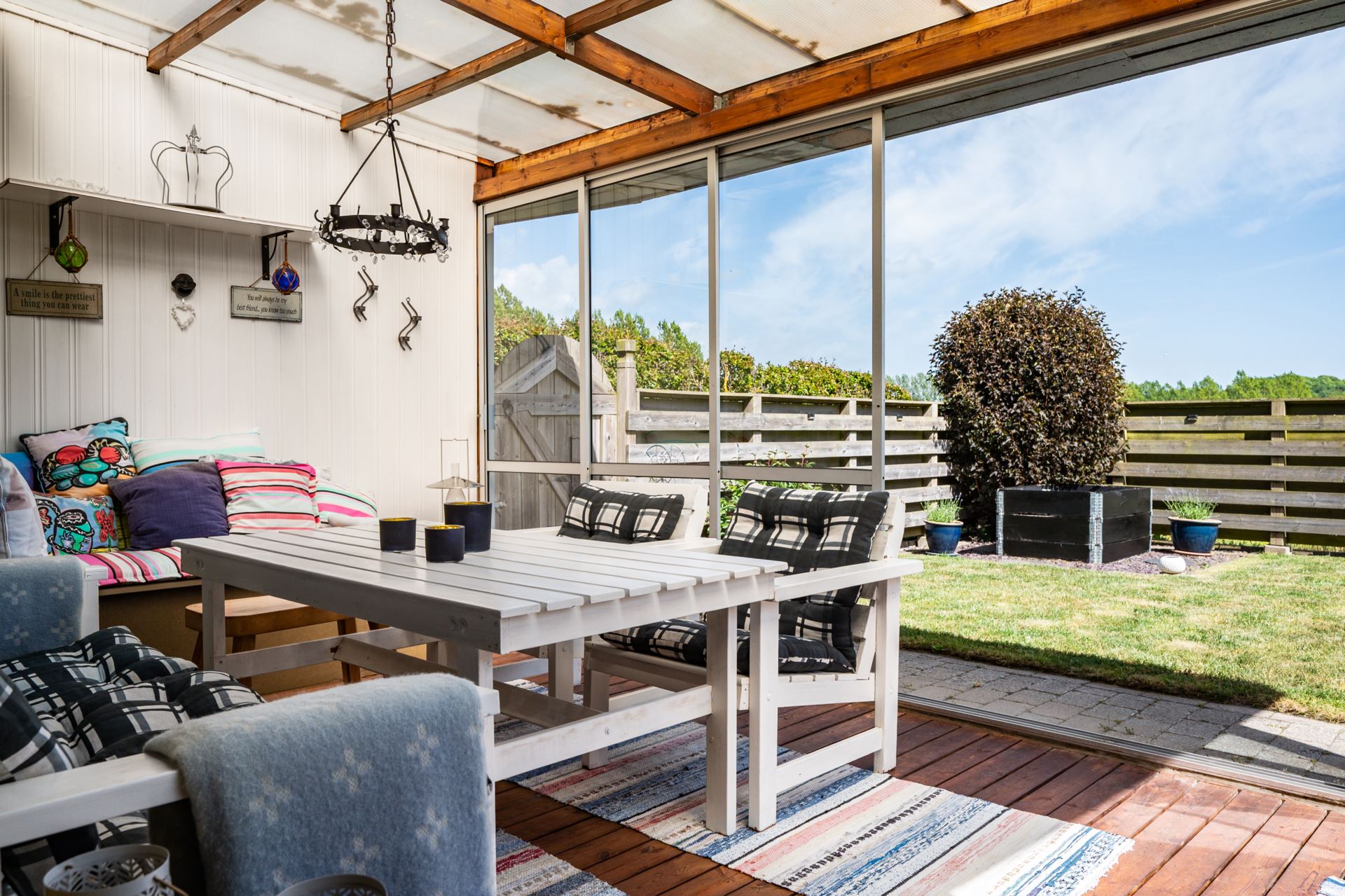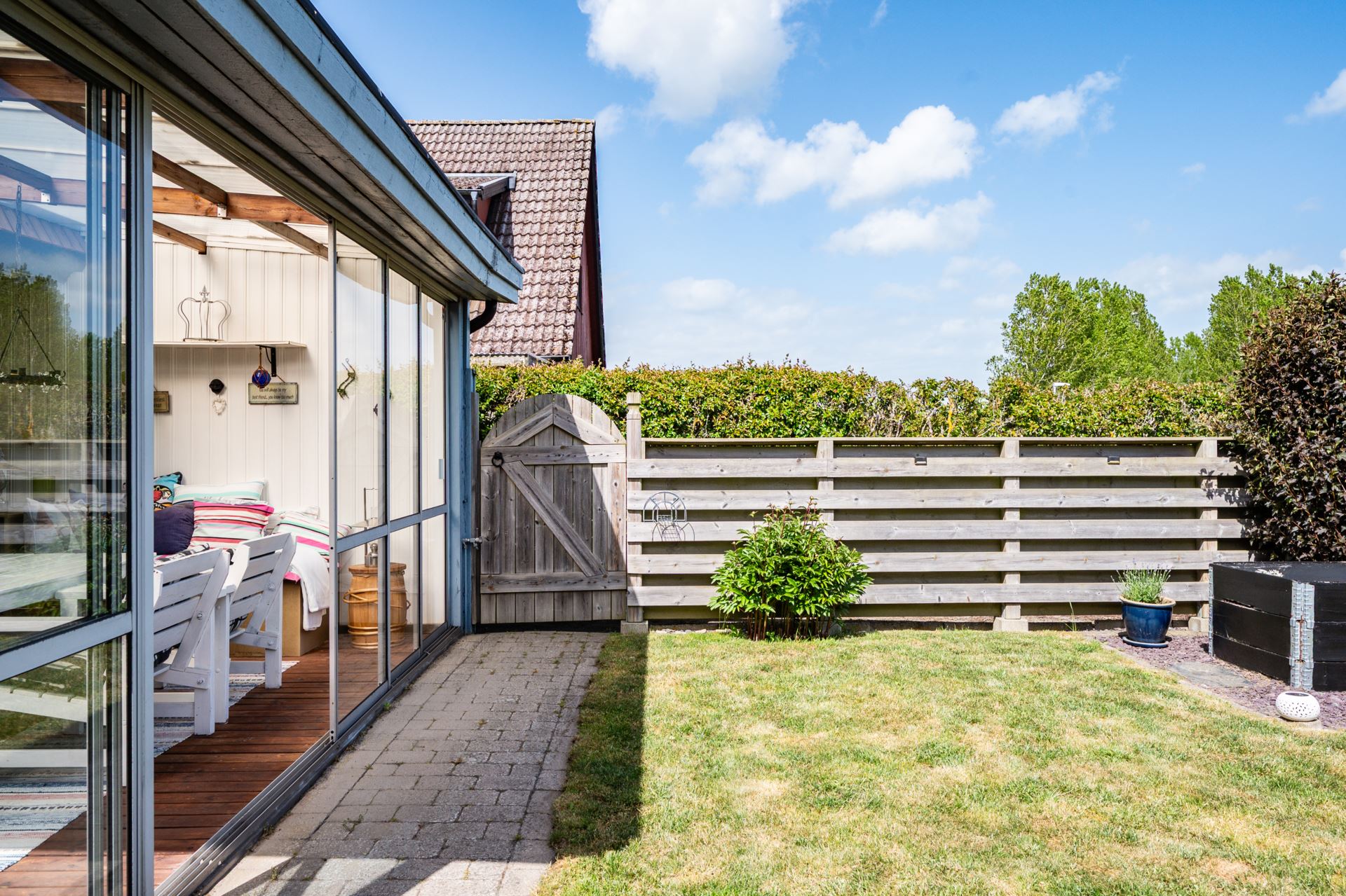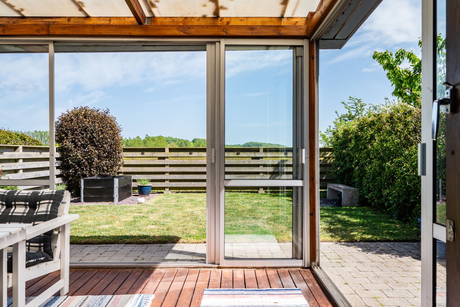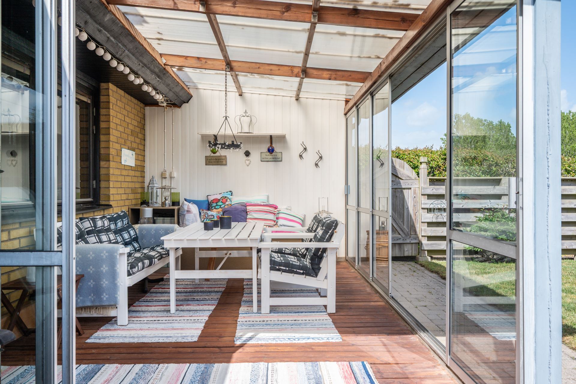 Det inglasade uterummet är en fantastisk förlängning av bostaden och erbjuder ett härligt ljusinsläpp och skyddat läge mot trädgården. Med skjutbara glaspartier och trägolv blir det en flexibel yta som kan nyttjas stora delar av året. För måltider, avkoppling eller umgänge. Härifrån har du direkt access till den privata trädgården och fin utsikt över det gröna omkringliggande landskapet.